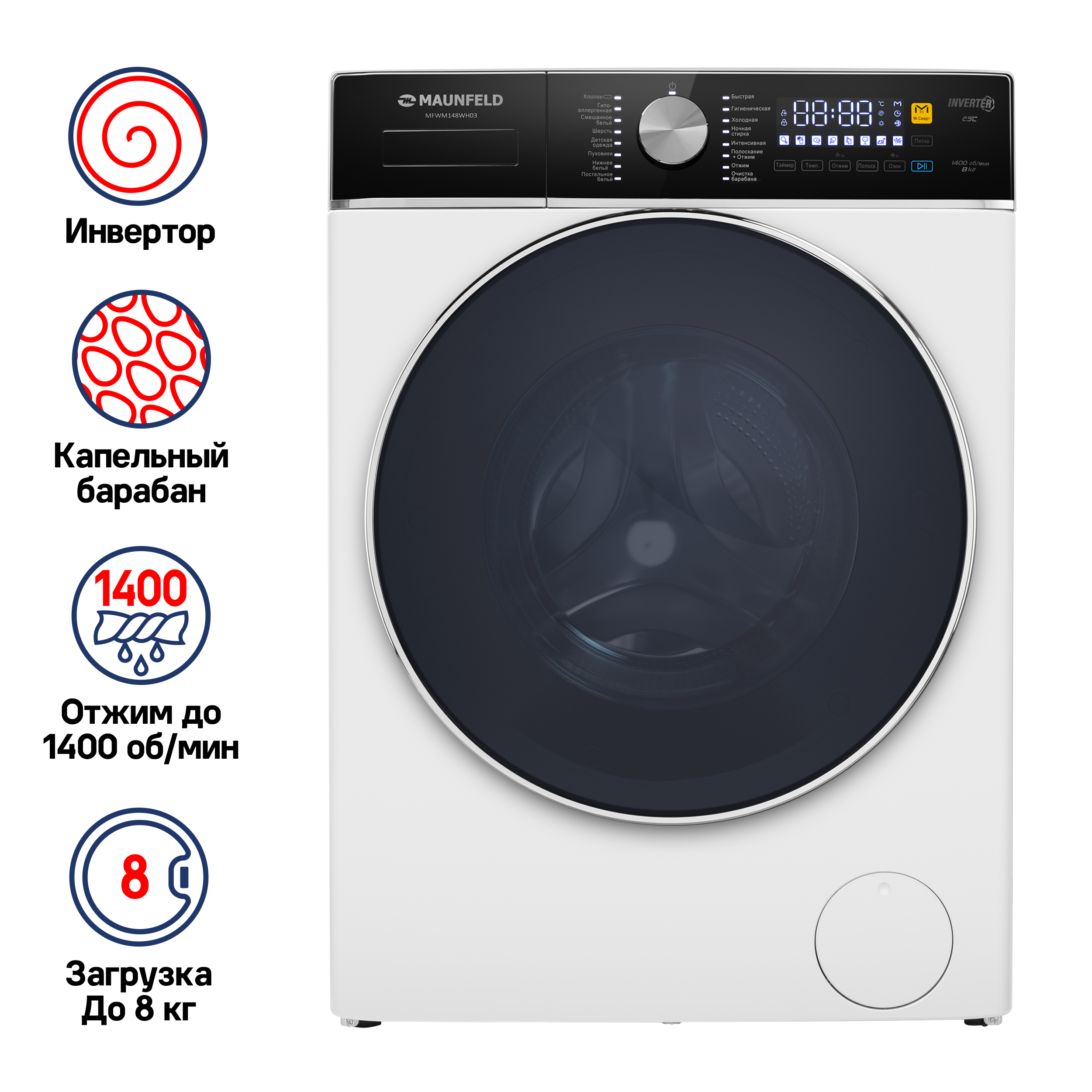 Различные режимы для более эффективной стирки: "М-смарт", "Полоскание", "Температура", "Таймер", "Время", "Отжим".