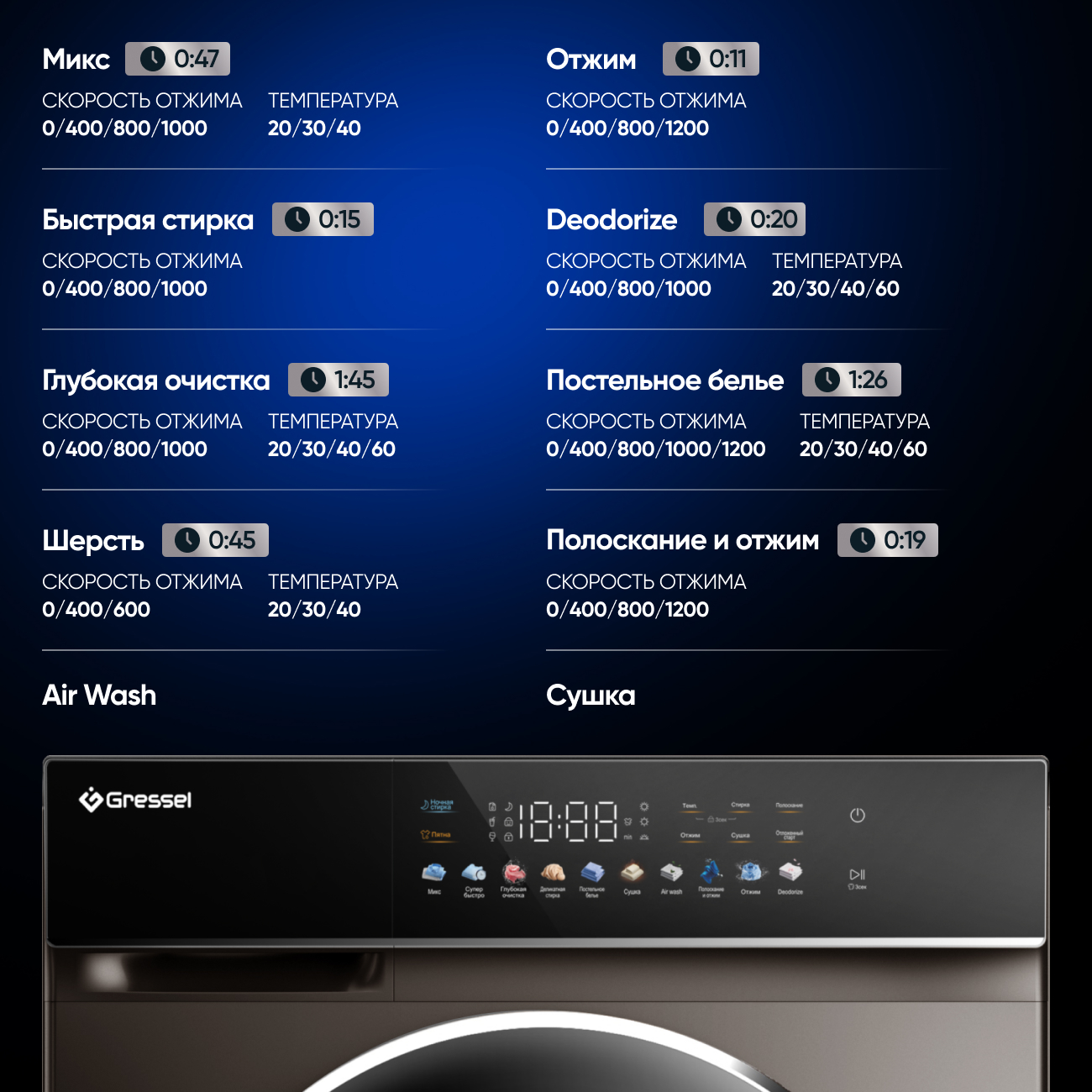 Микс, супер быстрая, постельное бельё, полоскание + отжим, отжим, очистка барабана, полоскание, Air Wash, сушка, пятна, ночной режим, деликатная стирка.