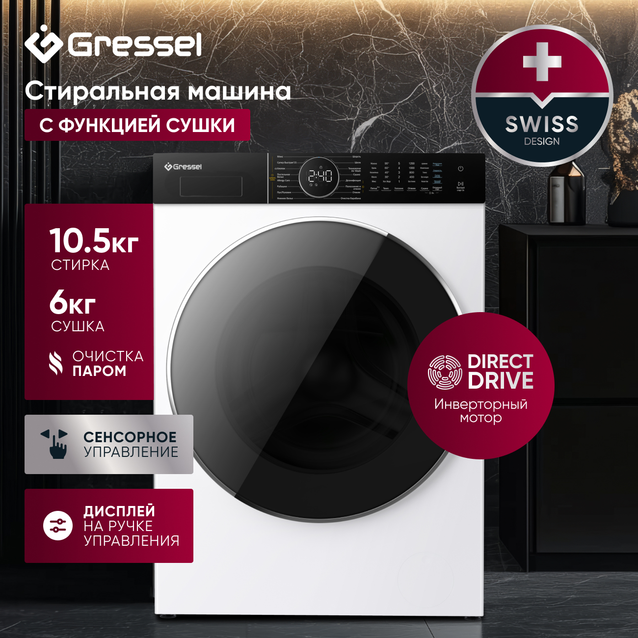 Стиральная машина с сушкой Gressel UWS601 (10,5 кг) с инверторным мотором Direct Drive, функцией пара PureSteam и функцией FlexiLoad дозагрузкой белья