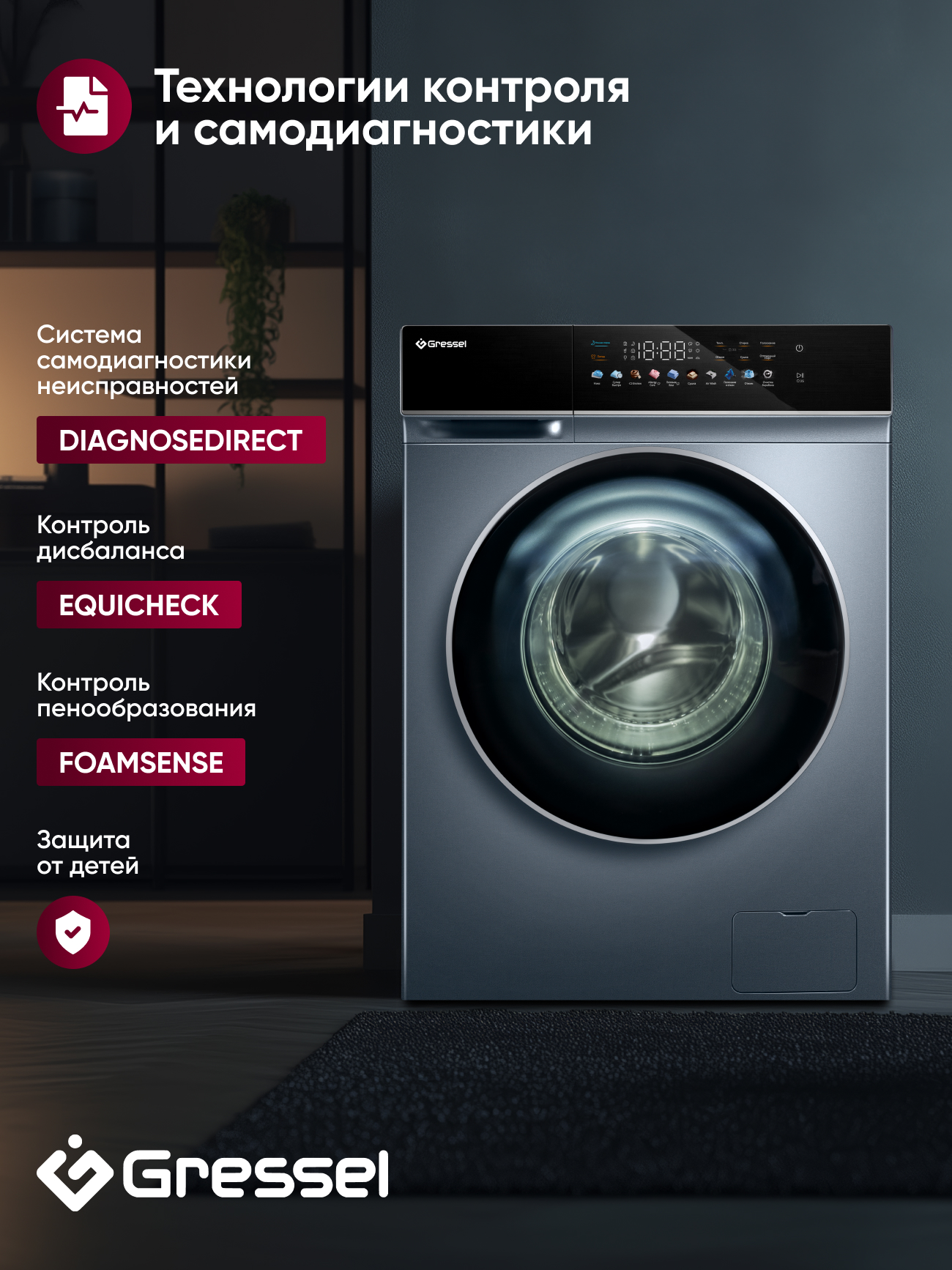 Дополнительные функции, такие как отложенный старт, автоматическая LED подсветка барабана и очистка барабана, делают Gressel UHS603 одним из самых продвинутых устройств на рынке. Система самодиагностики DiagnoseDirect, контроль дисбаланса EquiCheck и контроль пенообразования FoamSense усиливают безопасность и надежность устройства.