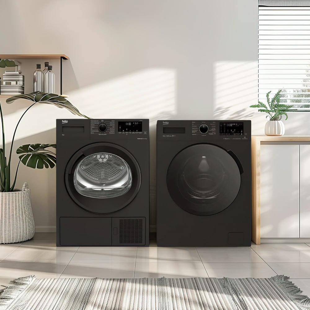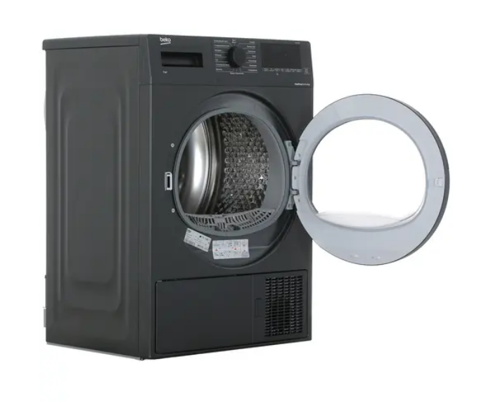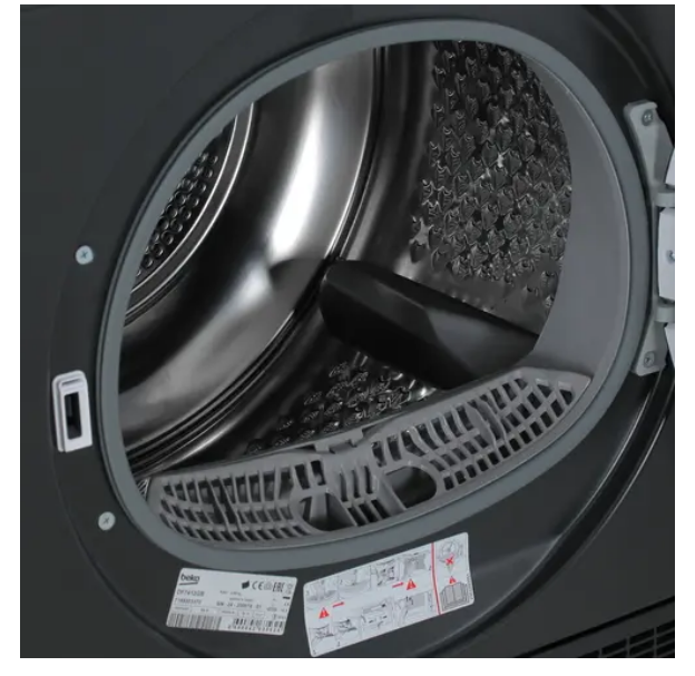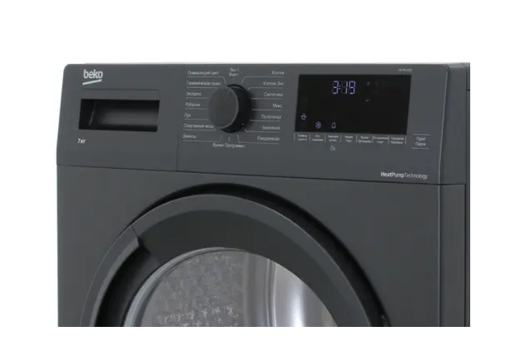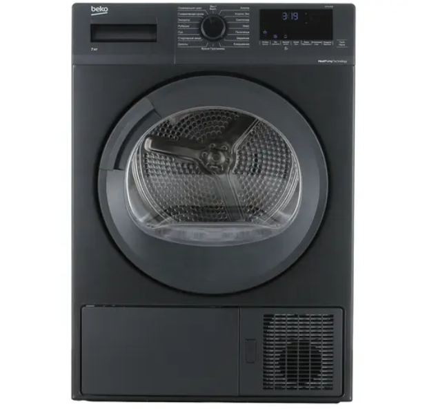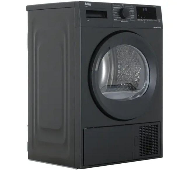 Сушильная машина Beko DF7412GB представлена в черном корпусе с барабаном на 7 кг и тепловым насосом. На передней панели есть поворотный механизм, сенсорные кнопки и дисплей с визуальными индикаторами. Вы можете использовать 15 программ сушки разных типов ткани и дополнительные функции, блокировать управление от детей. Подсветка барабана удобна для изъятия и сортировки мелких предметов одежды.