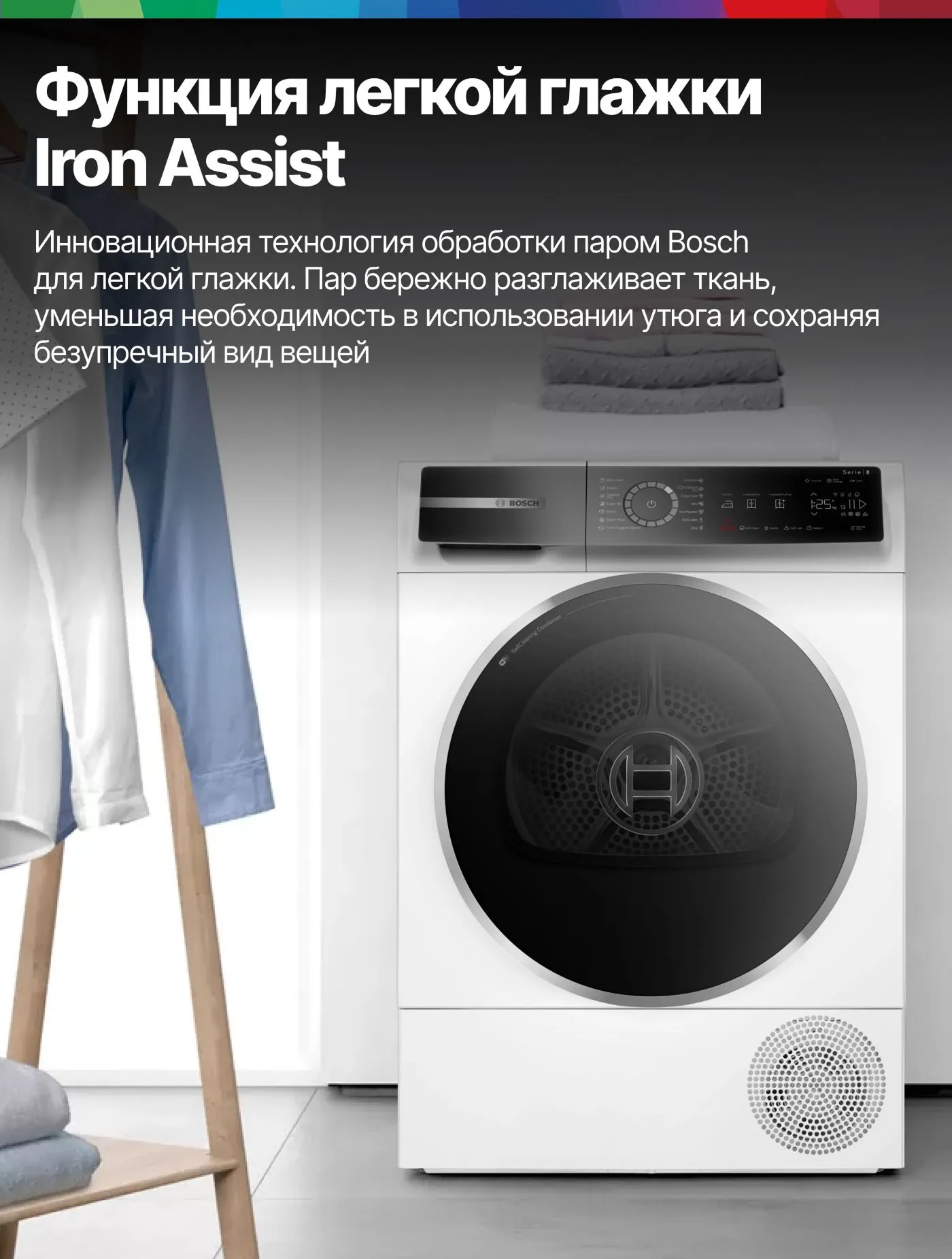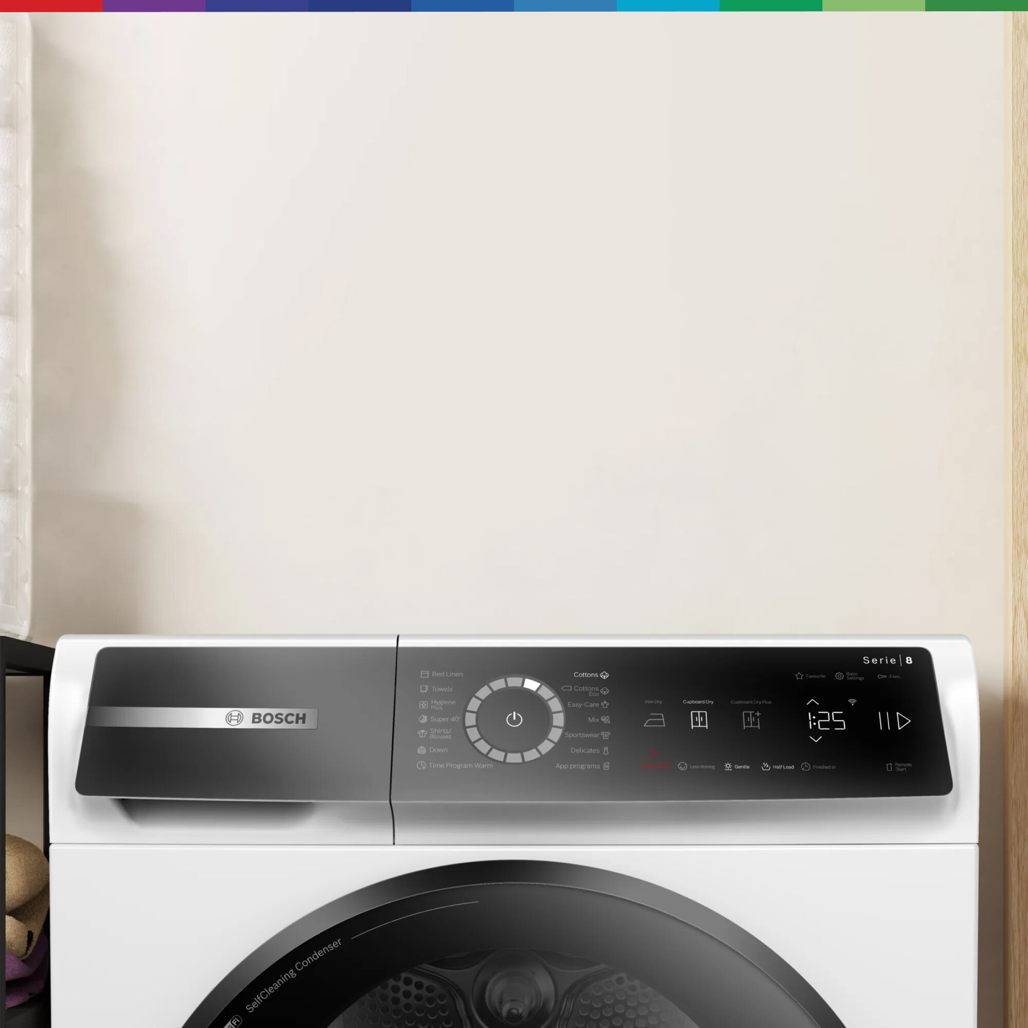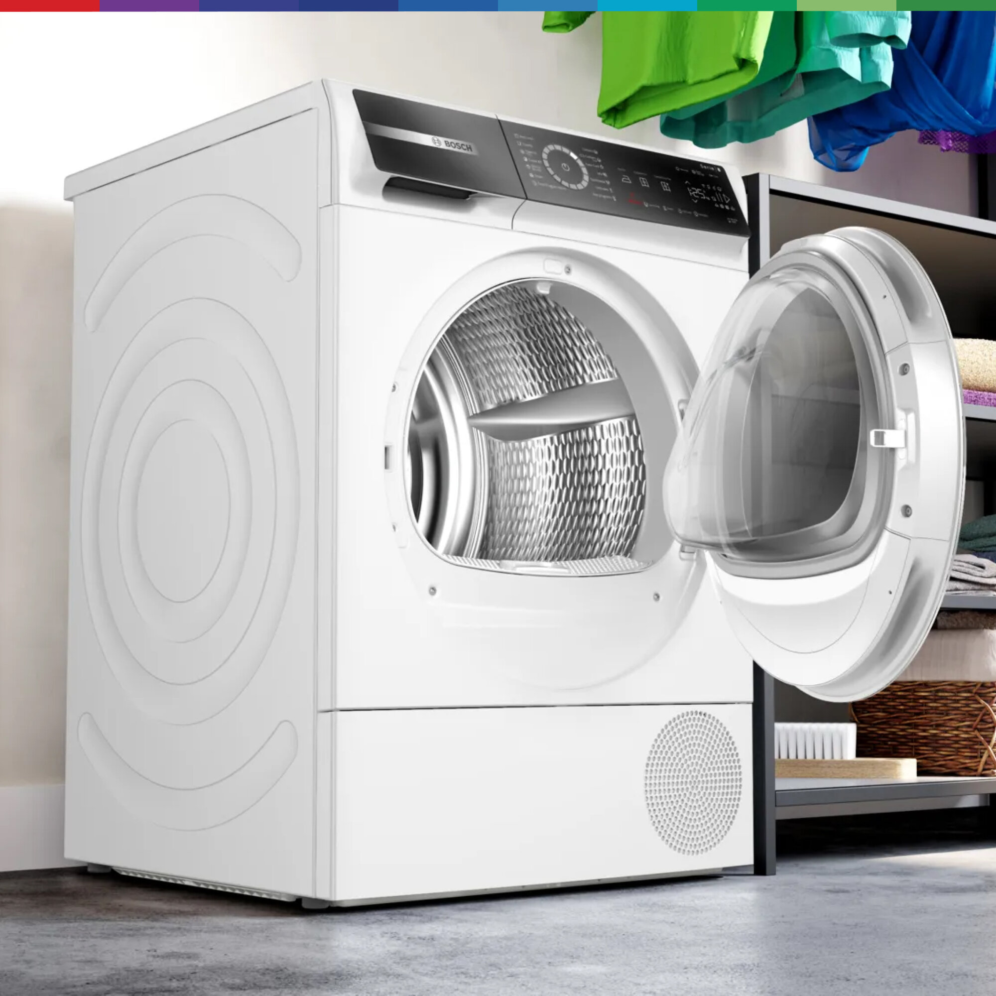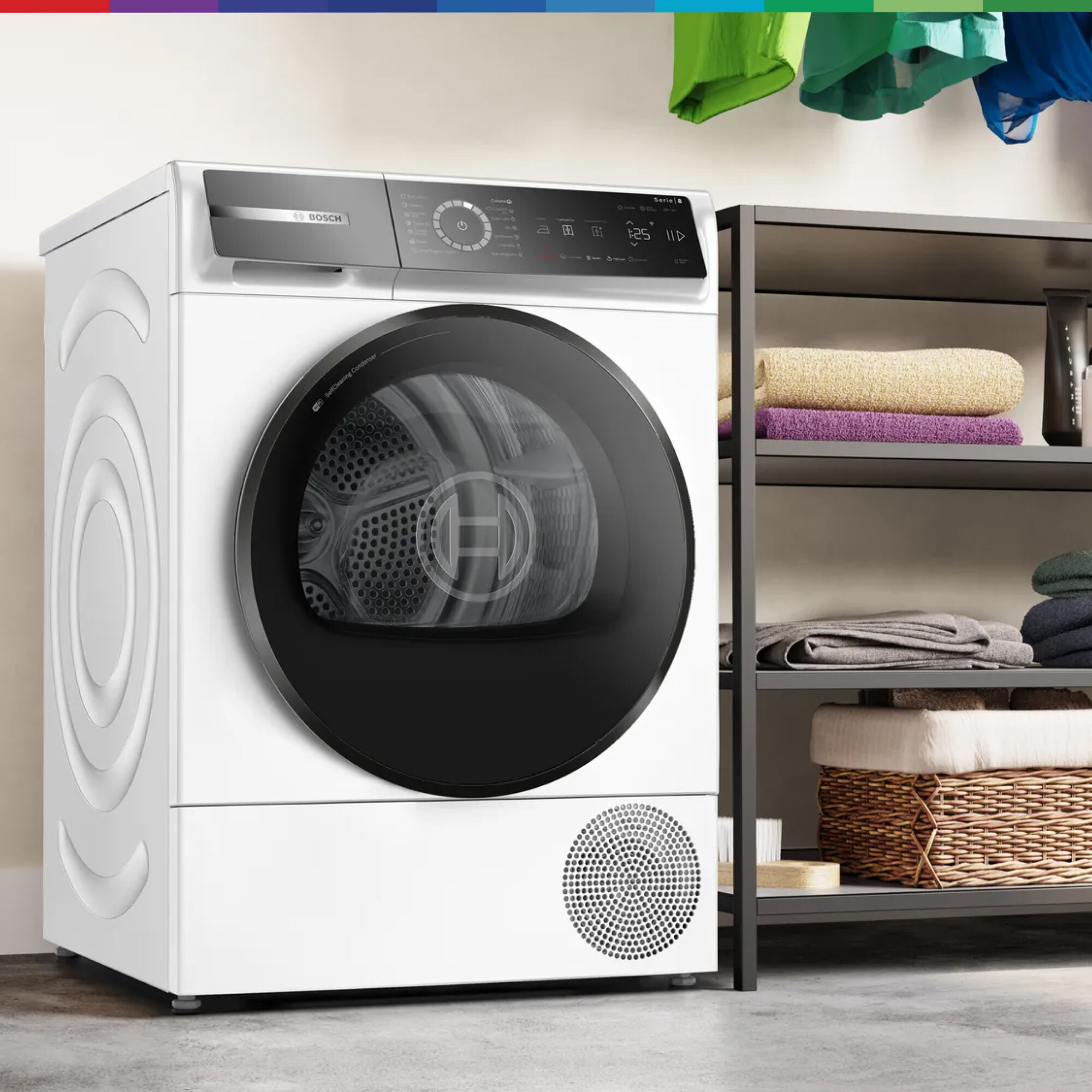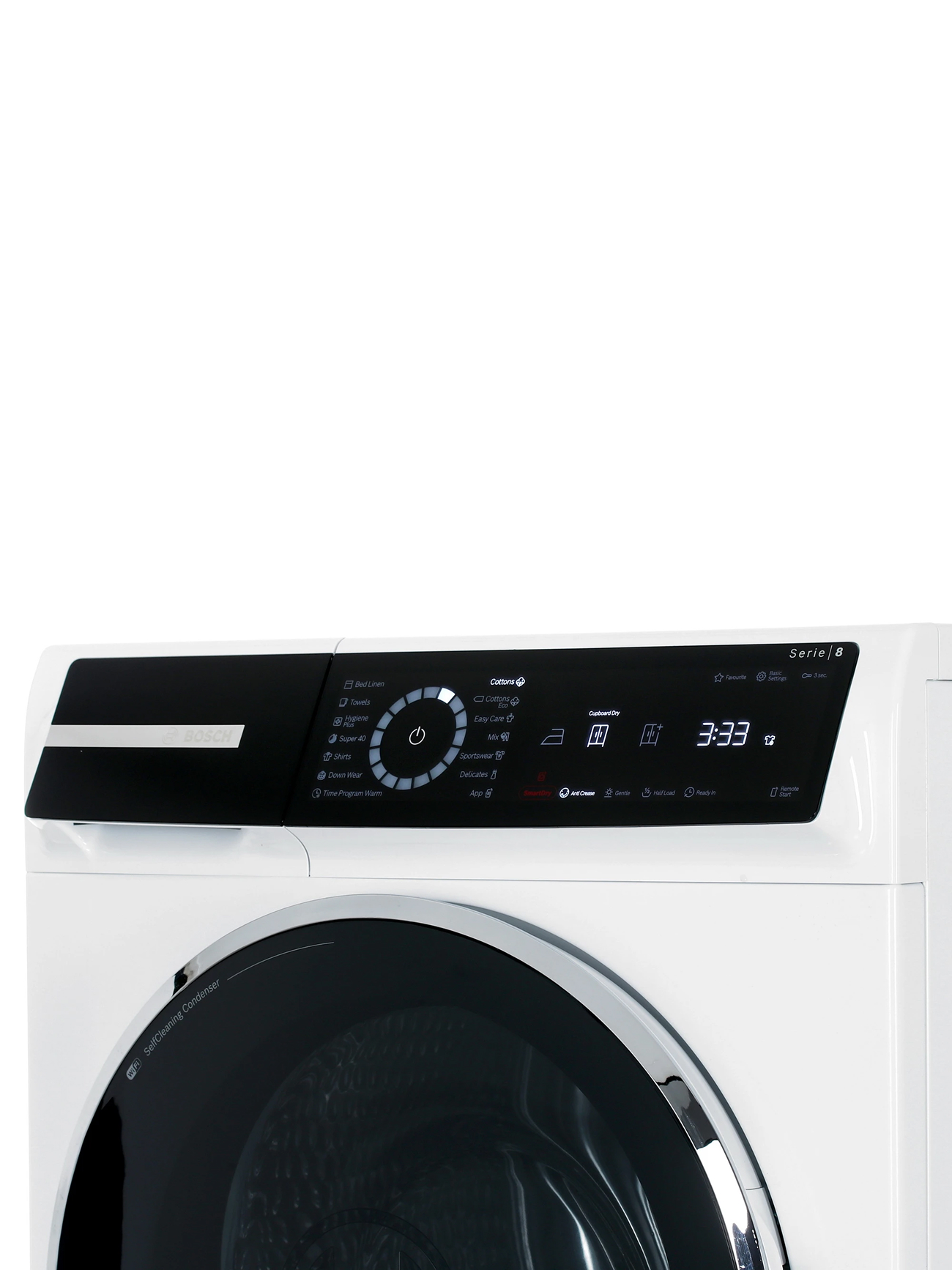 Кроме того, предусмотрена возможность отвода конденсата в канализацию и функция самоочищающегося конденсатора. Сушильная машина Bosch WQB245B0ME оборудована функцией Home Connect (Wi-Fi), что позволяет управлять ею дистанционно с помощью смартфона или планшета. Это устройство обладает высоким классом энергопотребления А+++, что гарантирует его экономическую эффективность.