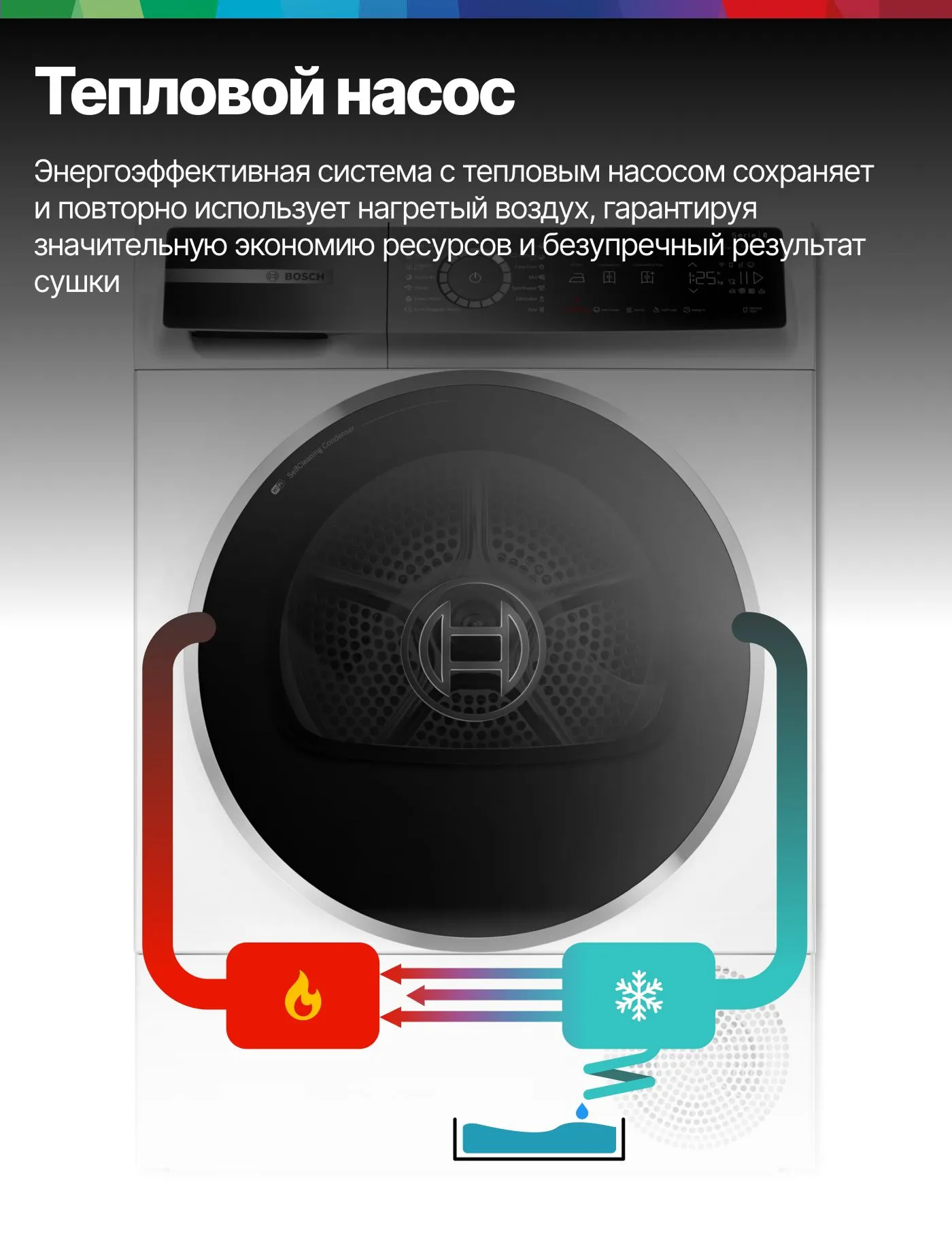 Тепловой насос увеличивает энергоэффективность сушильных машин с конденсационным типом сушки. В таких машинах увлажненный воздух прокачивается через испаритель, а энергия, которая выделяется в процессе испарения воды, используется для подогрева новых подаваемых в барабан воздушных потоков. Таким образом общая потребность в подогреве воздуха и, соответственно, в электроэнергии снижается.