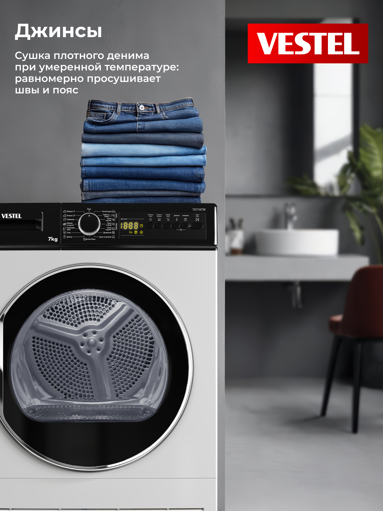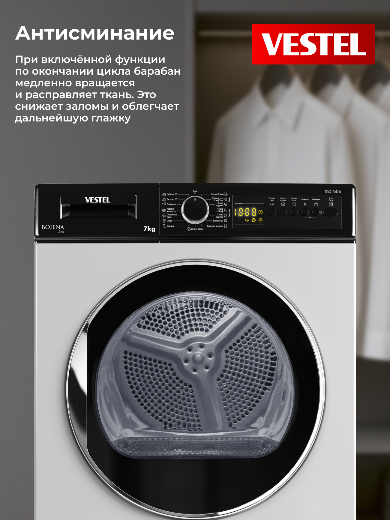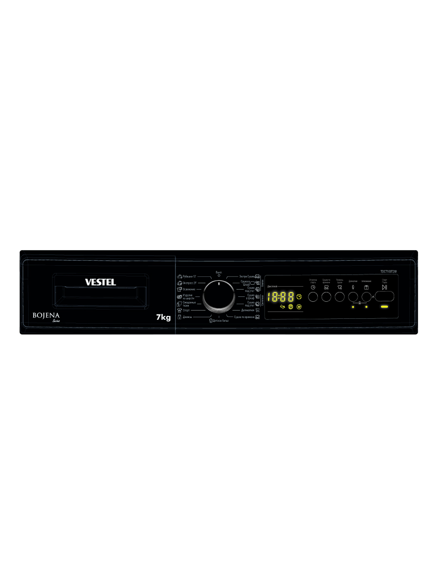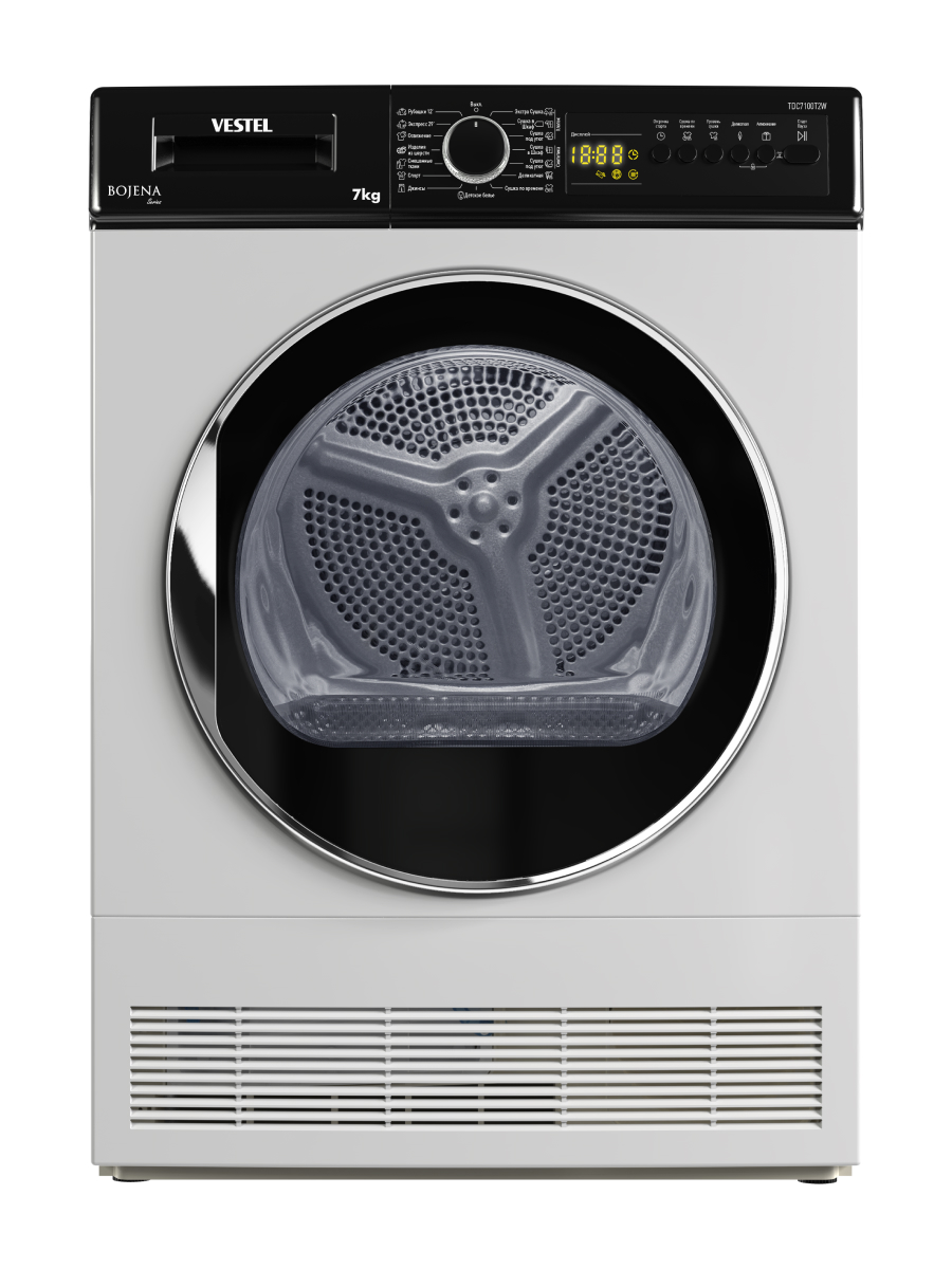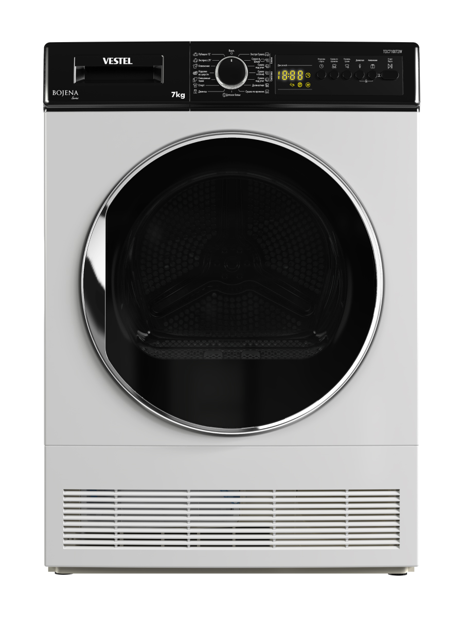 Сушильная машина Vestel TDC7100T2W рассчитана на загрузку до 7 кг белья и оснащена 15 программами сушки для разных типов тканей. Пользователь может выбрать степень сушки в зависимости от задачи: «экстра-сухо» для хранения без глажки, «под утюг» — для лёгкого разглаживания или «в шкаф» для повседневного использования. Для плотных тканей предусмотрен режим «Джинсы», а для тонких материалов — деликатная сушка при низкой температуре, которая сохраняет форму вещей. Специальная программа позволяет высушить 2–3 рубашки всего за 12 минут.