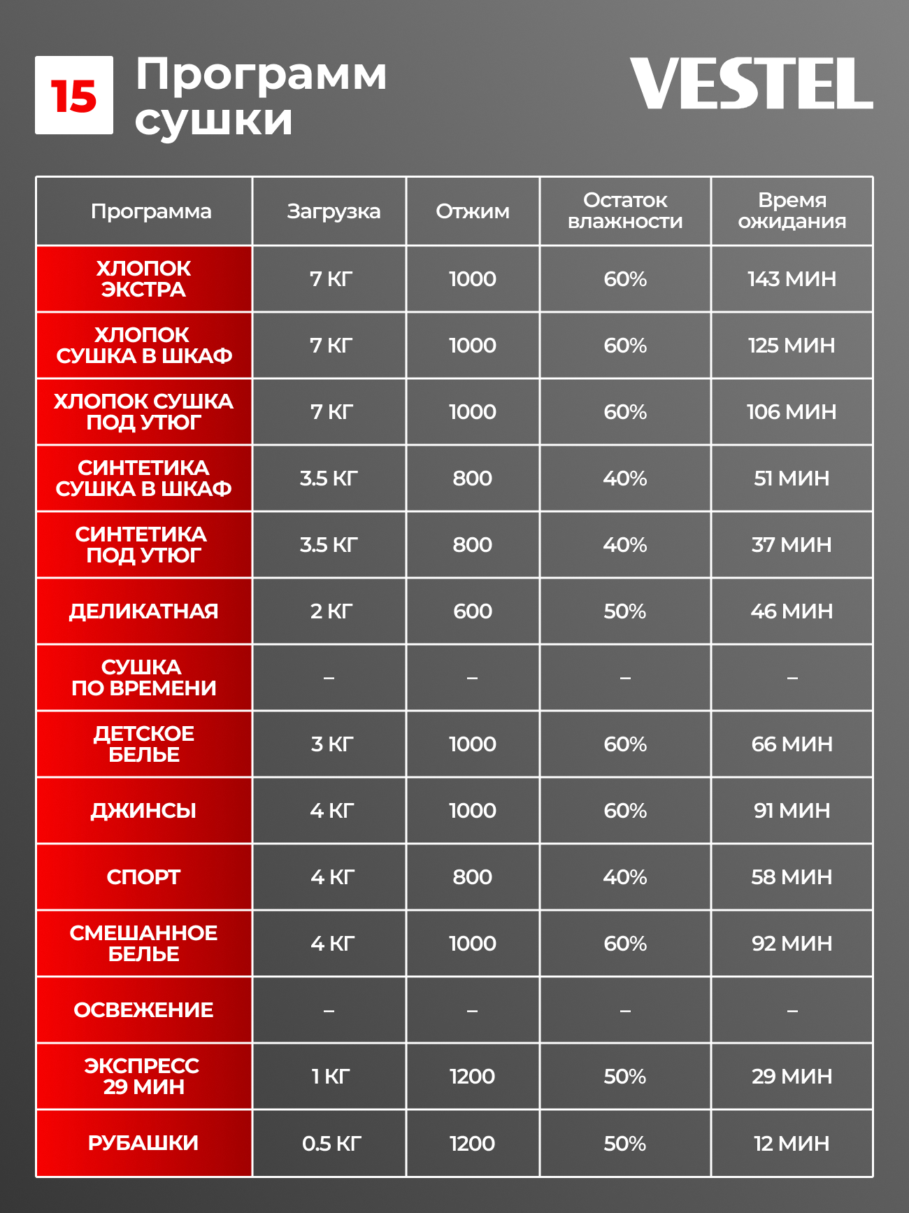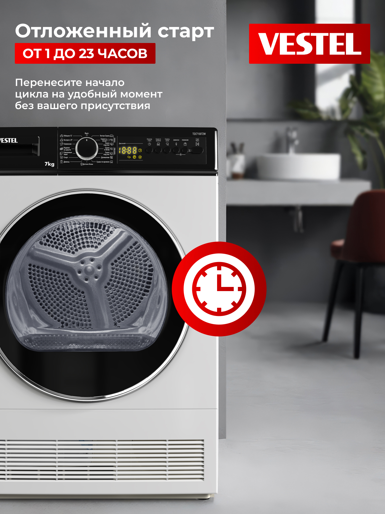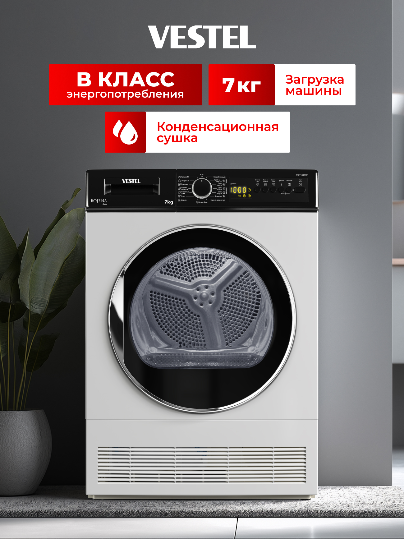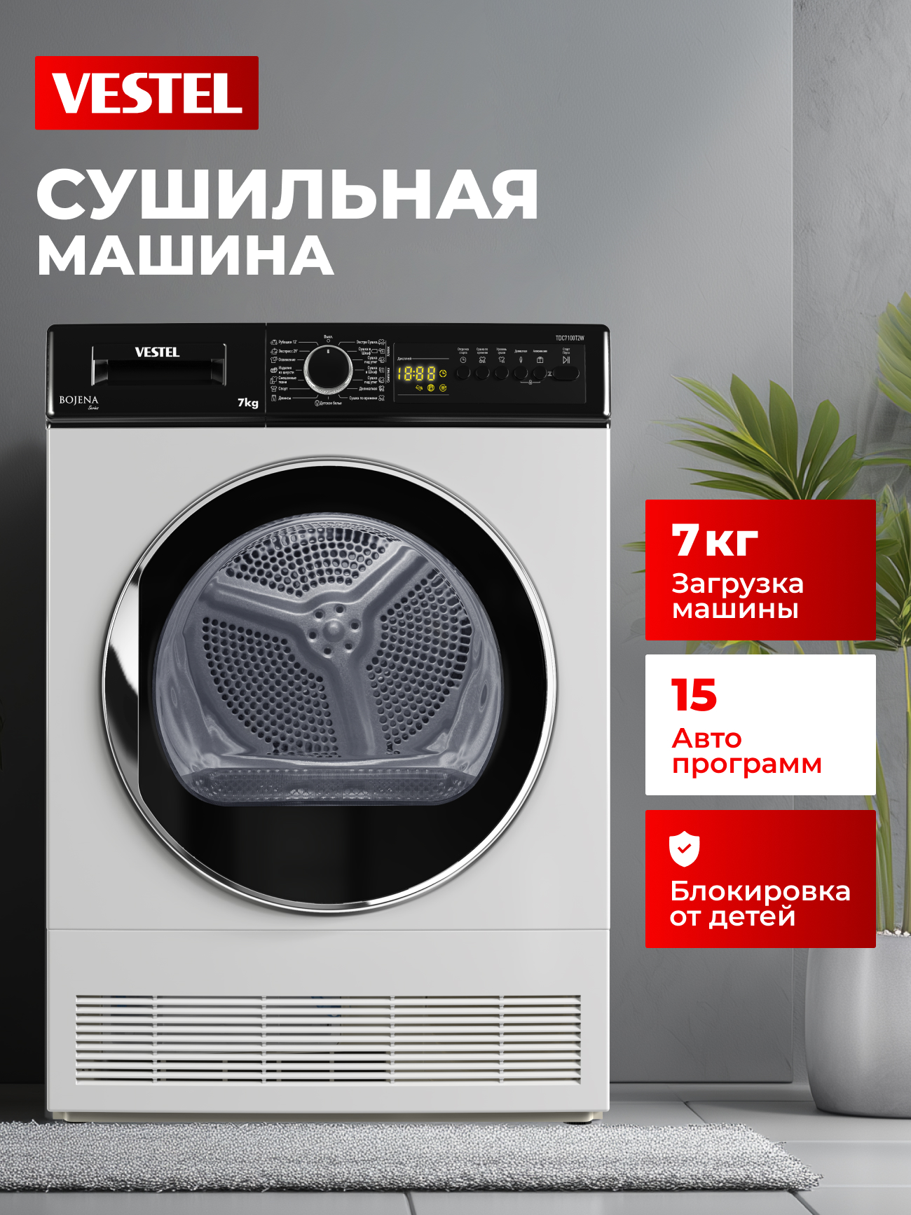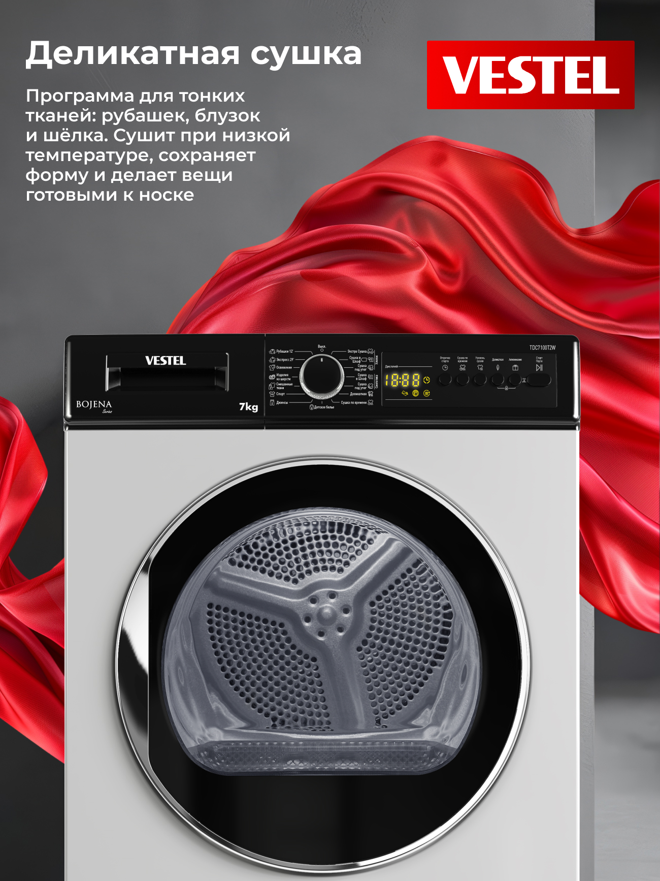 Сушильная машина Vestel TDC7100T2W рассчитана на загрузку до 7 кг белья и оснащена 15 программами сушки для разных типов тканей. Пользователь может выбрать степень сушки в зависимости от задачи: «экстра-сухо» для хранения без глажки, «под утюг» — для лёгкого разглаживания или «в шкаф» для повседневного использования. Для плотных тканей предусмотрен режим «Джинсы», а для тонких материалов — деликатная сушка при низкой температуре, которая сохраняет форму вещей. Специальная программа позволяет высушить 2–3 рубашки всего за 12 минут.