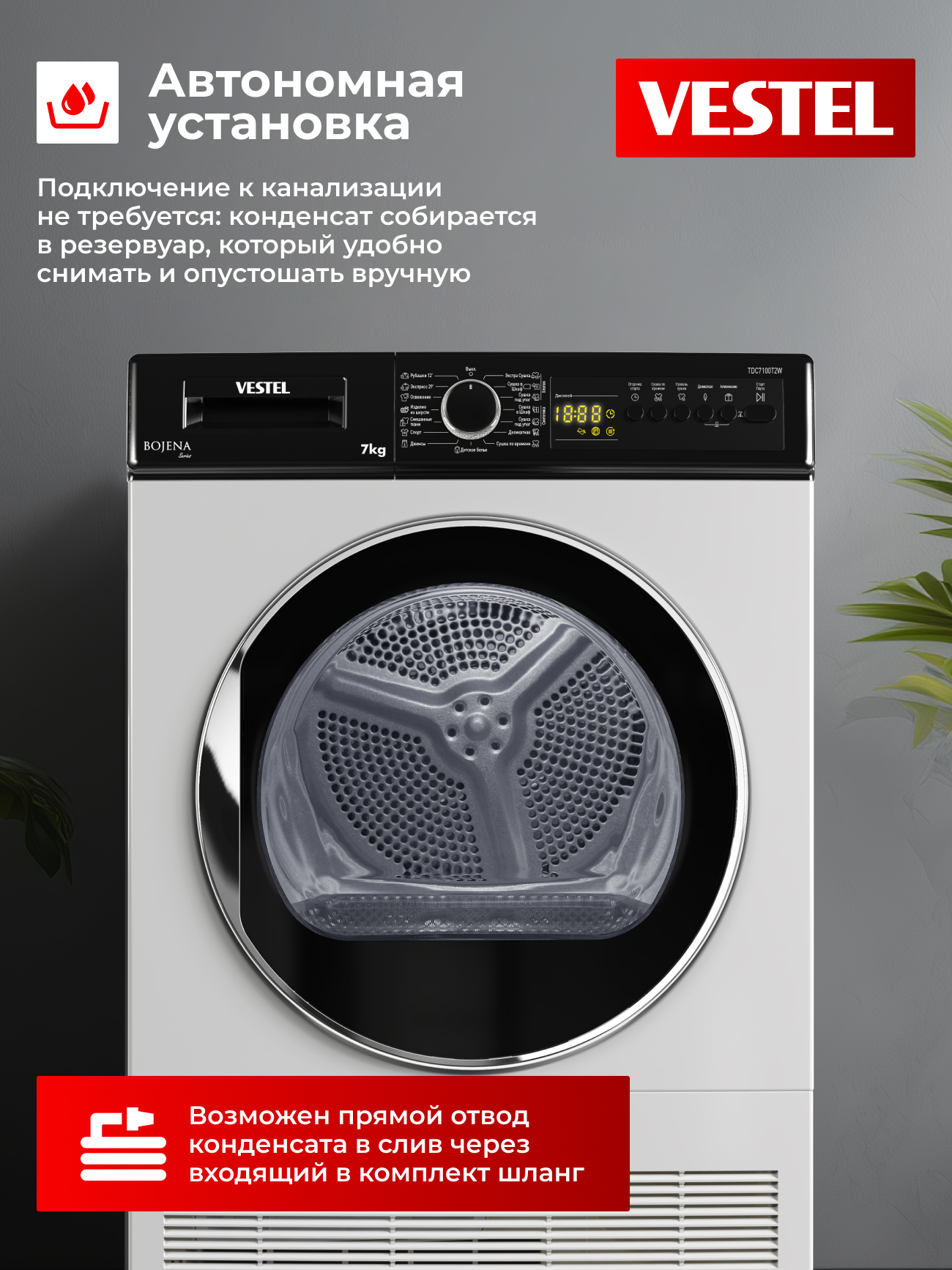 Сушка осуществляется по конденсационному принципу: конденсат собирается в отдельный резервуар, который можно легко опустошить, либо отвести воду напрямую в слив с помощью комплектного шланга. Сушильная машина относится к классу энергоэффективности B, работает в режиме энергосбережения при бездействии и подходит для автономной установки.