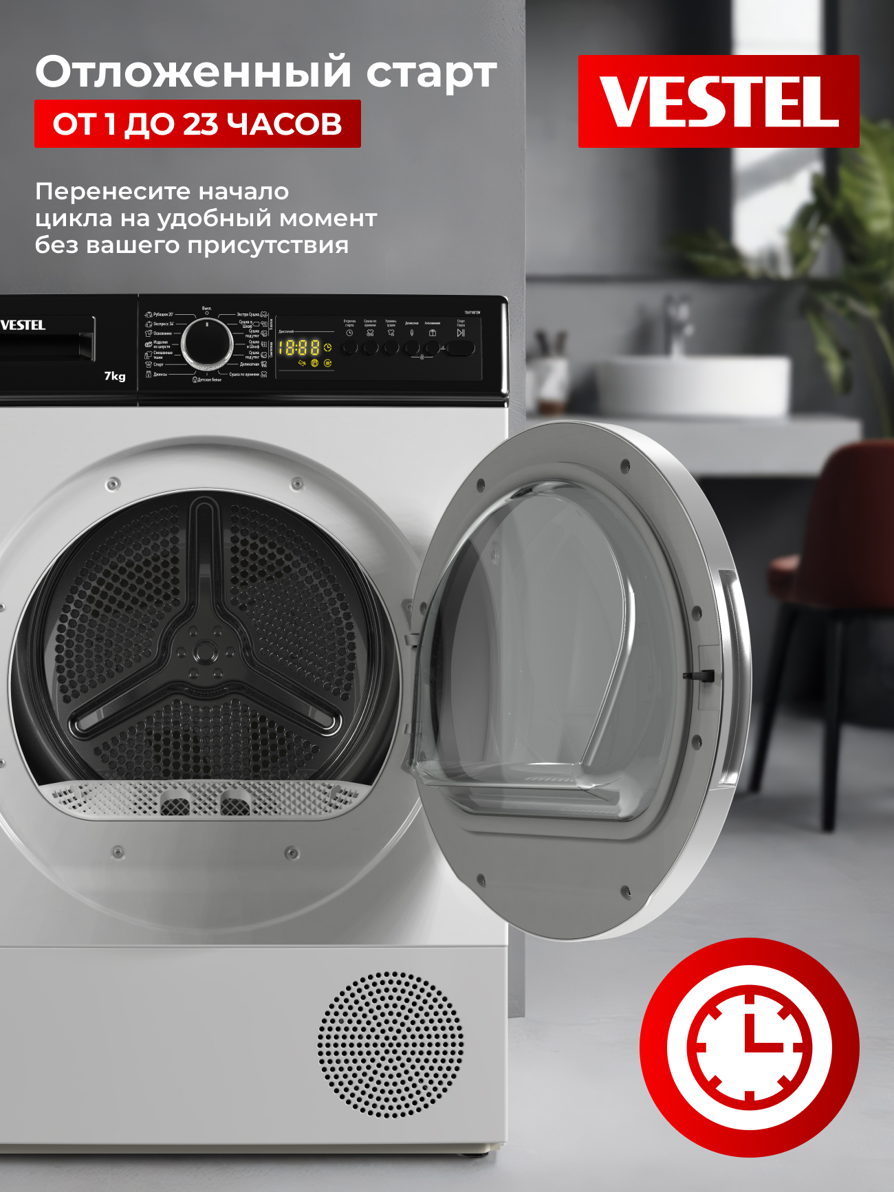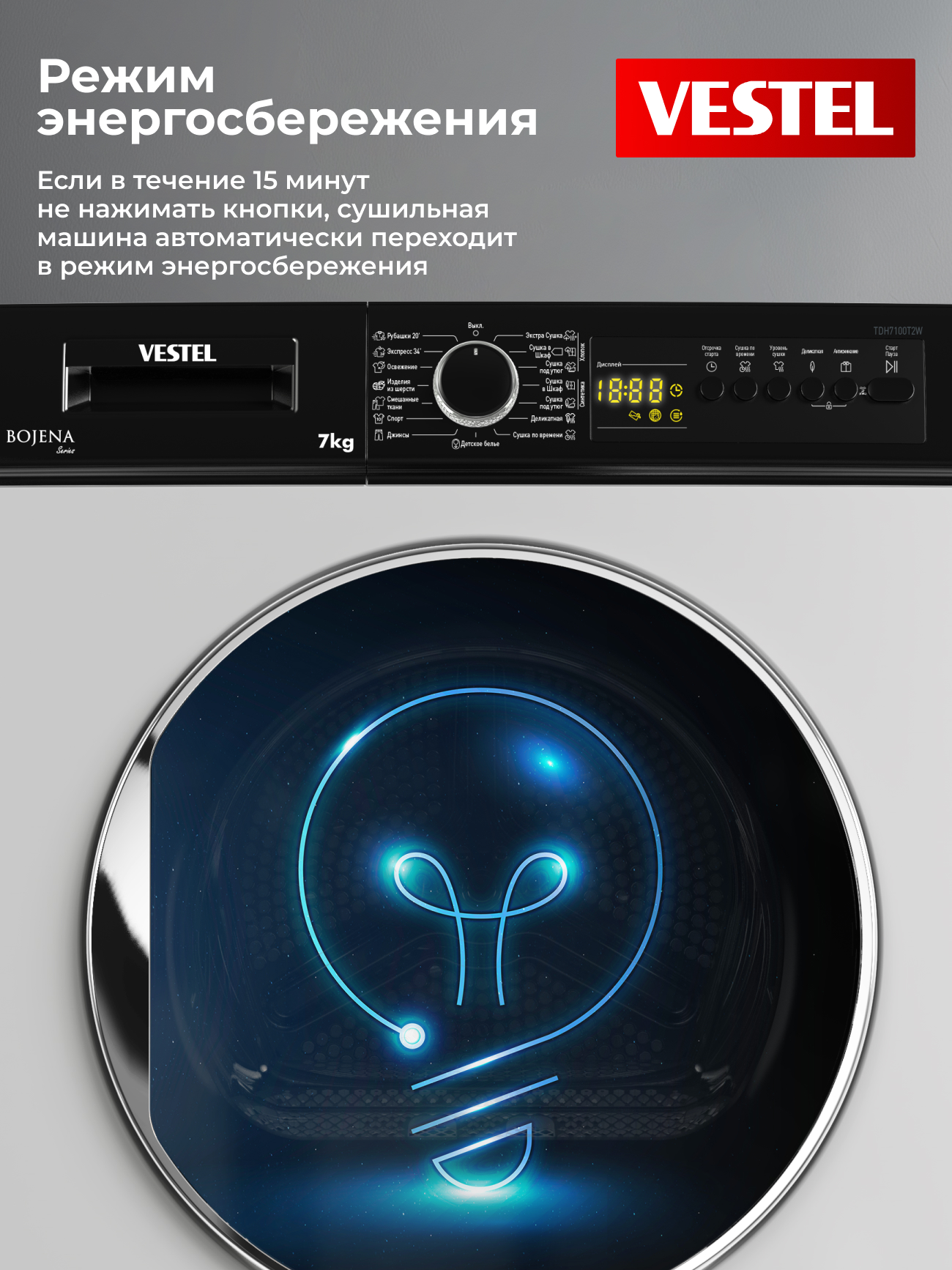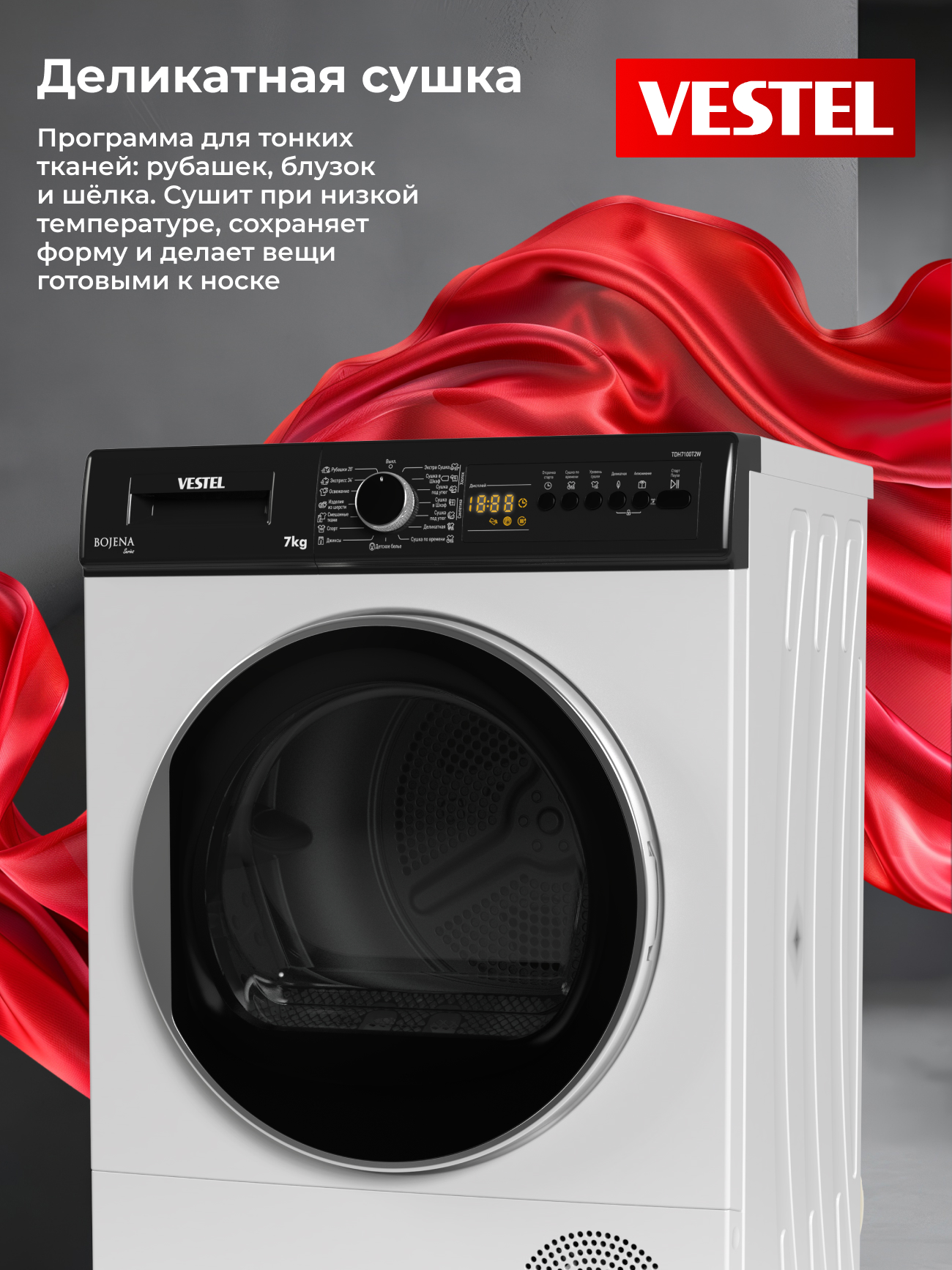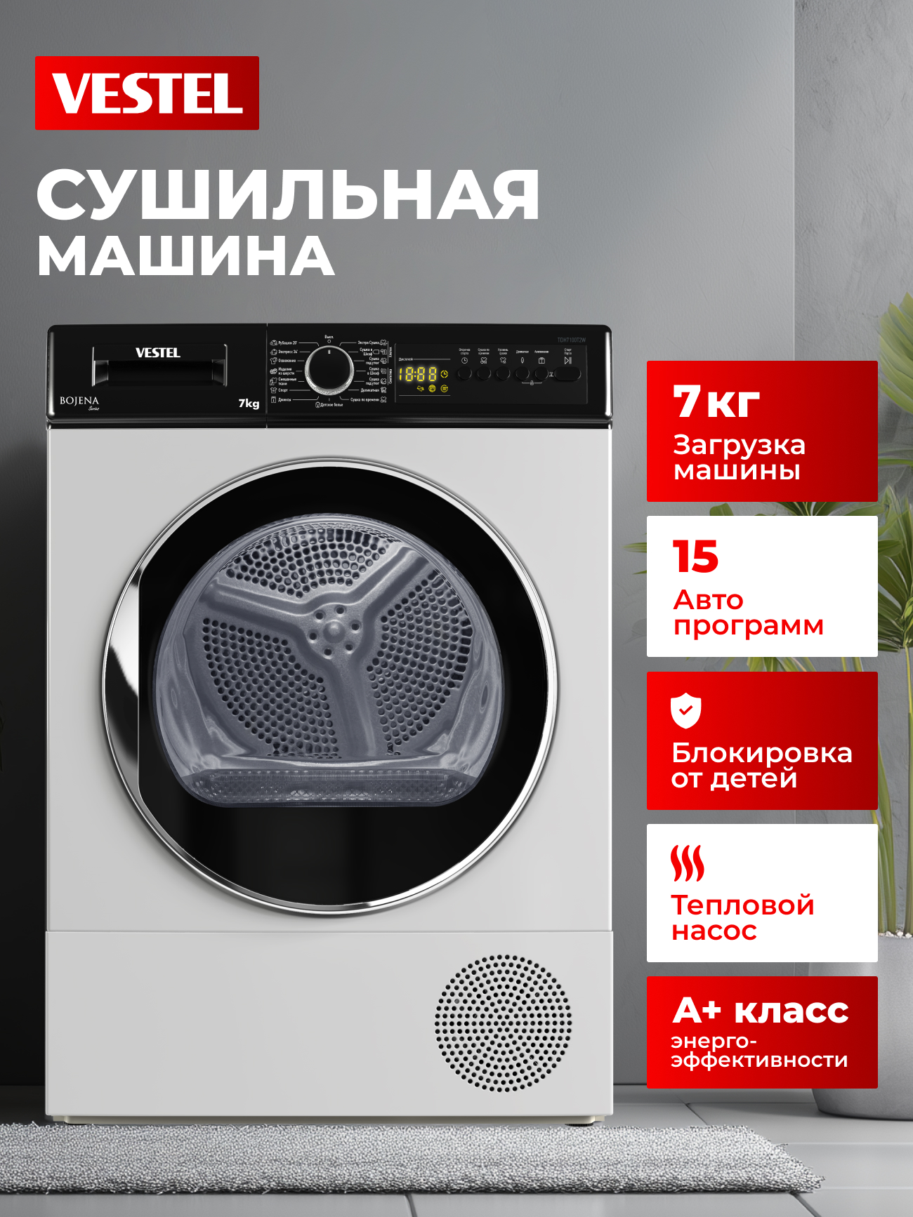 Сушильная машина Vestel TDH7100T2W - это современное решение для бережной и эффективной сушки белья. С вместительным барабаном объемом 90 литров и максимальной загрузкой до 7 кг, она станет незаменимым помощником в любом доме. Модель оснащена 15 программами сушки, включая деликатный режим, сушку детской одежды и пуховых изделий, что позволяет подобрать оптимальный режим для любого типа тканей. Электронное управление и удобный дисплей обеспечивают простоту и комфорт в эксплуатации. Функция отложенного старта позволяет запланировать сушку на удобное время, а защита от детей гарантирует безопасность использования. Благодаря классу энергопотребления A+, сушильная машина потребляет минимум электроэнергии, экономя ваши расходы.