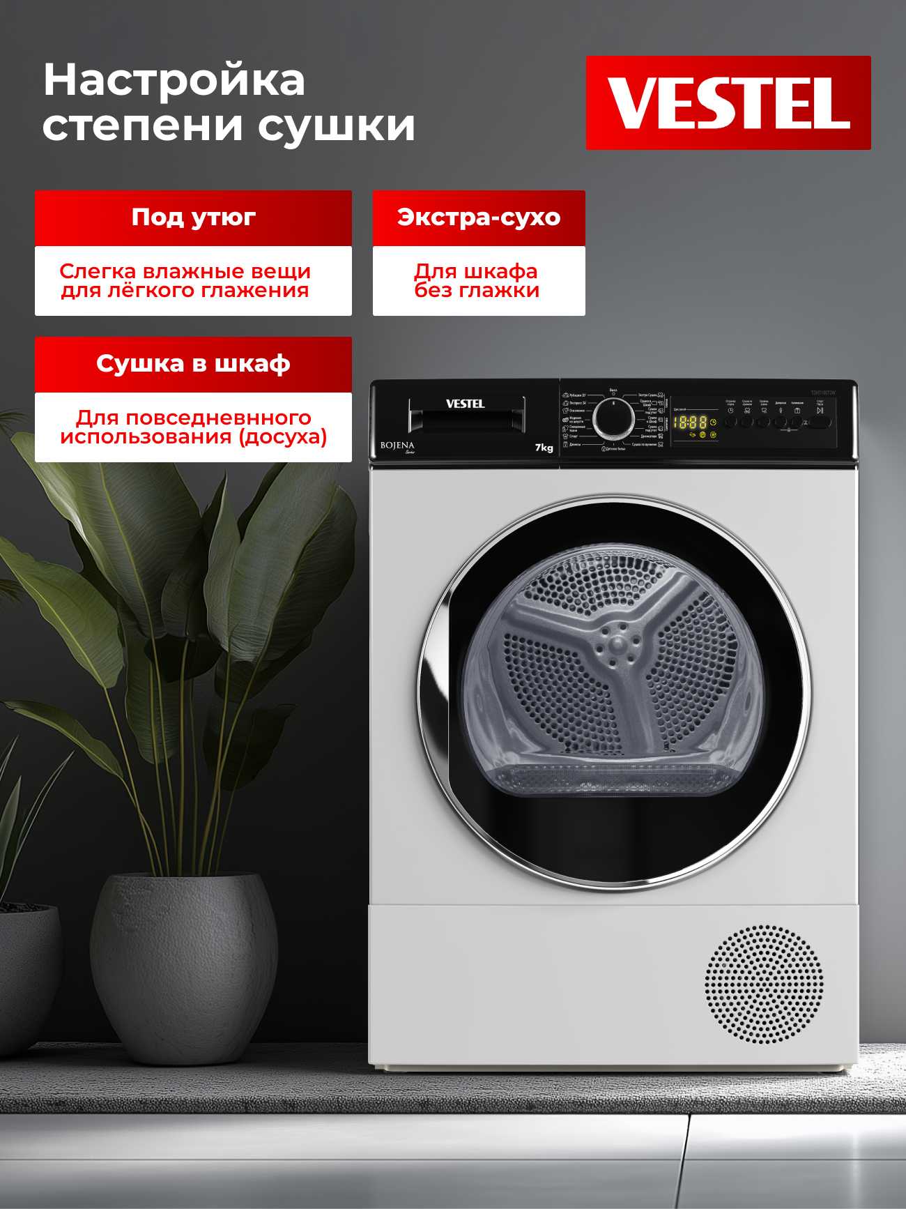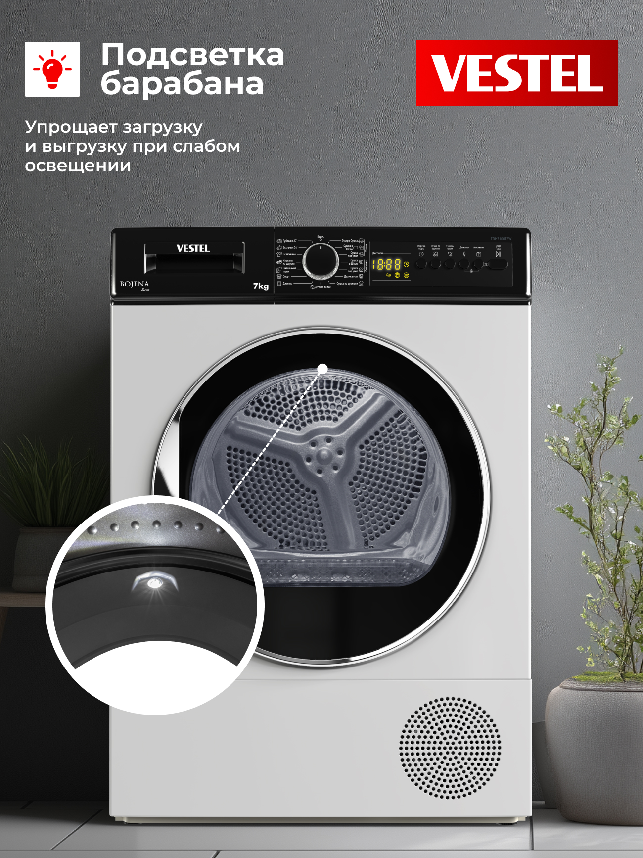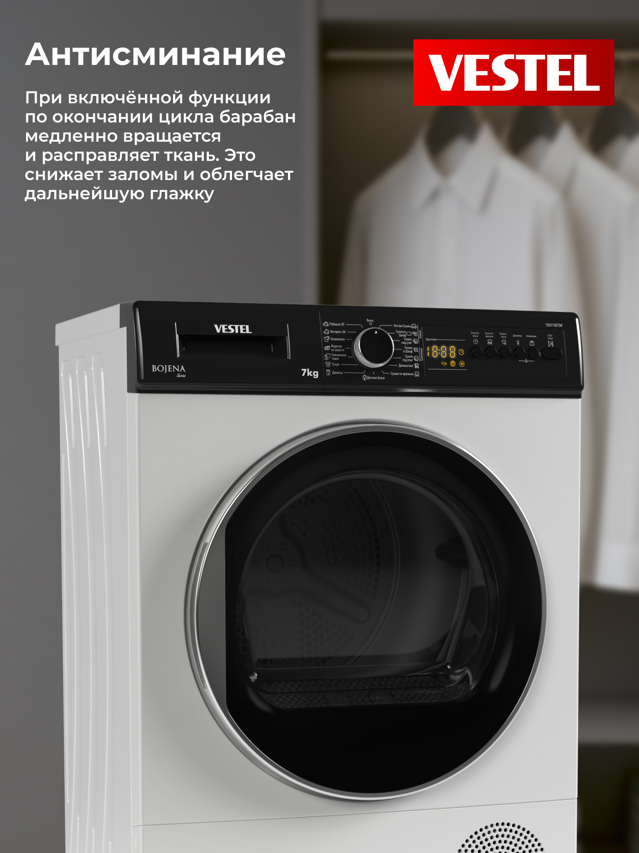 Сушильная машина Vestel TDH7100T2W - это современное решение для бережной и эффективной сушки белья. С вместительным барабаном объемом 90 литров и максимальной загрузкой до 7 кг, она станет незаменимым помощником в любом доме. Модель оснащена 15 программами сушки, включая деликатный режим, сушку детской одежды и пуховых изделий, что позволяет подобрать оптимальный режим для любого типа тканей. Электронное управление и удобный дисплей обеспечивают простоту и комфорт в эксплуатации. Функция отложенного старта позволяет запланировать сушку на удобное время, а защита от детей гарантирует безопасность использования. Благодаря классу энергопотребления A+, сушильная машина потребляет минимум электроэнергии, экономя ваши расходы.