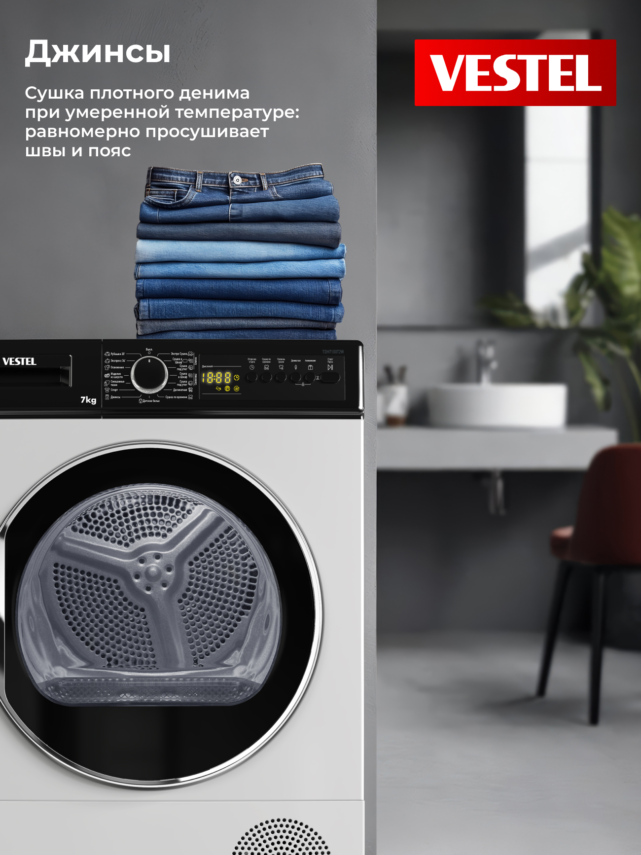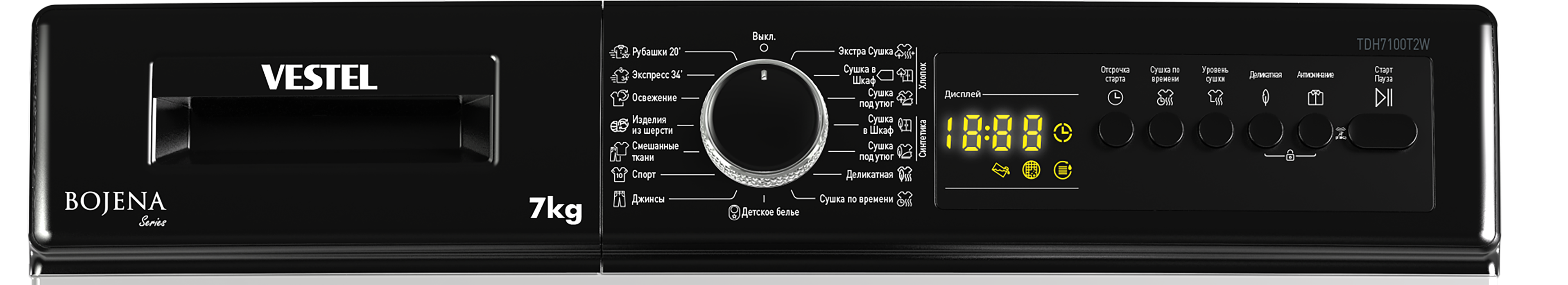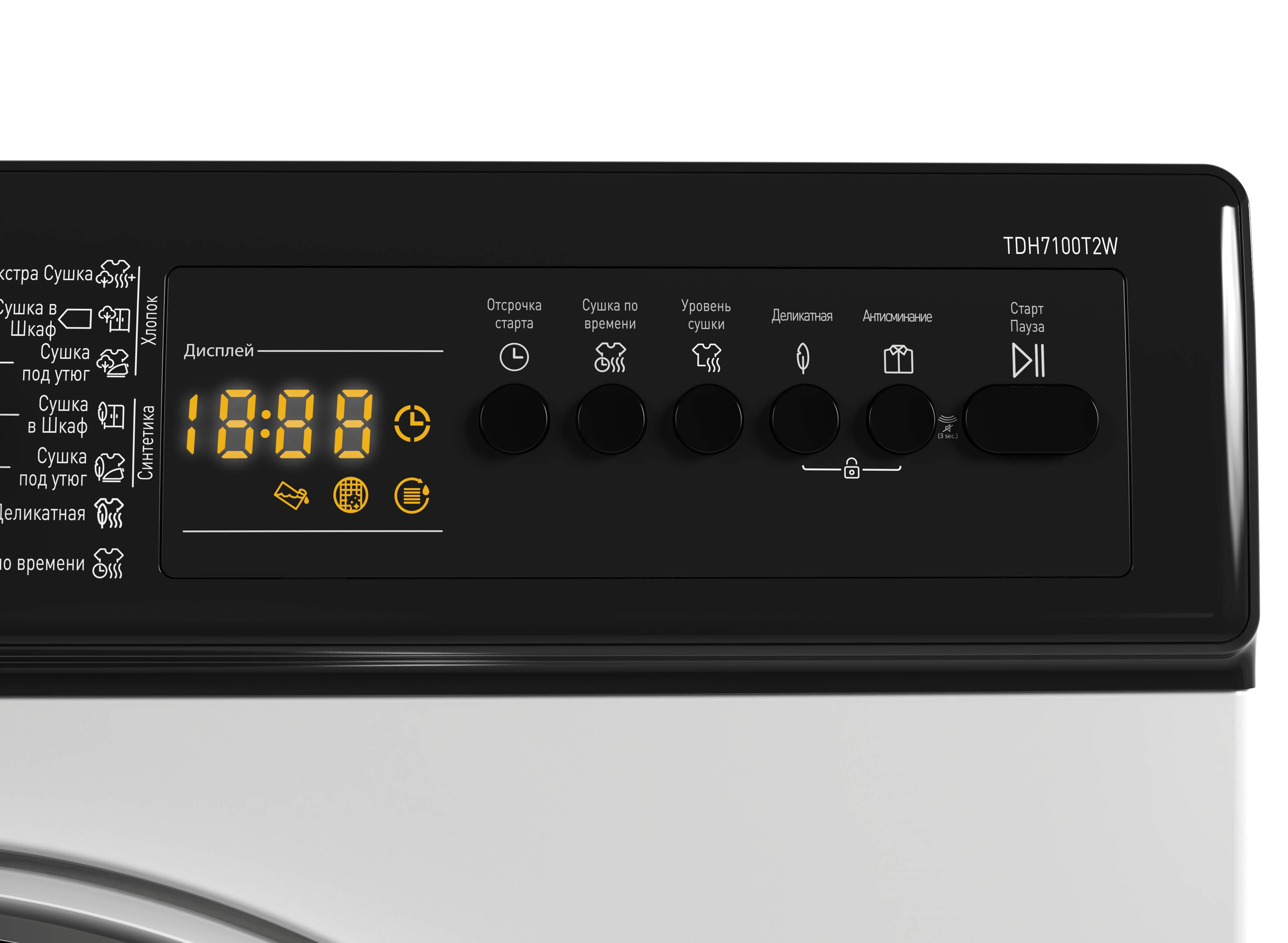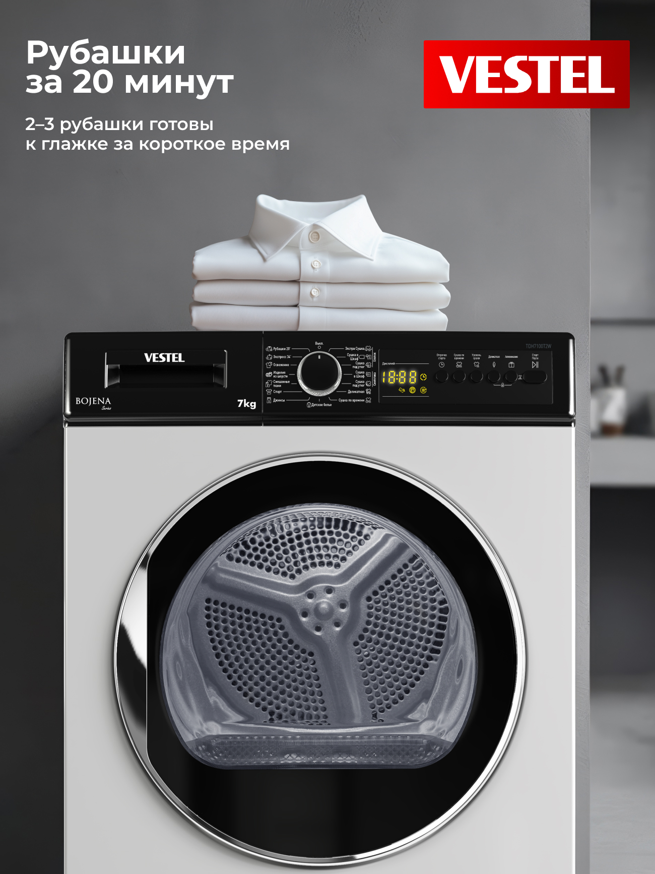 Сушильная машина Vestel TDH7100T2W - это современное решение для бережной и эффективной сушки белья. С вместительным барабаном объемом 90 литров и максимальной загрузкой до 7 кг, она станет незаменимым помощником в любом доме. Модель оснащена 15 программами сушки, включая деликатный режим, сушку детской одежды и пуховых изделий, что позволяет подобрать оптимальный режим для любого типа тканей. Электронное управление и удобный дисплей обеспечивают простоту и комфорт в эксплуатации. Функция отложенного старта позволяет запланировать сушку на удобное время, а защита от детей гарантирует безопасность использования. Благодаря классу энергопотребления A+, сушильная машина потребляет минимум электроэнергии, экономя ваши расходы.