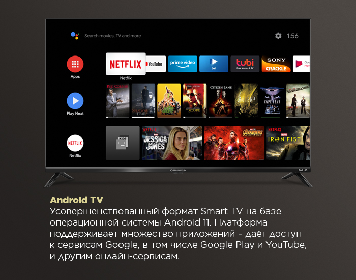 Версия операционной системы Android, адаптированная для телевизоров. Она предназначена для просмотра телетрансляций, сетевого контента популярных видеосервисов, воспроизведения мультимедиа из локальной библиотеки и доступа к Google Play.