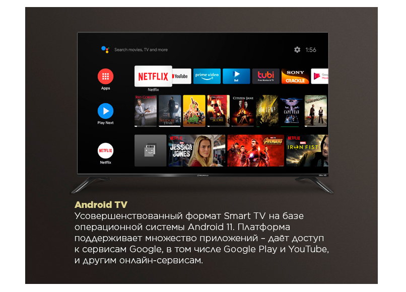 Версия операционной системы Android, адаптированная для телевизоров. Она предназначена для просмотра телетрансляций, сетевого контента популярных видеосервисов, воспроизведения мультимедиа из локальной библиотеки и доступа к Google Play.