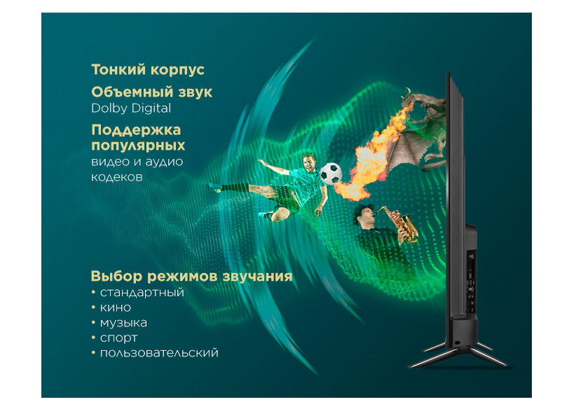 Телевизор оснащен широкими диапазонами приема – VHF (177.5МГц ~ 226.5МГц), UHF (474МГц ~ 862МГц), DVB-S/S2: (950МГц - 2150МГц), что позволяет транслировать большое количество цифровых каналов.