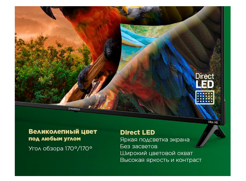 LED-телевизор Maunfeld оборудован такими разъемами, как HDMI и USB. За счет этого к устройству удобно подсоединять флеш-накопитель, смартфон, ноутбук, игровую консоль или внешний жесткий диск. Телевизор воспроизводит все популярные графические файлы - JPG, BMP,PNG, что позволит вам воспроизводить ваши фотографии через экран телевизора.