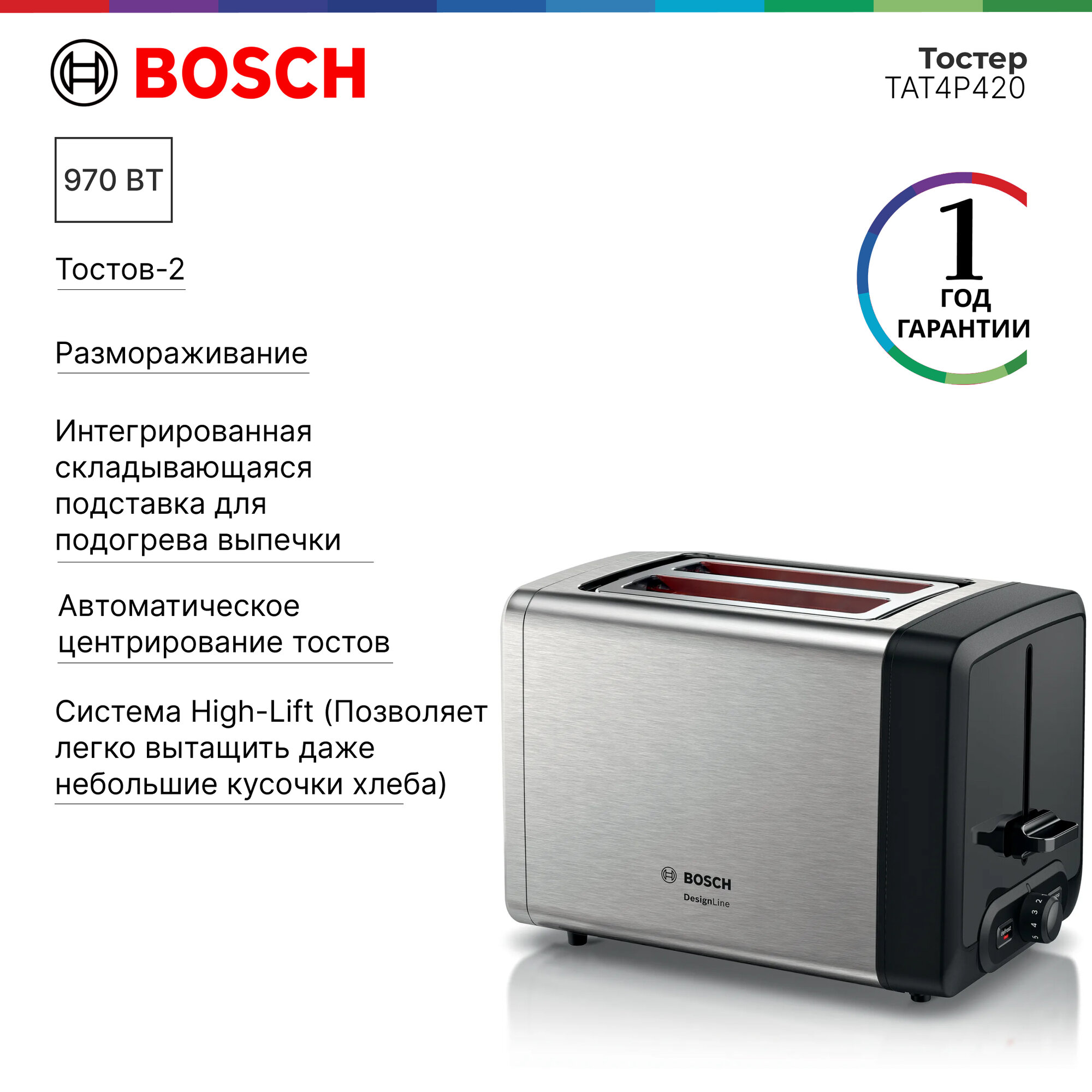 Тостер Bosch DesignLine TAT4P420 - это стильный и функциональный кухонный помощник, который станет незаменимым атрибутом вашей кухни.