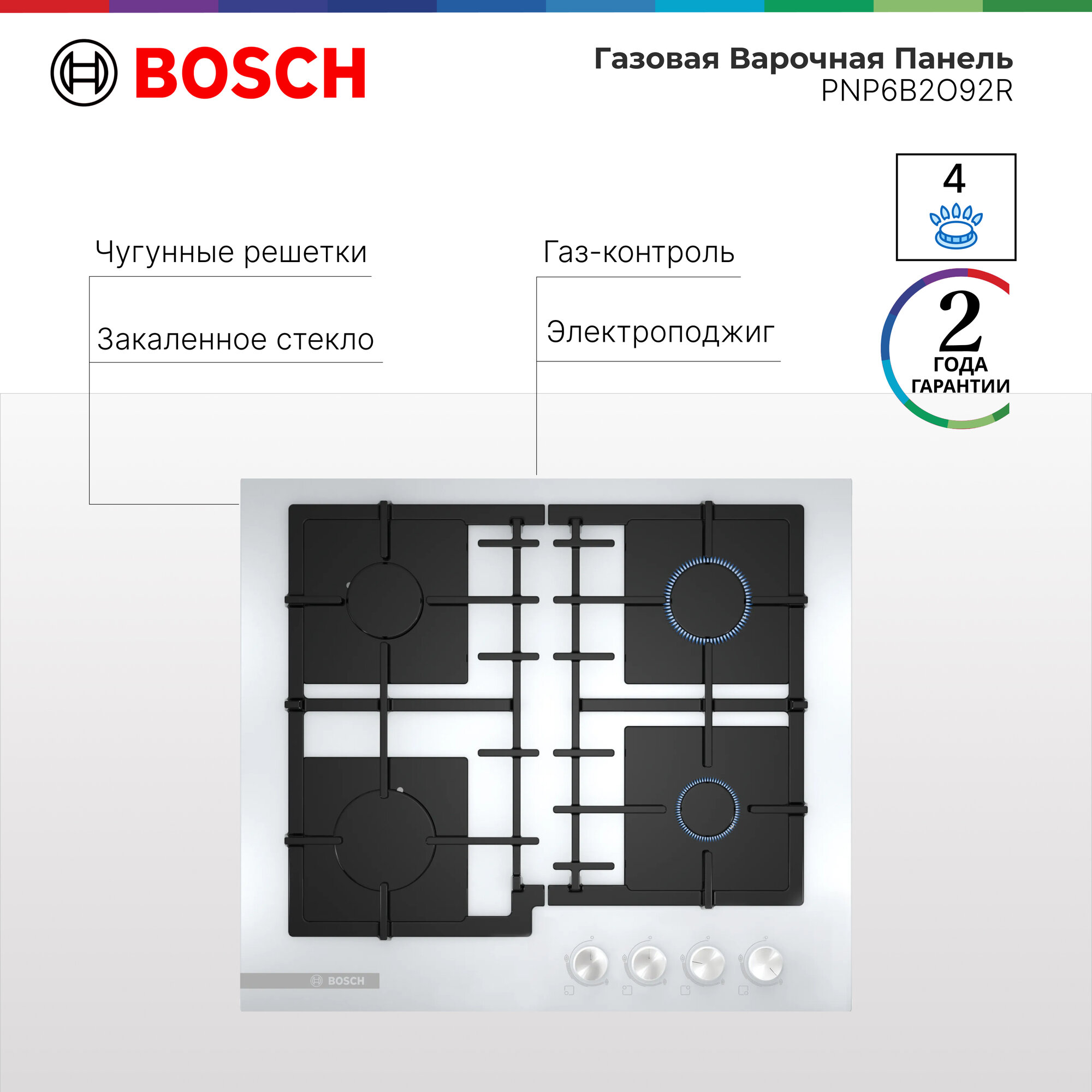 Страна производства: Испания. Товар новый в заводской упаковке. Готовьте еду на открытом огне – такую возможность предоставляет газовая варочная панель Bosch Serie|4 PNP6B2O92R. Она оборудована четырьмя конфорками различной мощности и способна работать на биометане. МЕХАНИЧЕСКАЯ СИСТЕМА УПРАВЛЕНИЯ Устройством просто пользоваться. У неё есть поворотные ручки со встроенным автоматическим электроподжигом. С их помощью вы легко зажжёте пламя. МАКСИМАЛЬНАЯ БЕЗОПАСНОСТЬ Все горелки оснащены датчиками газ-контроля. Они мгновенно прекратят подачу топлива, если огонь по какой-либо причине погаснет. КРАСИВО И ПРАКТИЧНО Модель стильно выглядит. Её решётки сделаны из прочного чугуна и при необходимости легко очищаются. Поверхность выполнена из закалённого стекла, с неё вы тоже, если понадобится, быстро удалите жир и прочие загрязнения.