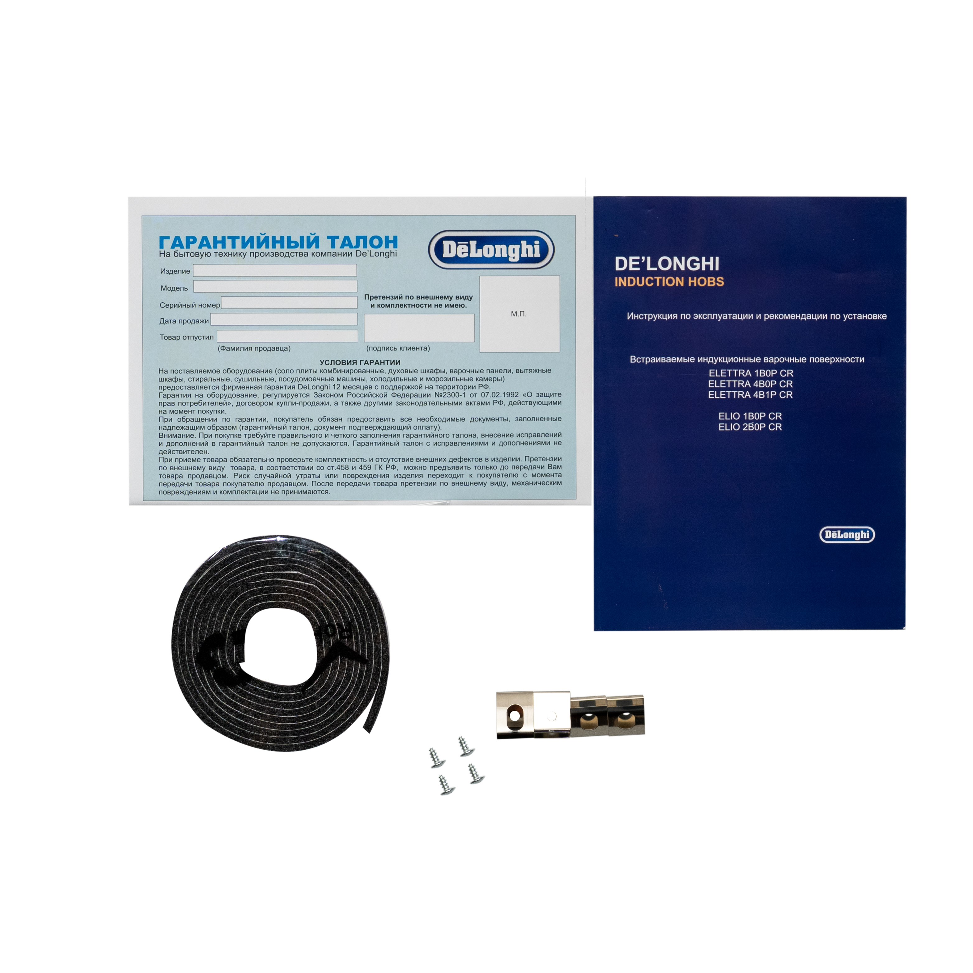 Уплотнительная лента для монтажа, Крепления и болты для столешницы, Кабель питания, Инструкция, Руководство по подключению, Гарантийный талон