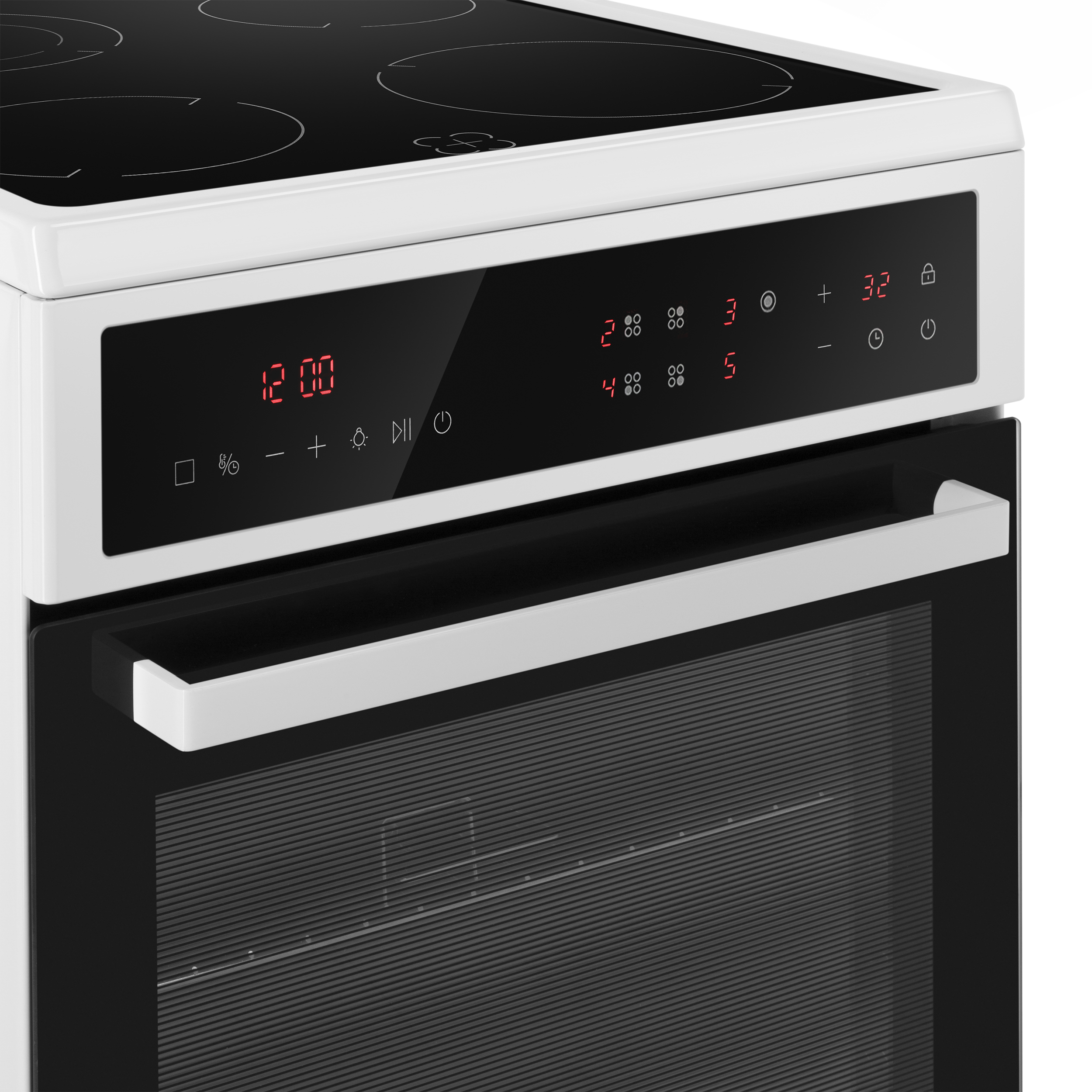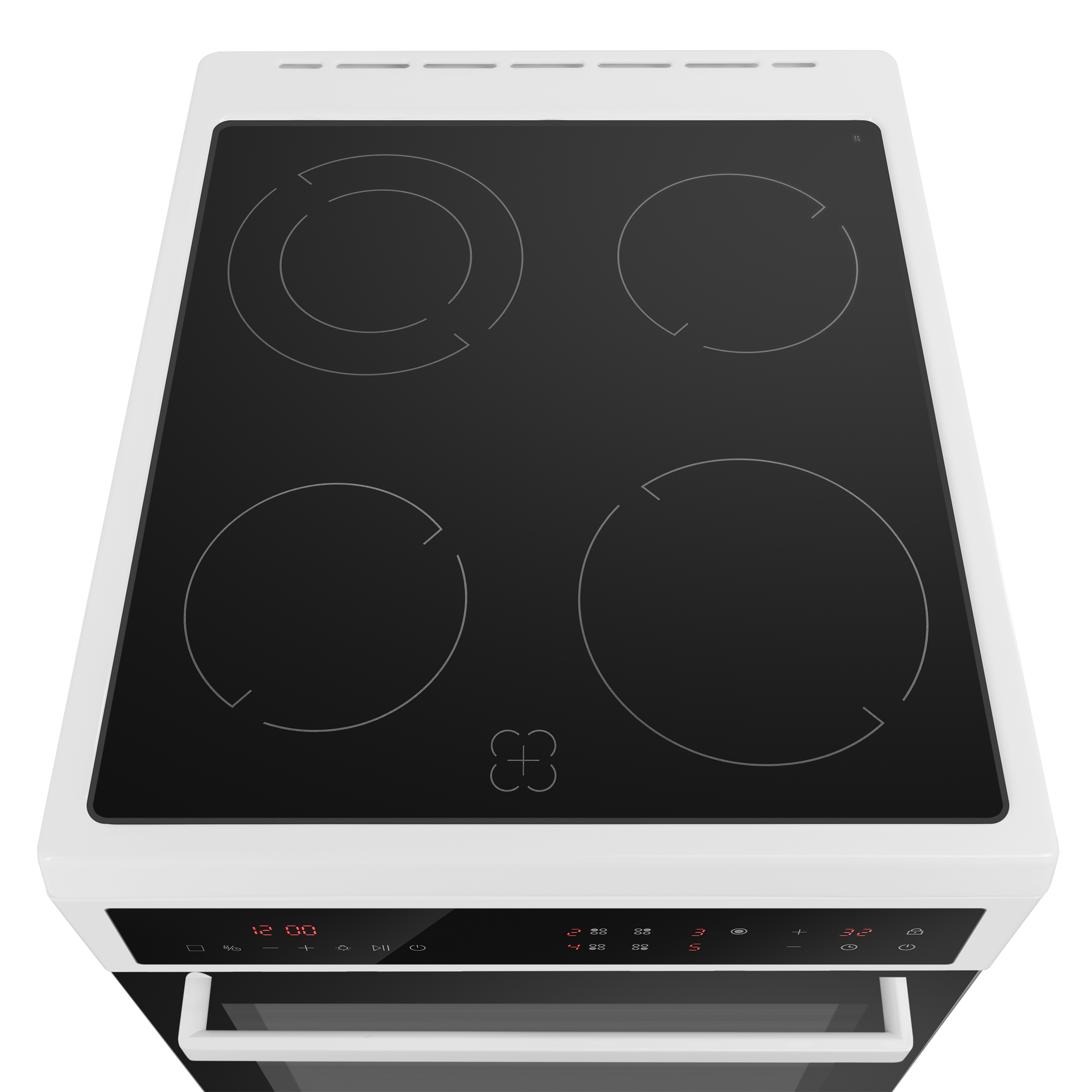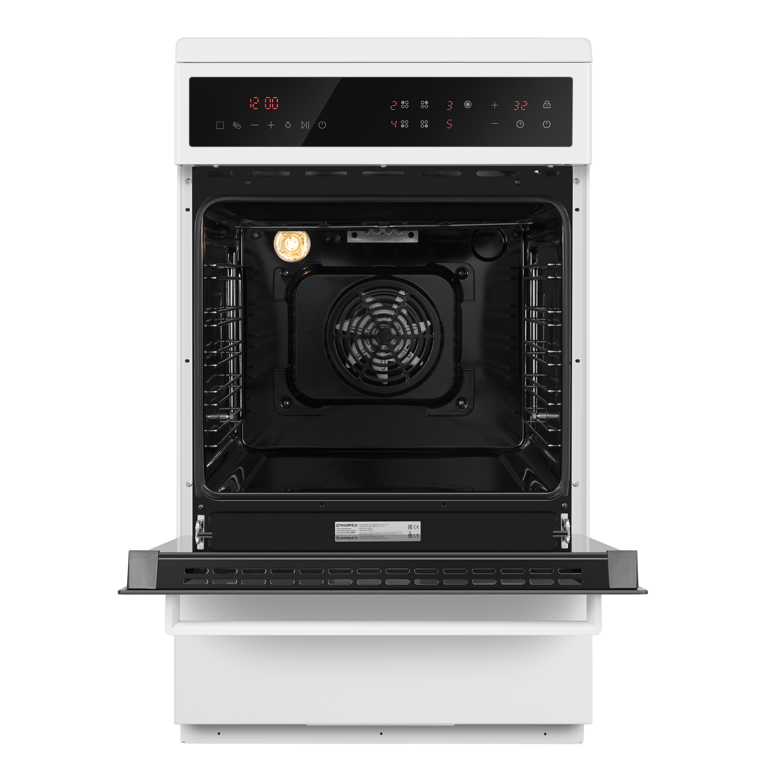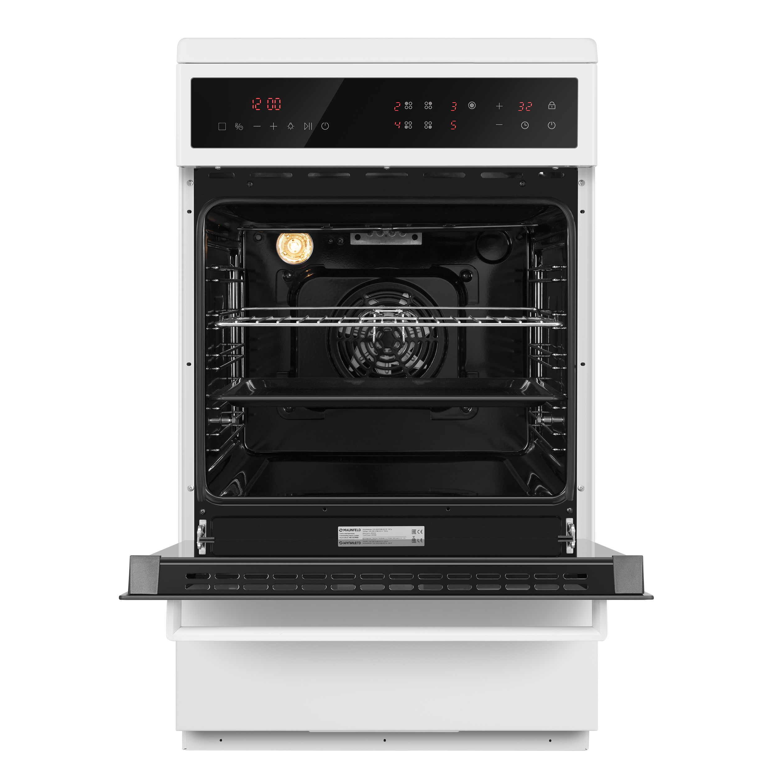 Полноразмерная электрическая плита с сенсорным управлением, варочная поверхность - стеклокерамическая. Техническое оснащение также на уровне - конфорки рабочего стола и духовой шкаф управляются сенсорами, в комплектацию входит многофункциональный таймер. Духовой шкаф оснащен конвекцией и грилем. Благодаря яркому внутреннему освещению виден весь объем духовки, нет необходимости открывать дверцу для контроля готовности блюда. Комфортная в эксплуатации, для удобства ухода за плитой, направляющие для противней - съемные и легко чистятся. Предусмотрен и ящик для хранения кухонной посуды. Модель по праву заслуживает место на Вашей кухне.