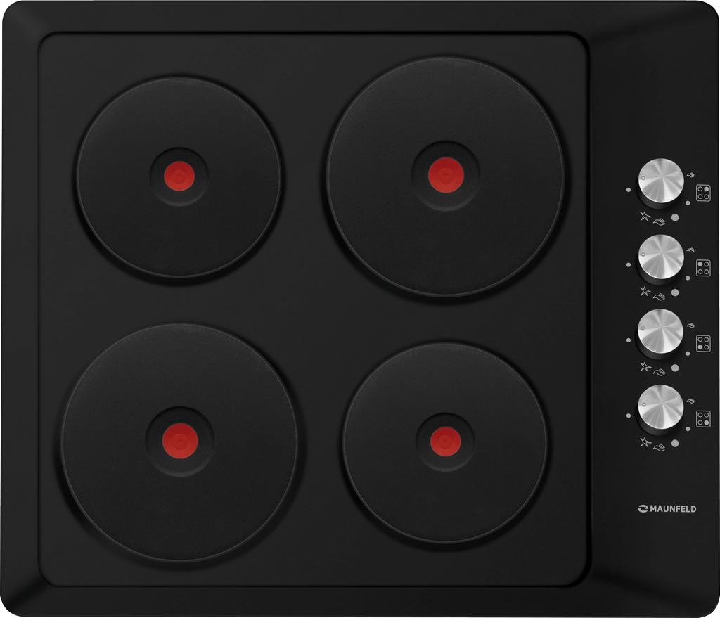 Оборудована 4-мя прочными чугунными конфорками быстрого нагрева HP RAPID со стальной окантовкой: две конфорки диаметром 150 мм (по 1500 Вт) и две - диаметром 185 мм (по 1500 Вт). Красный круг по центру каждой конфорки – это индикатор нагрева.