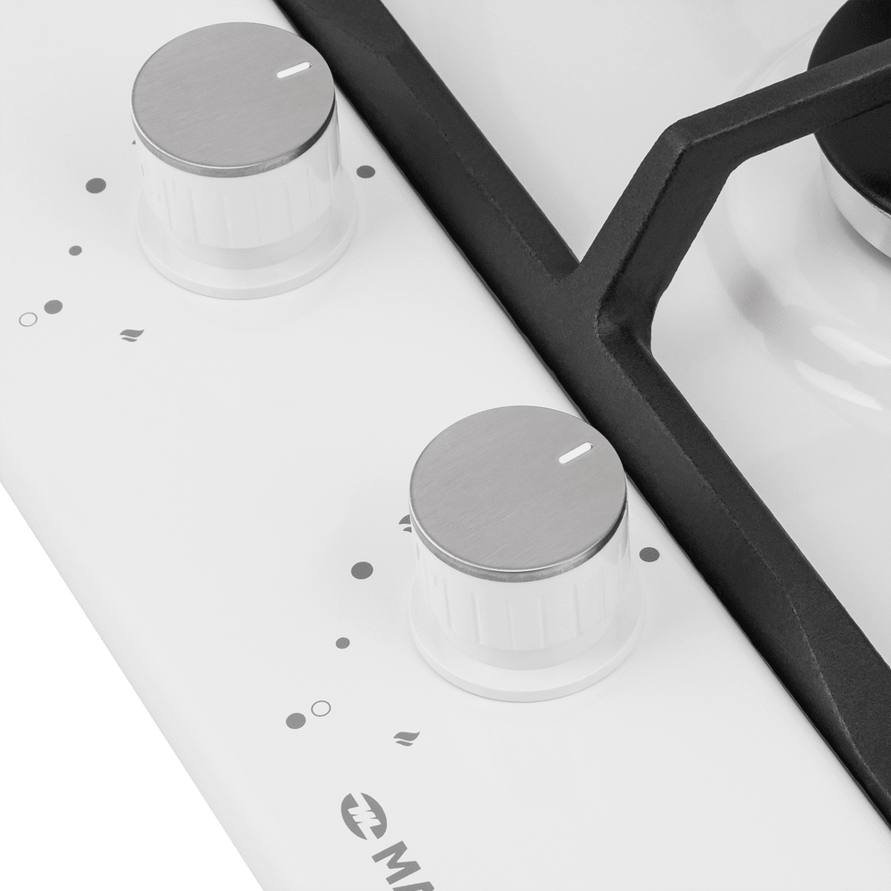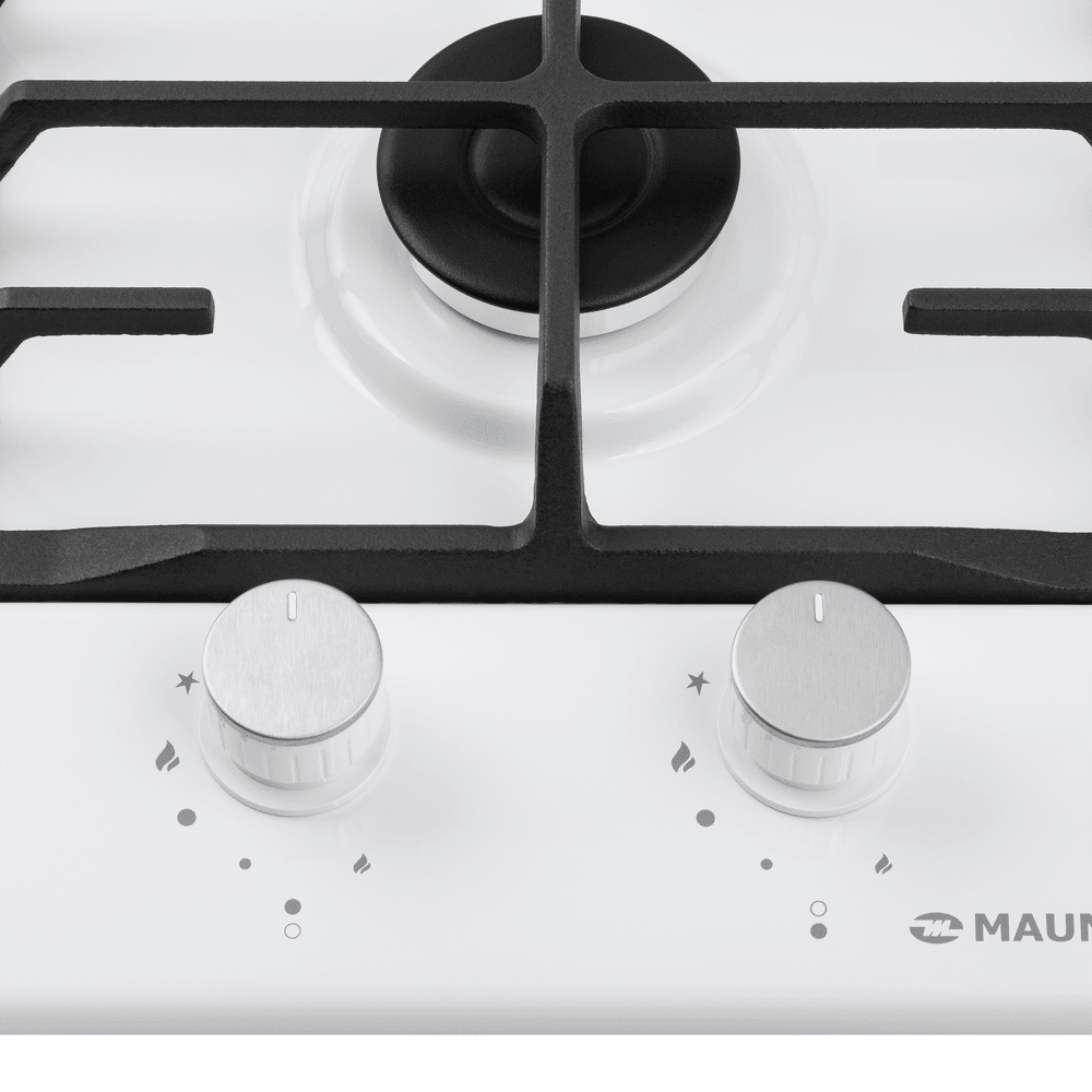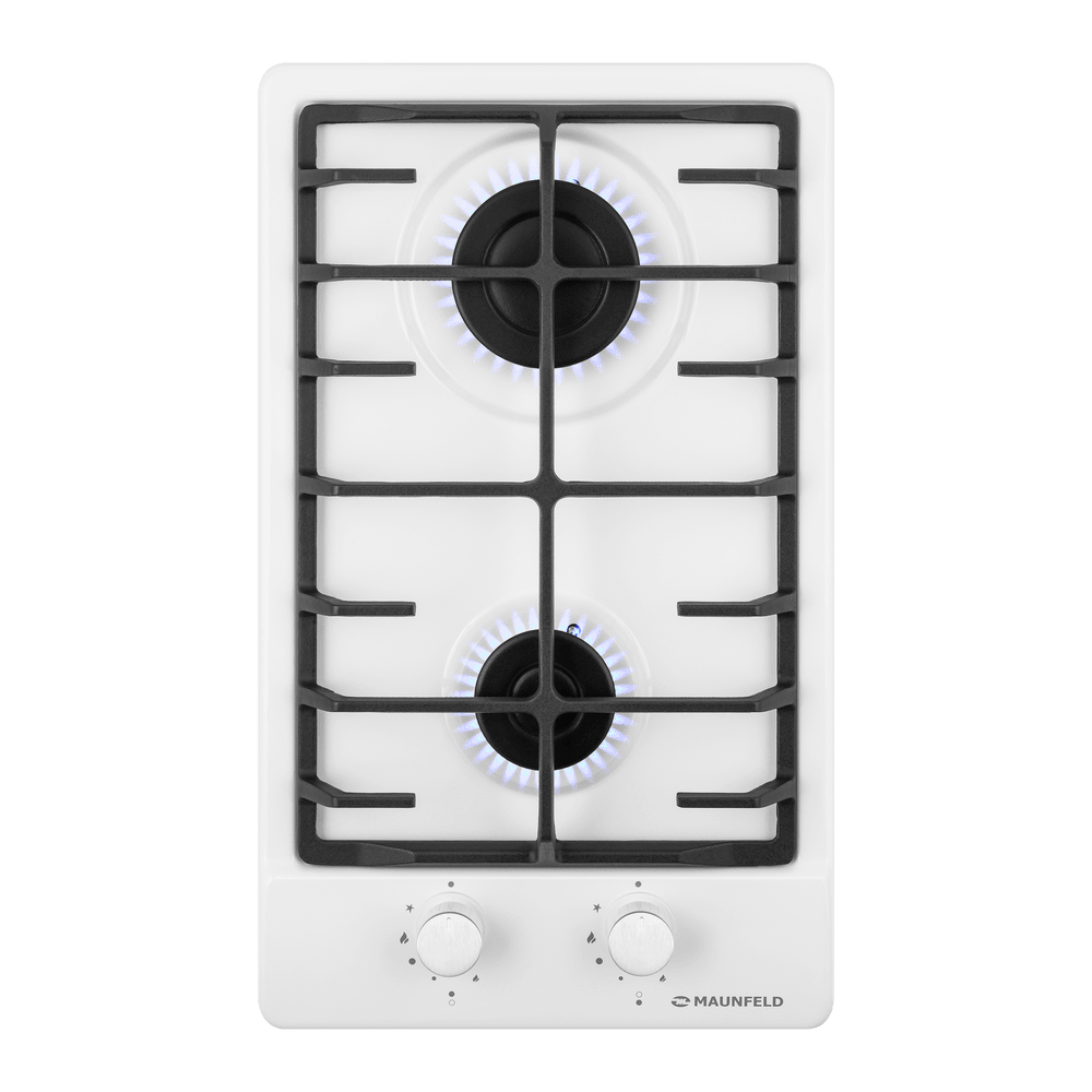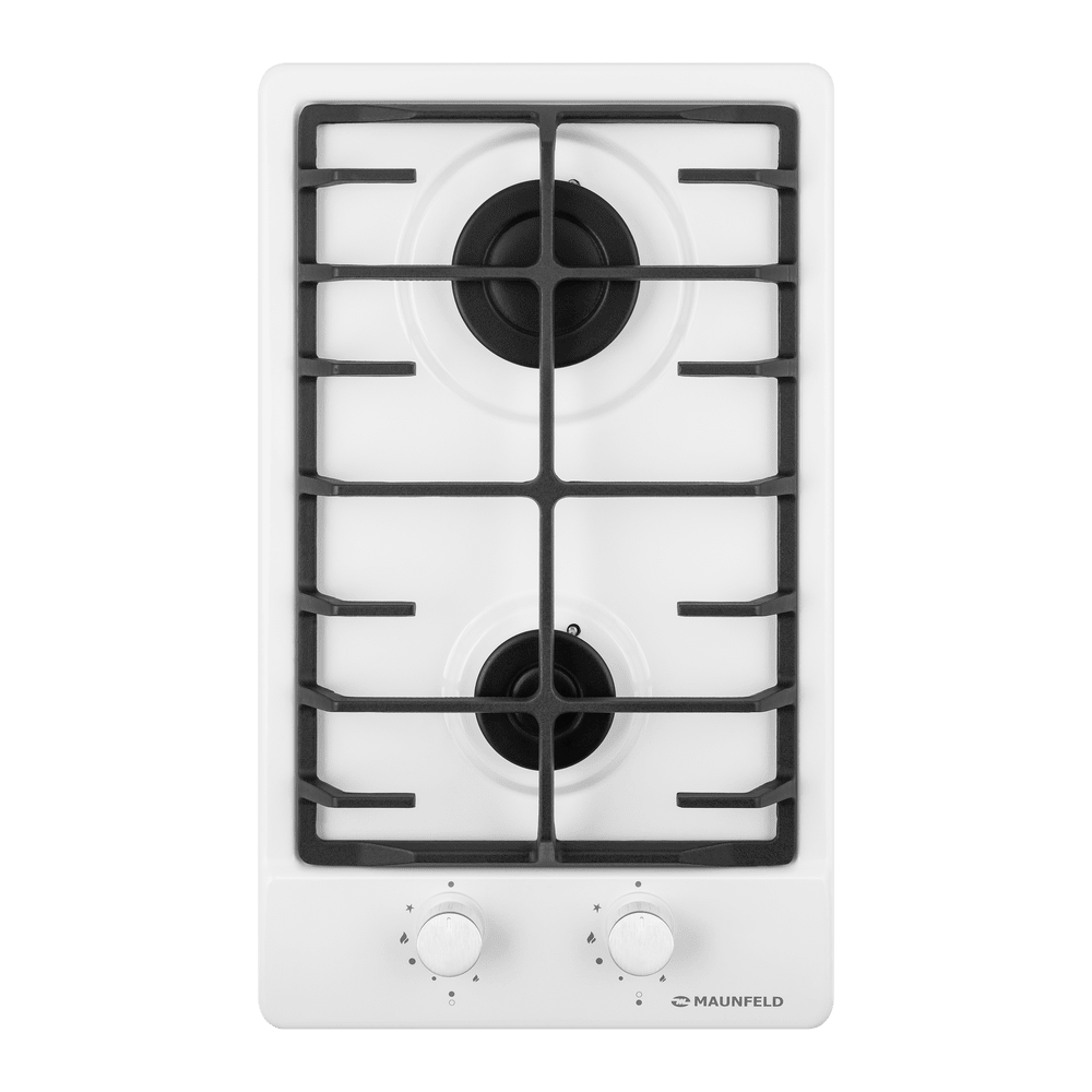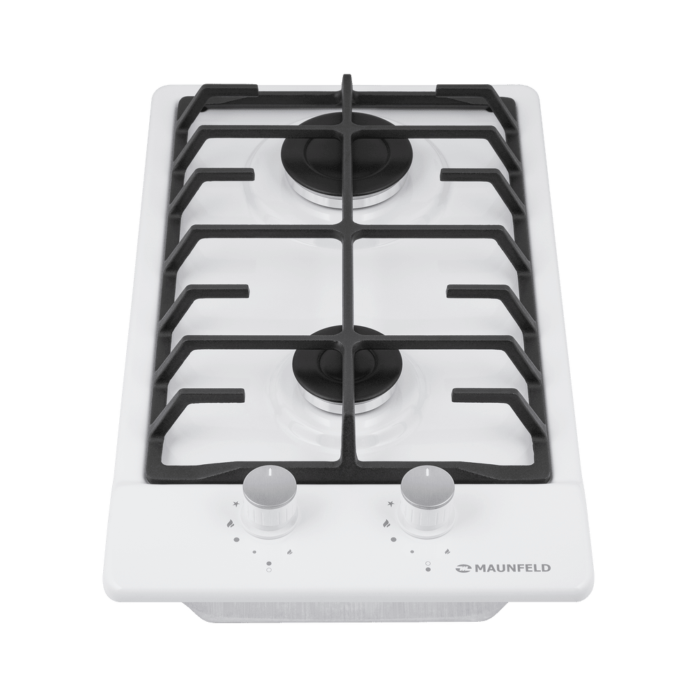 Панель выполнена из металла, покрытого термостойкой прочной эмалью белого цвета. В данной модели установлены высококачественные итальянские горелки «Sabaf». Две конфорки разного диаметра с мощностью 1700 Вт и 2600 Вт. Чугунная решетка имеет крестообразные соединения над конфорками, что позволяет готовить в посуде разного диаметра, не используя специальные подставки.