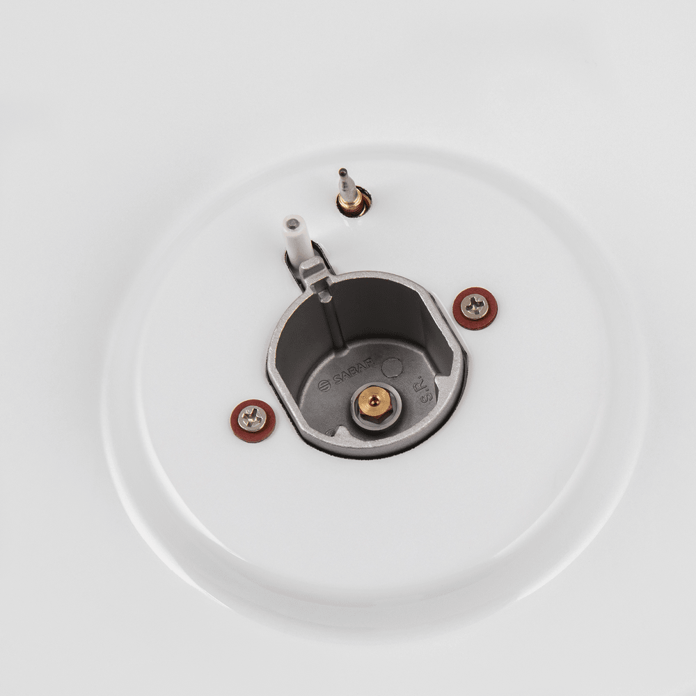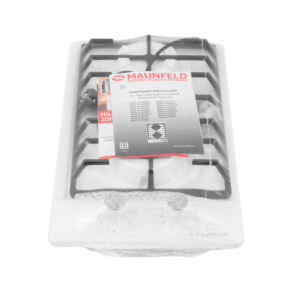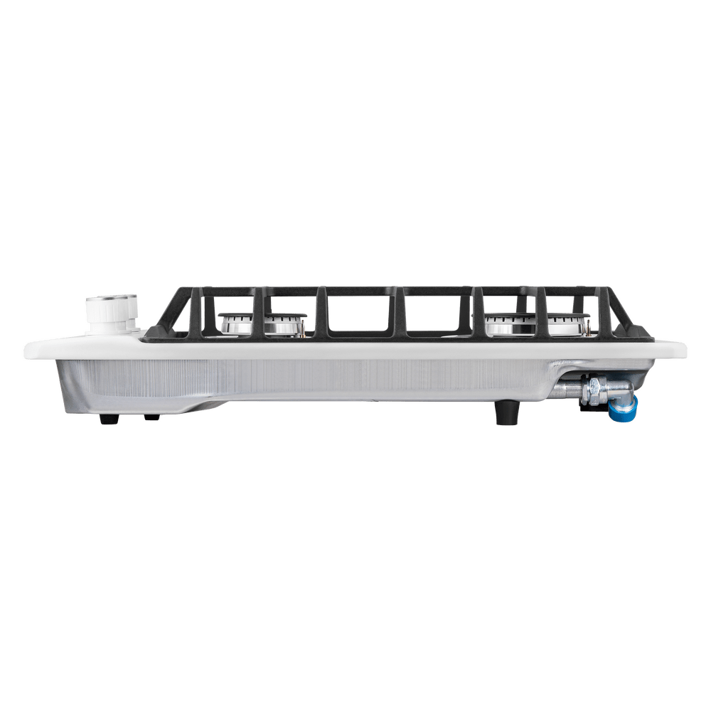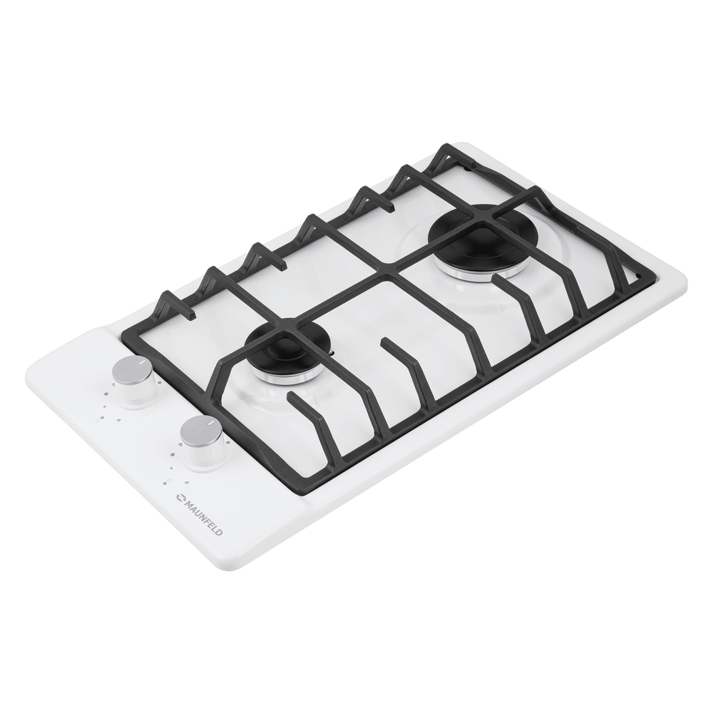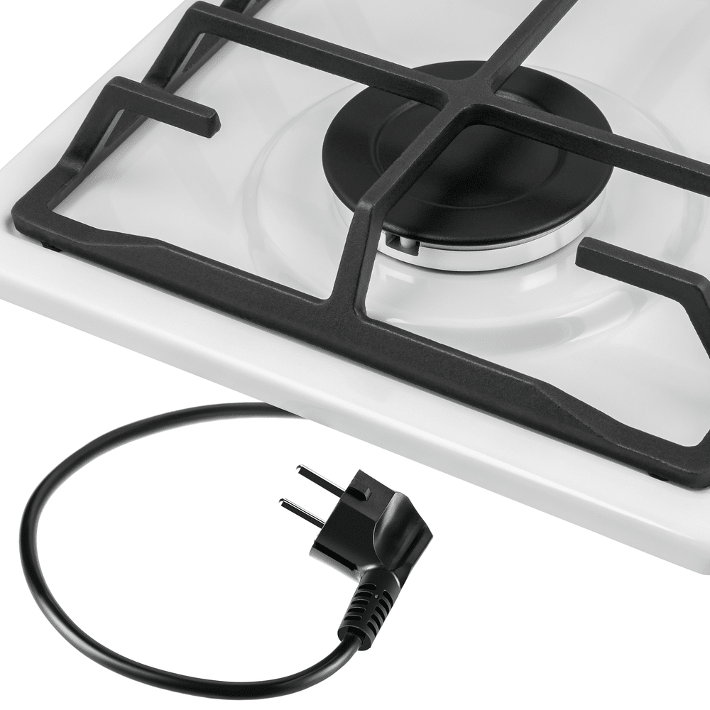 Панель выполнена из металла, покрытого термостойкой прочной эмалью белого цвета. В данной модели установлены высококачественные итальянские горелки «Sabaf». Две конфорки разного диаметра с мощностью 1700 Вт и 2600 Вт. Чугунная решетка имеет крестообразные соединения над конфорками, что позволяет готовить в посуде разного диаметра, не используя специальные подставки.