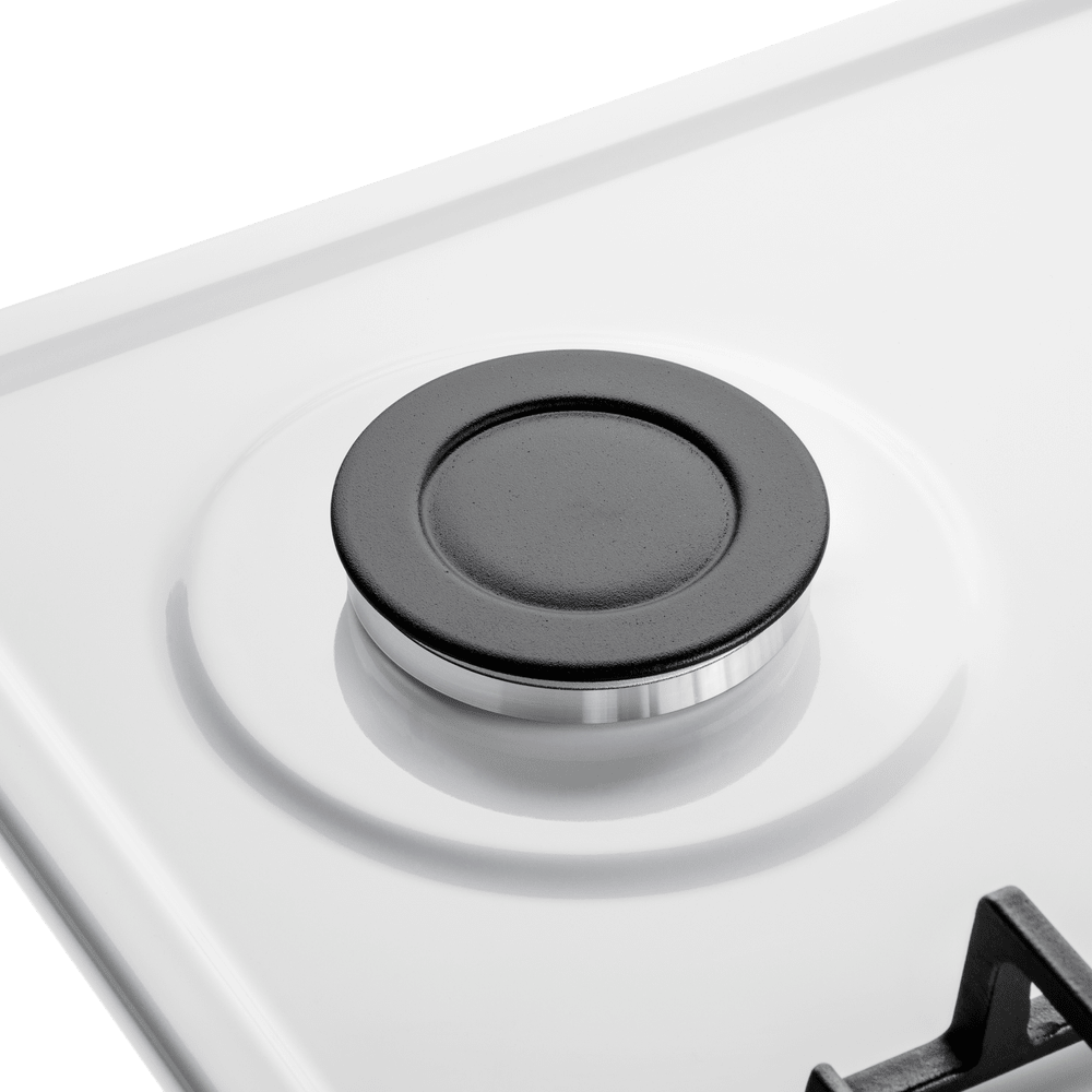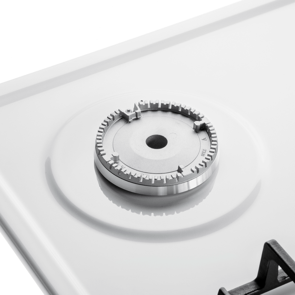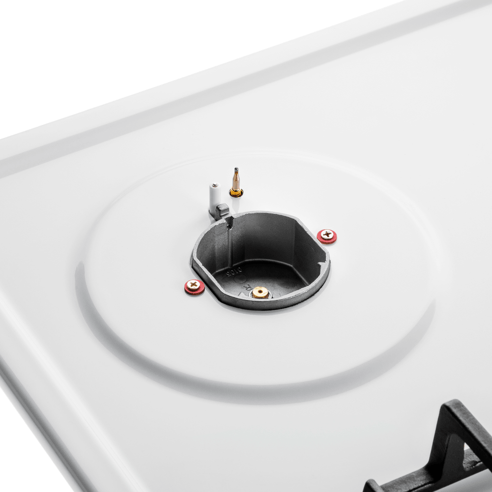 Панель выполнена из металла, покрытого термостойкой прочной эмалью белого цвета. Четыре стандартные итальянские конфорки SABAF мощностью 1000 Вт, 1700 Вт, 1700 Вт и 2600 Вт спроектированы таким образом, что огонь не перегревает ни чугунные решетки, ни ручки управления.