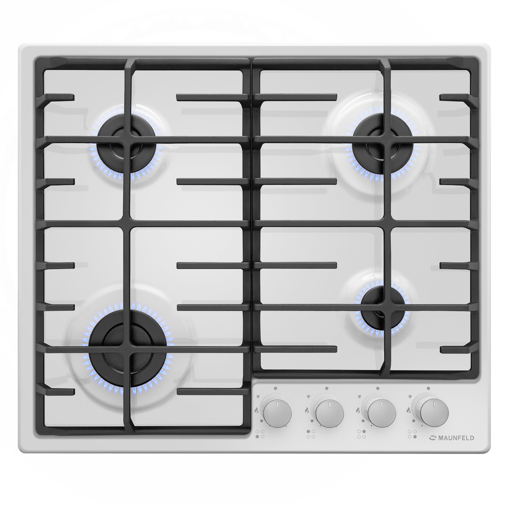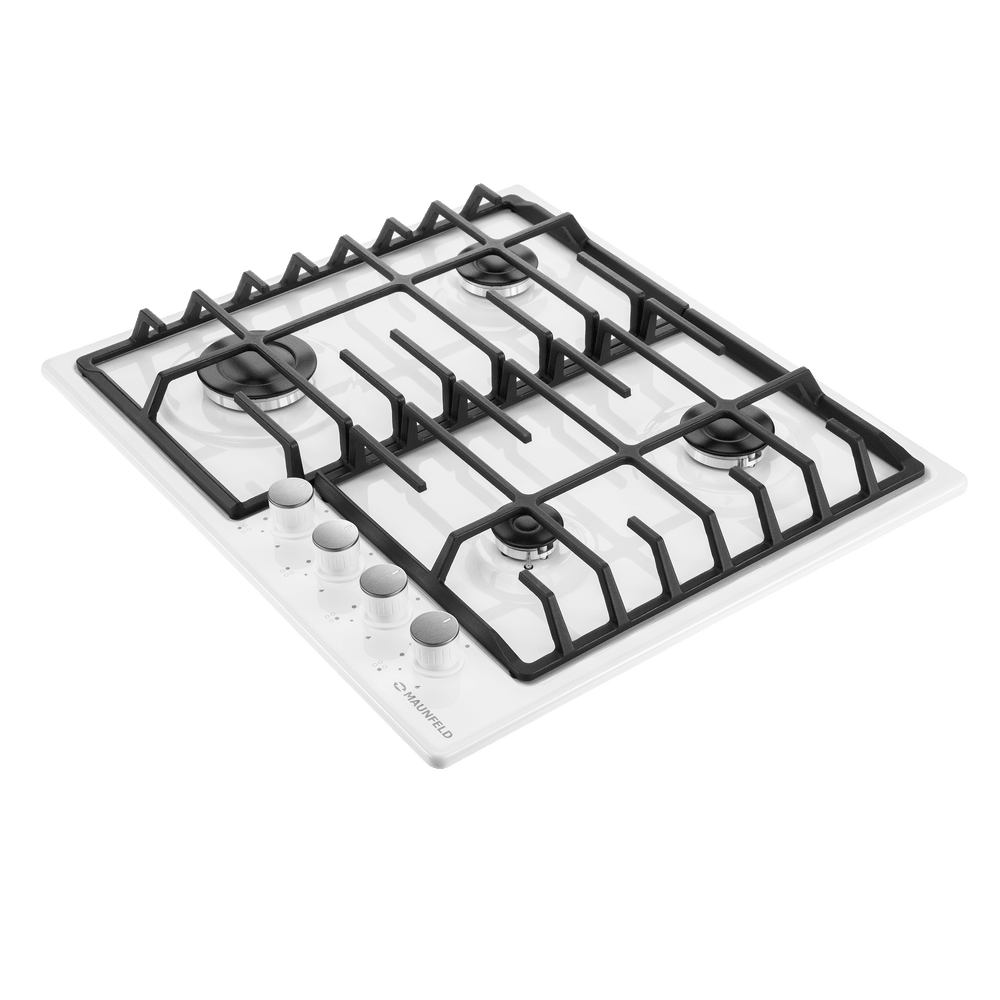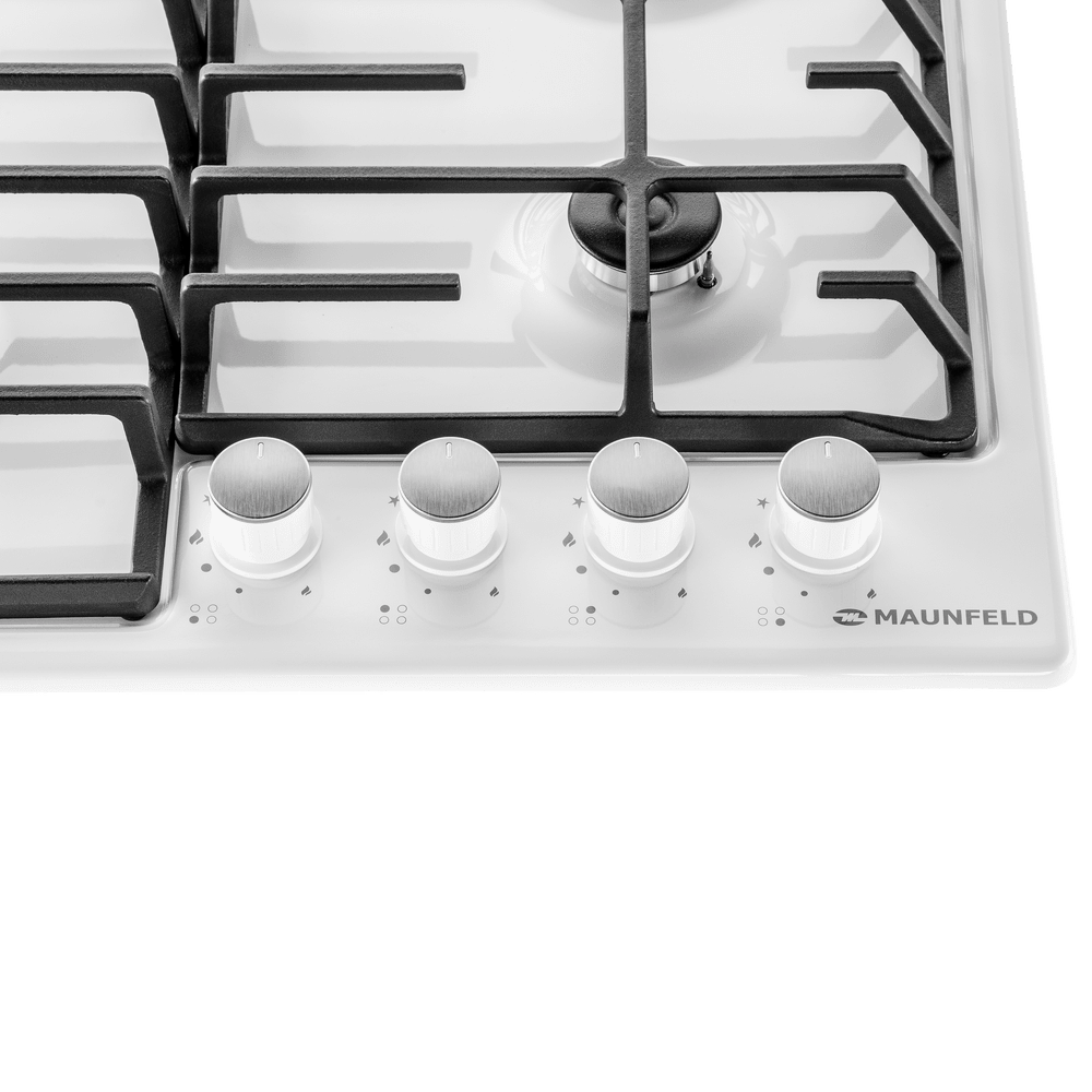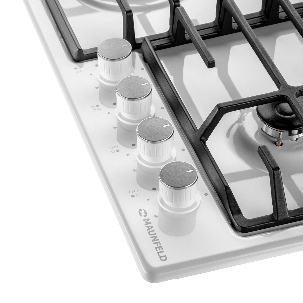 Панель выполнена из металла, покрытого термостойкой прочной эмалью белого цвета. Четыре стандартные итальянские конфорки SABAF мощностью 1000 Вт, 1700 Вт, 1700 Вт и 2600 Вт спроектированы таким образом, что огонь не перегревает ни чугунные решетки, ни ручки управления.