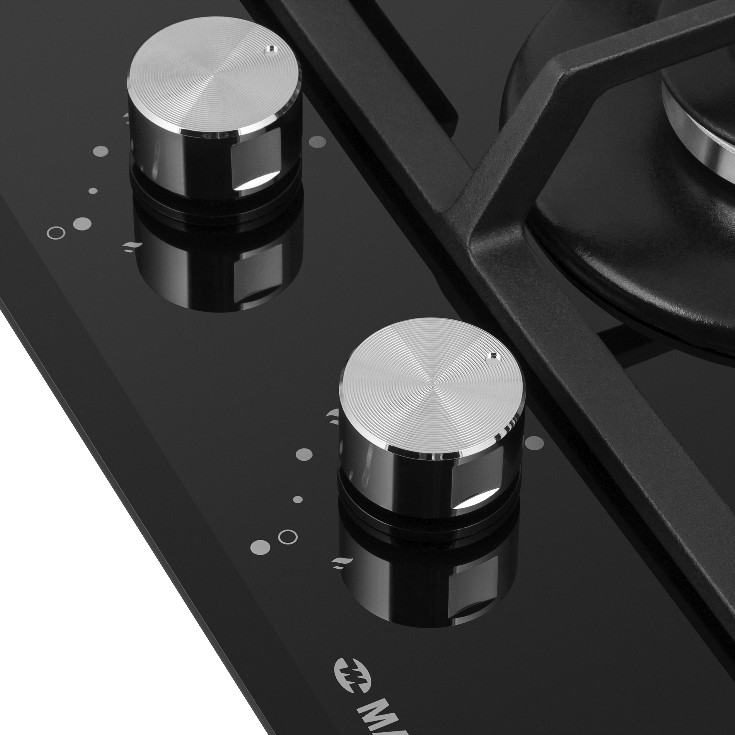 Регулирование подачи газа и электроподжиг конфорок происходит с помощью поворотных цельнометаллических ручек. Для простоты использования около каждой ручки нанесены информационные изображения: используемая конфорка, подача газа выключена, электроподжиг, максимальное пламя и минимальное пламя.