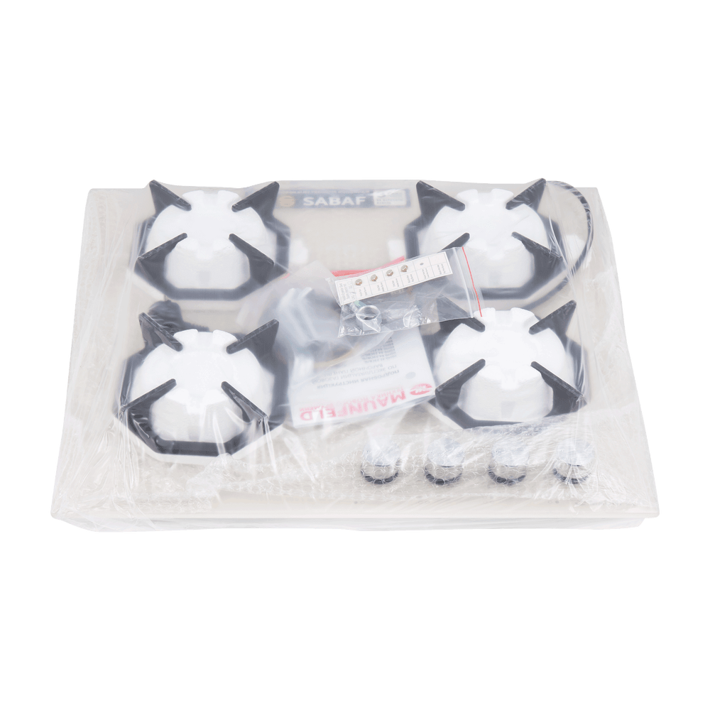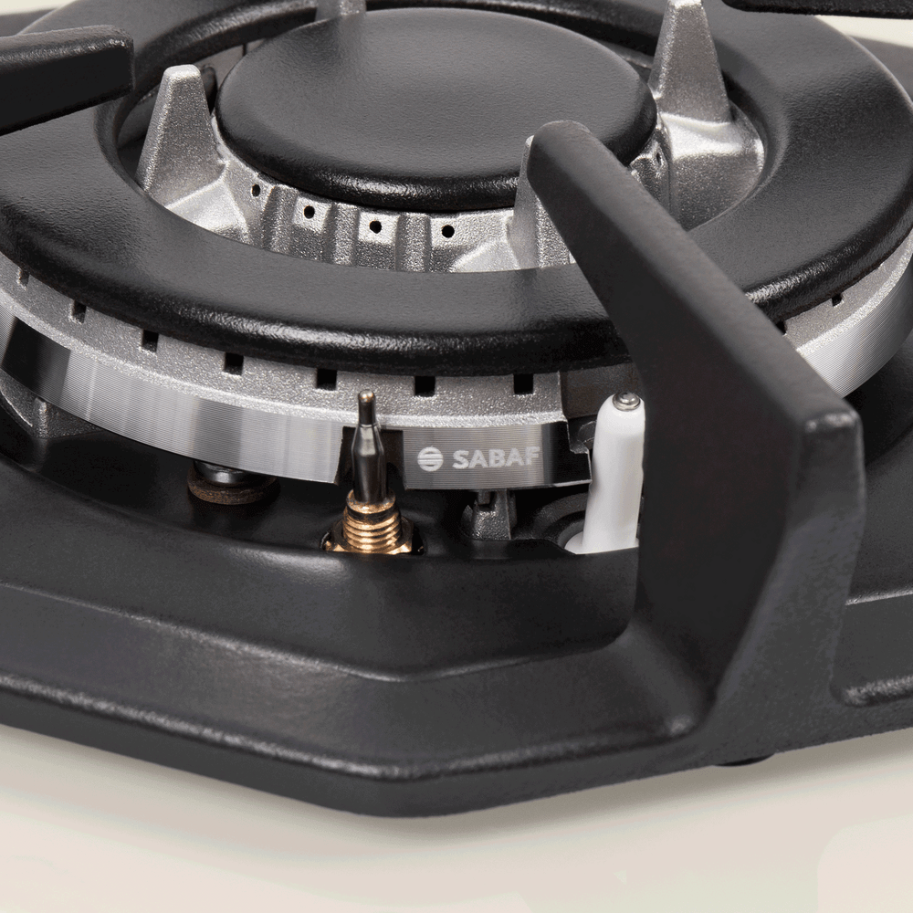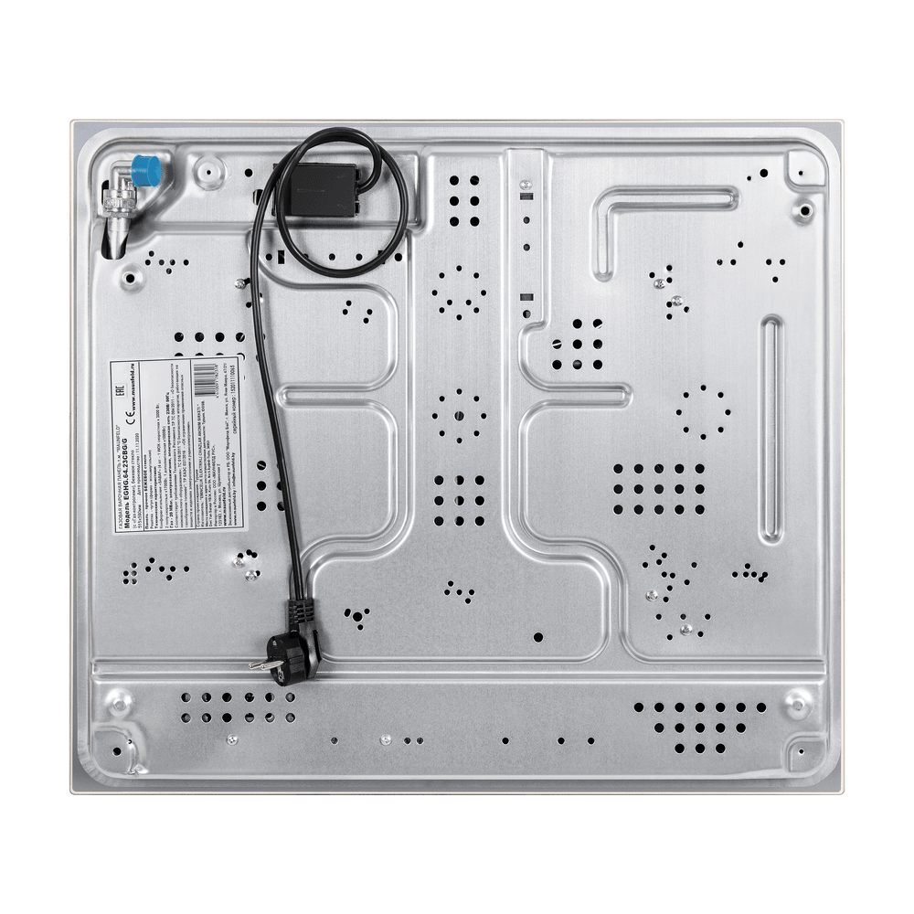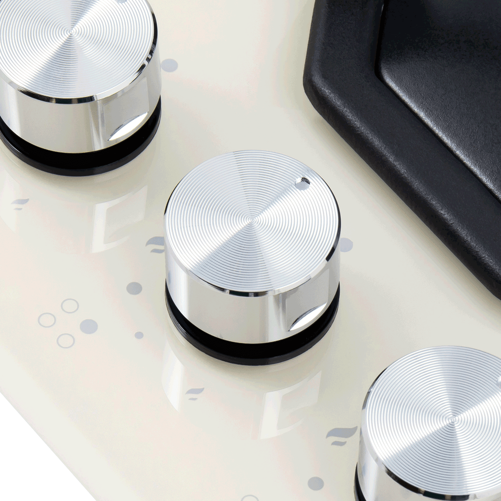 Панель выполнена из закаленного стекла бежевого цвета. В данной модели установлены высококачественные итальянские горелки «Sabaf». Три стандартные конфорки мощностью 1000 Вт, 1700 Вт, 1700 Вт и одна мощная WOK-конфорка с двойным пламенем мощностью 3000 Вт.