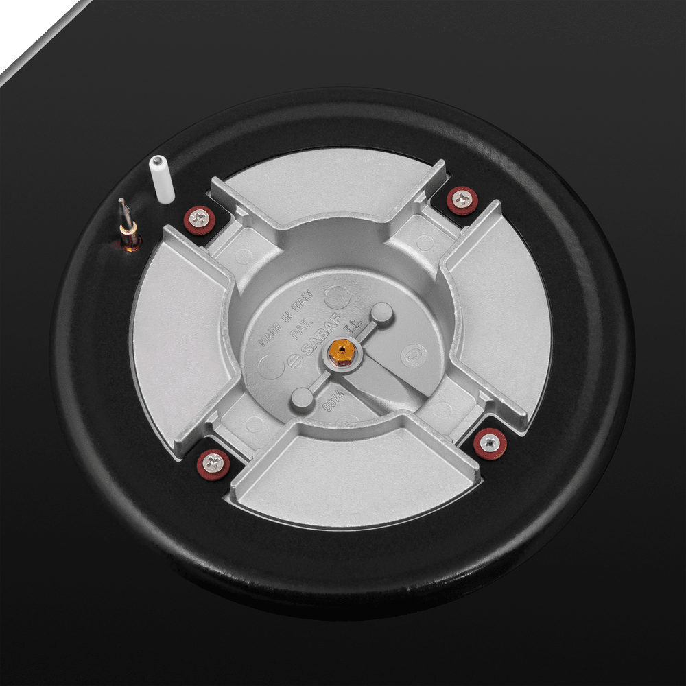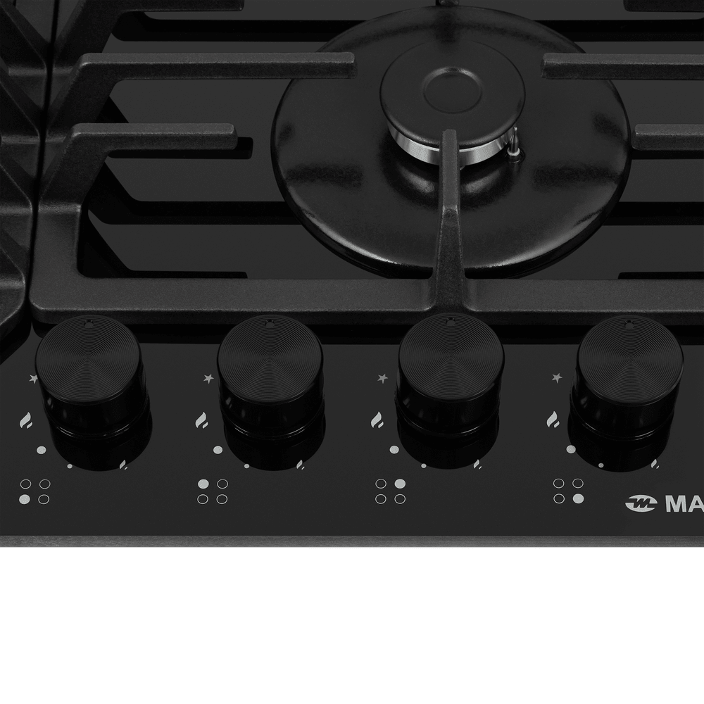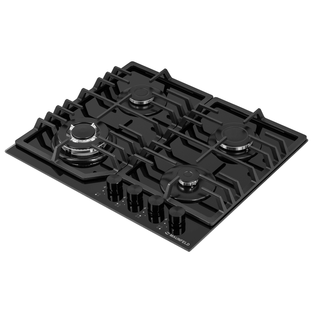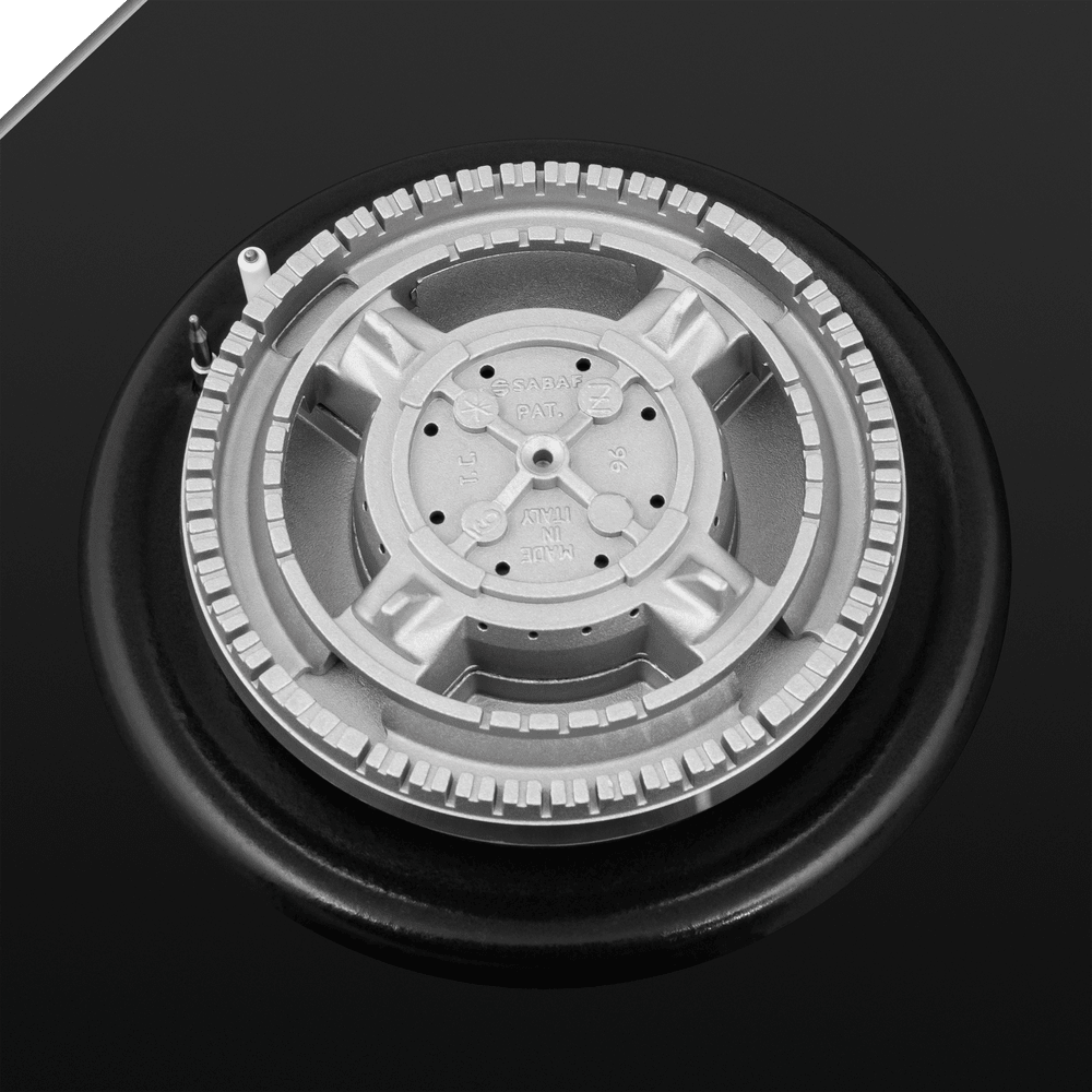 Панель черного цвета выполнена из закаленного стекла, устойчивого к царапинам, сколам и постоянным перепадам температур. В данной модели установлены высококачественные итальянские горелки SABAF. Три стандартные конфорки мощностью 1000 Вт, 1700 Вт, 1700 Вт и одна сверхмощная WOK-конфорка (3800 Вт) с двойным пламенем, спроектированные таким образом, что огонь не перегревает ни чугунные решетки, ни ручки управления.