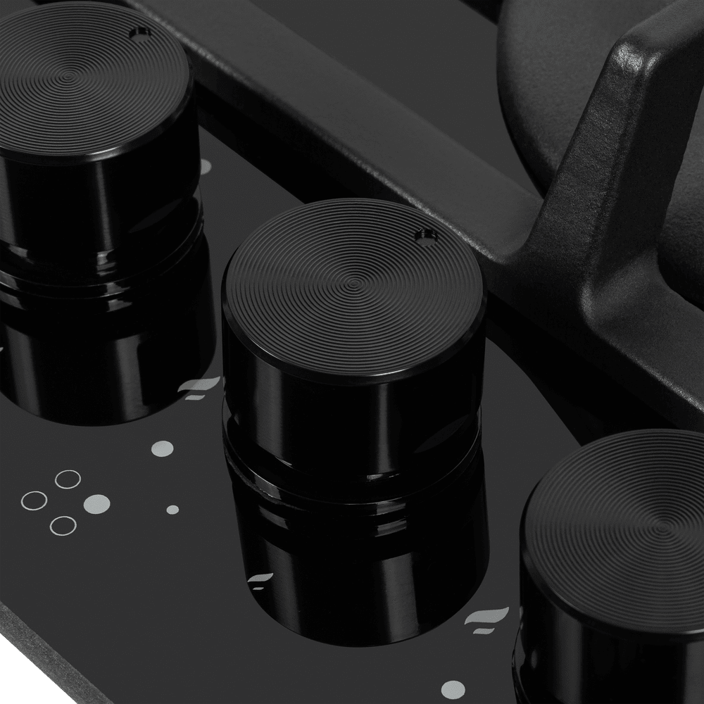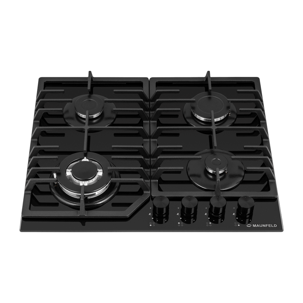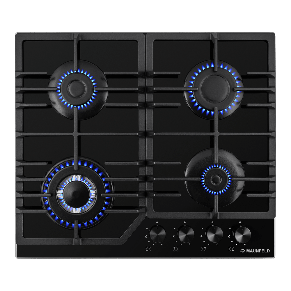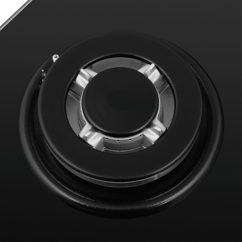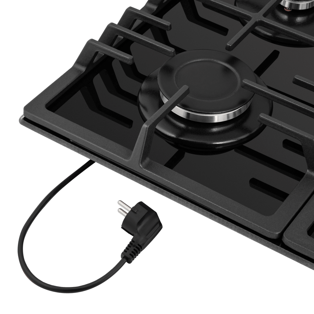 Панель черного цвета выполнена из закаленного стекла, устойчивого к царапинам, сколам и постоянным перепадам температур. В данной модели установлены высококачественные итальянские горелки SABAF. Три стандартные конфорки мощностью 1000 Вт, 1700 Вт, 1700 Вт и одна сверхмощная WOK-конфорка (3800 Вт) с двойным пламенем, спроектированные таким образом, что огонь не перегревает ни чугунные решетки, ни ручки управления.