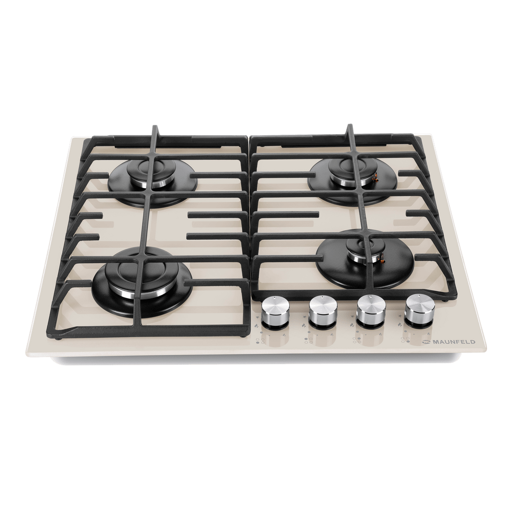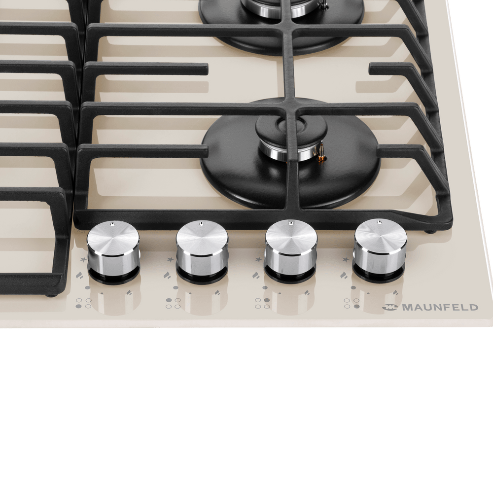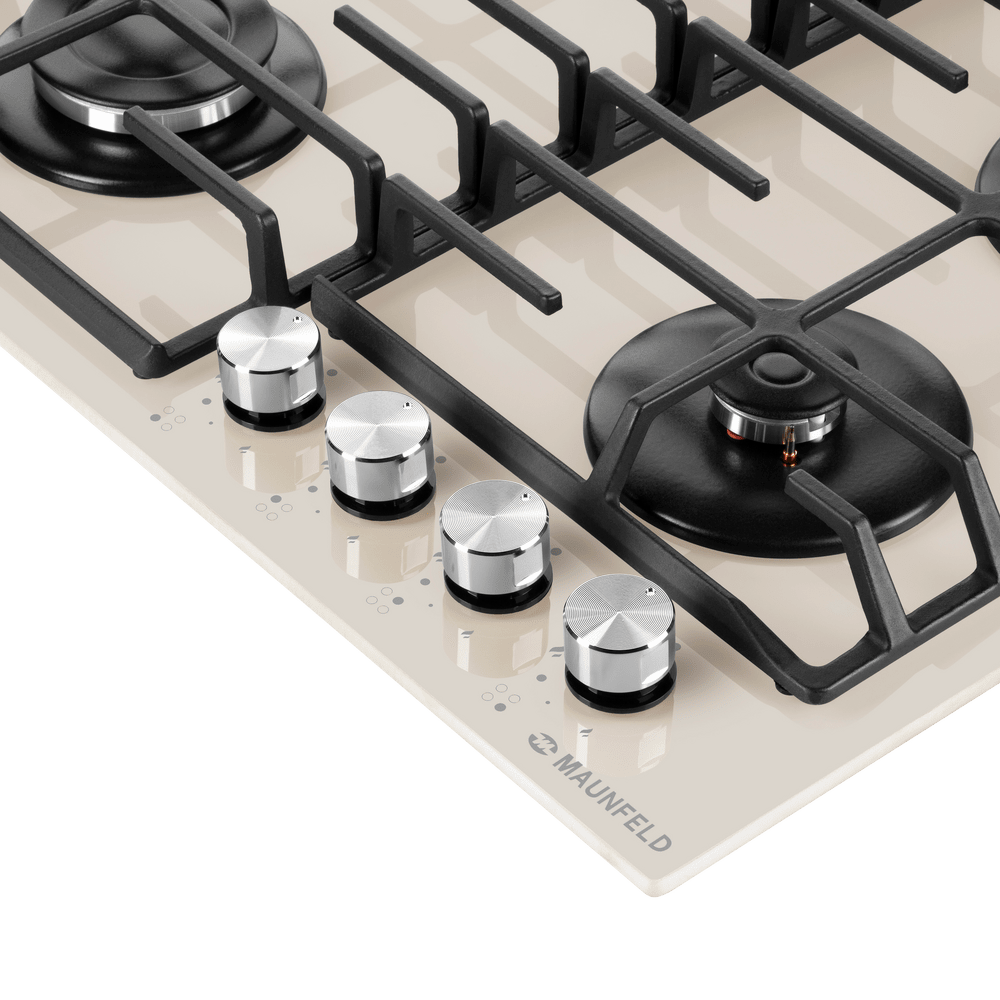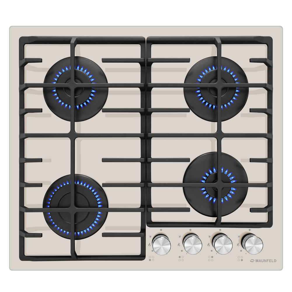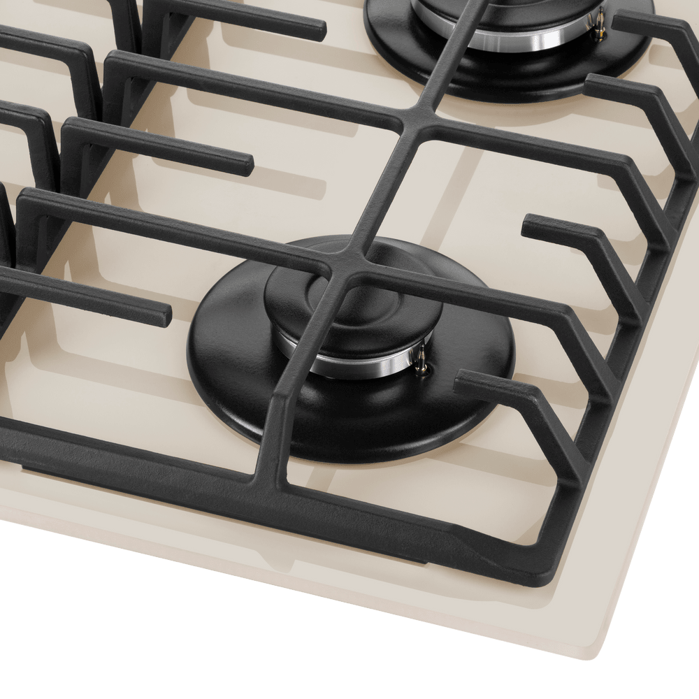 Панель выполнена из закаленного стекла бежевого цвета. В данной модели установлены высококачественные итальянские горелки SABAF. Четыре стандартные конфорки мощностью 1000 Вт, 1700 Вт, 1700 Вт и 2600 Вт спроектированы таким образом, что огонь не перегревает ни чугунные решетки, ни ручки управления.
