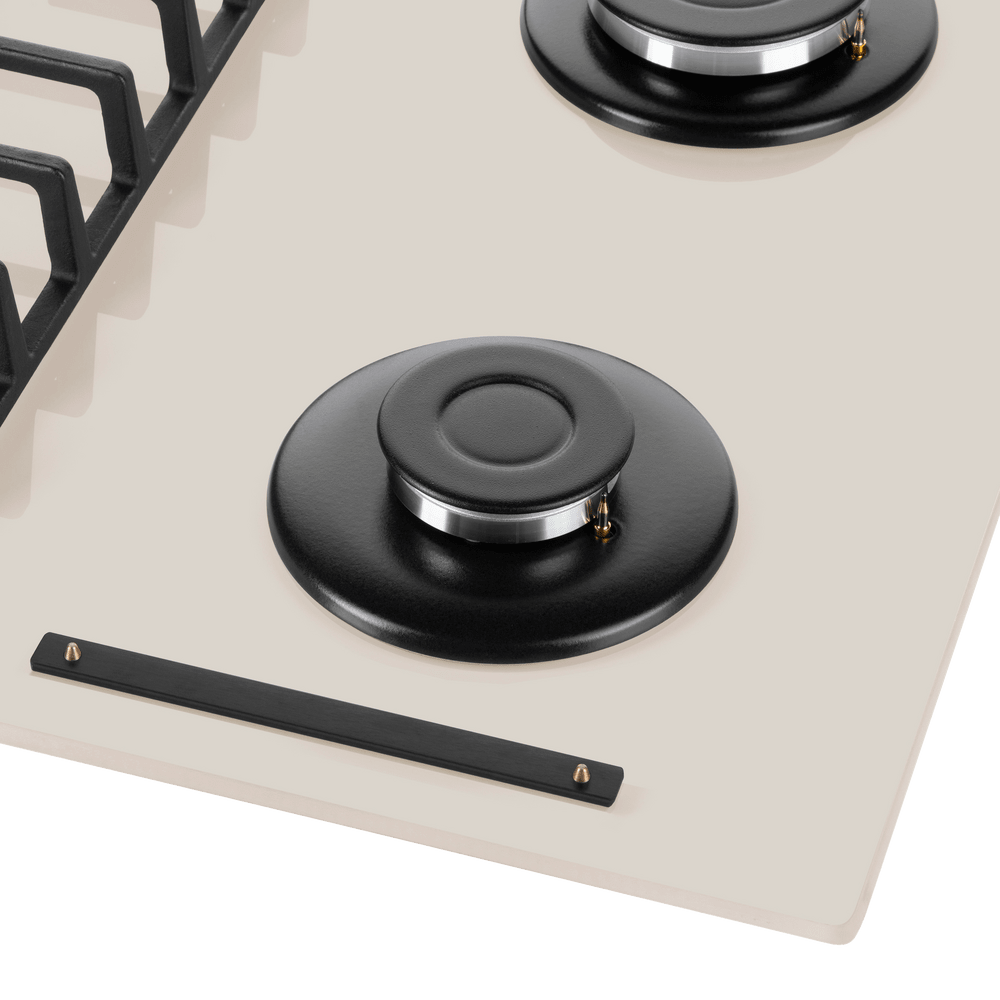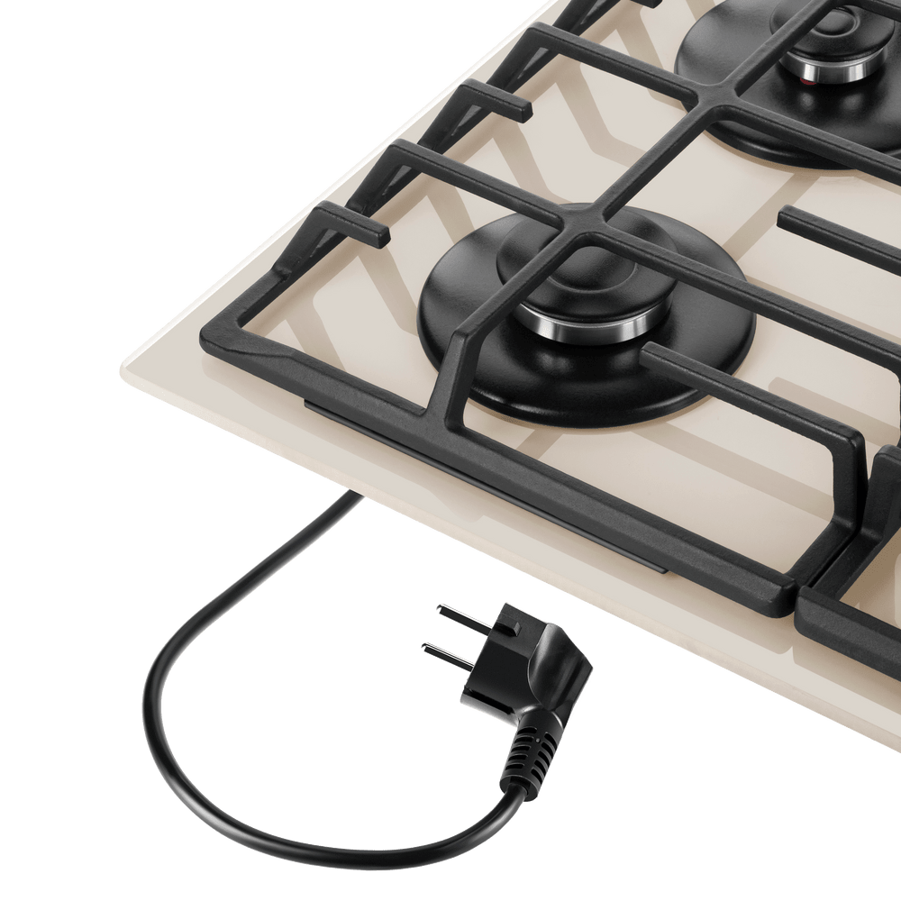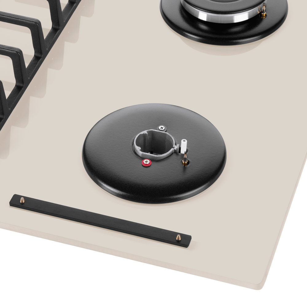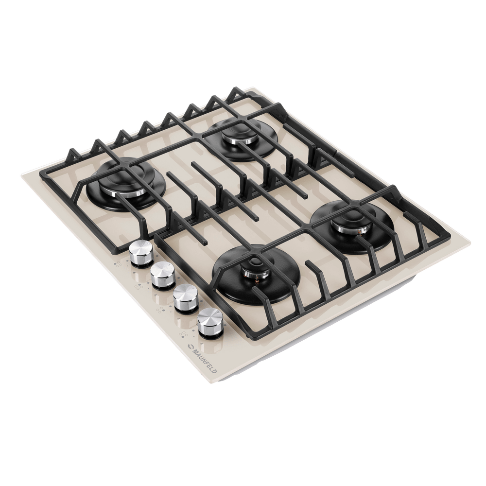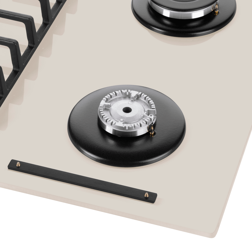 Панель выполнена из закаленного стекла бежевого цвета. В данной модели установлены высококачественные итальянские горелки SABAF. Четыре стандартные конфорки мощностью 1000 Вт, 1700 Вт, 1700 Вт и 2600 Вт спроектированы таким образом, что огонь не перегревает ни чугунные решетки, ни ручки управления.