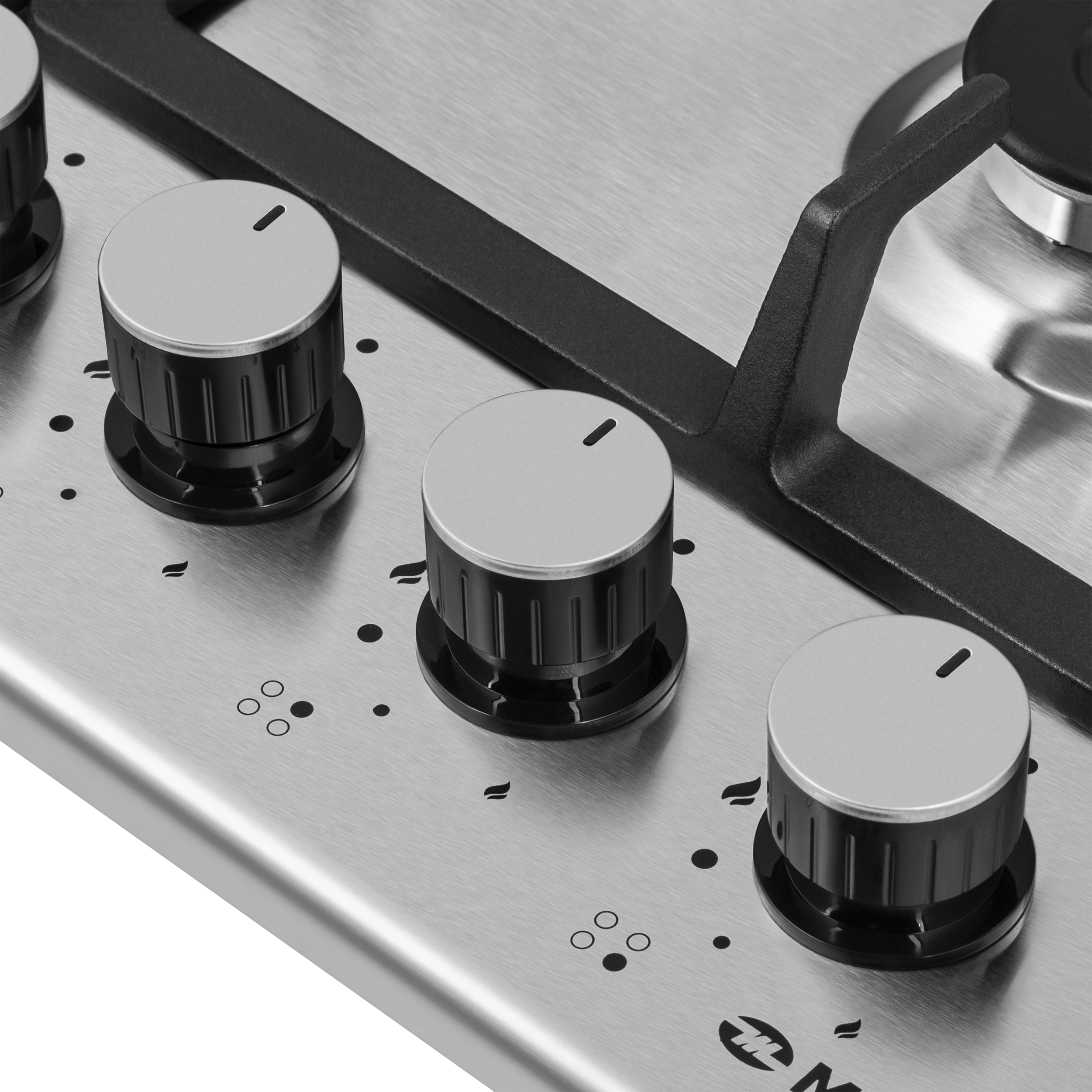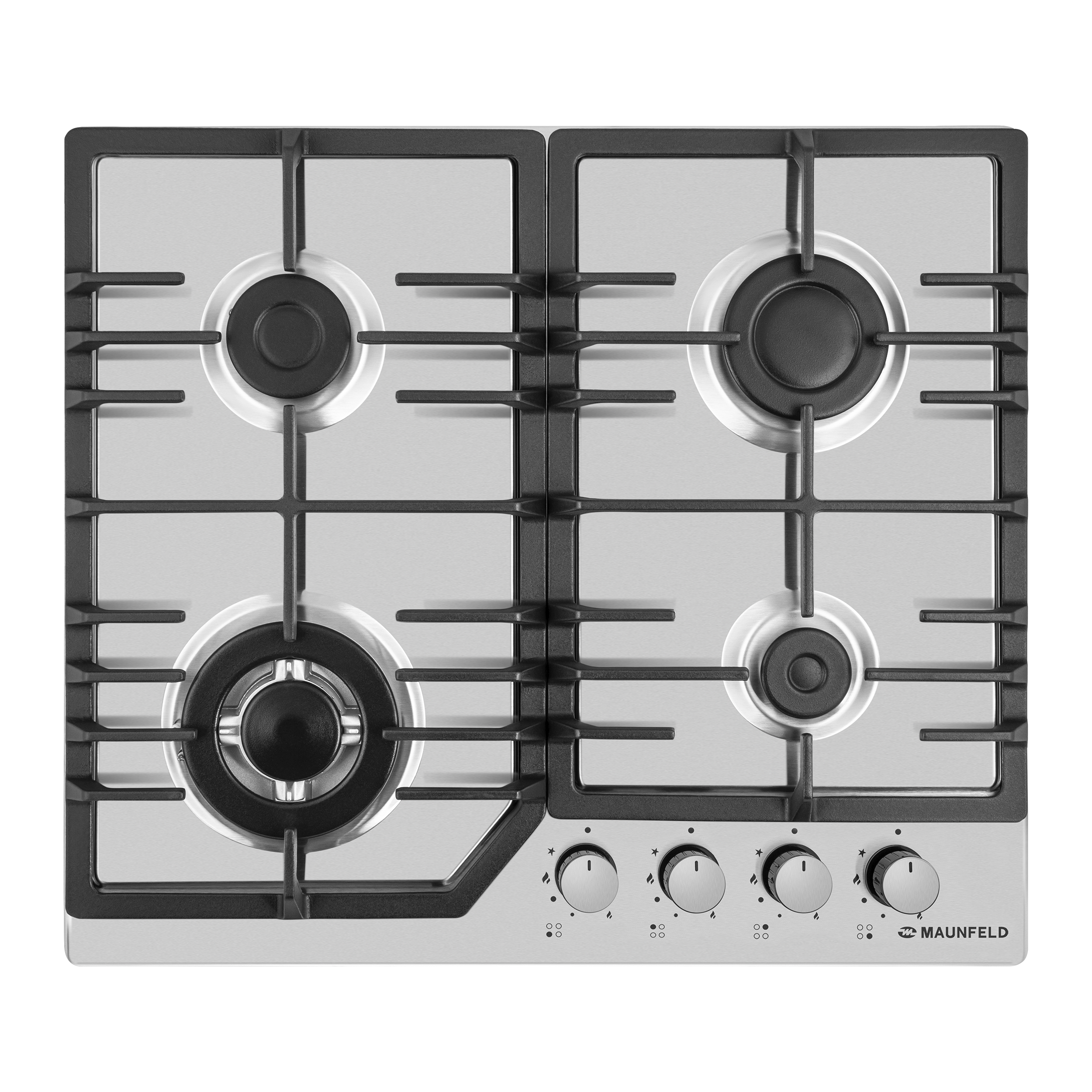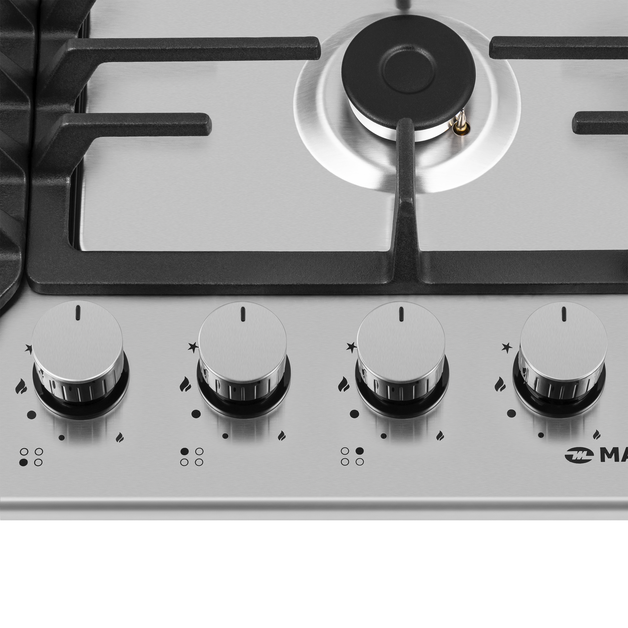 Панель выполнена нержавеющей стали. В данной модели установлены высококачественные итальянские горелки SABAF. Три стандартные конфорки мощностью 1000 Вт, 1700 Вт, 1700 Вт и 1 сверхмощная WOK-конфорка с двойным пламенем мощностью 3800 Вт.
