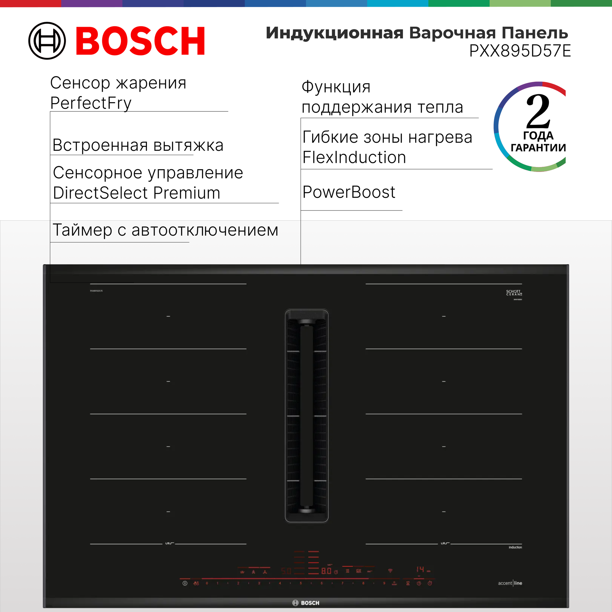 Индукционная варочная панель Bosch PXX875D57E оснащена FlexInduction , на которой найдётся место для посуды любого размера, формы. Инфракрасный сенсор варки PerfectCook может быть дополнительно установлен для избежания пригорания и выкипания благодаря точному контролю температуры приготовления. Модель так же предусматривает безопасное отключение по времени, замок, защиту от детей , индикацию кастрюли, функцию управления питанием.