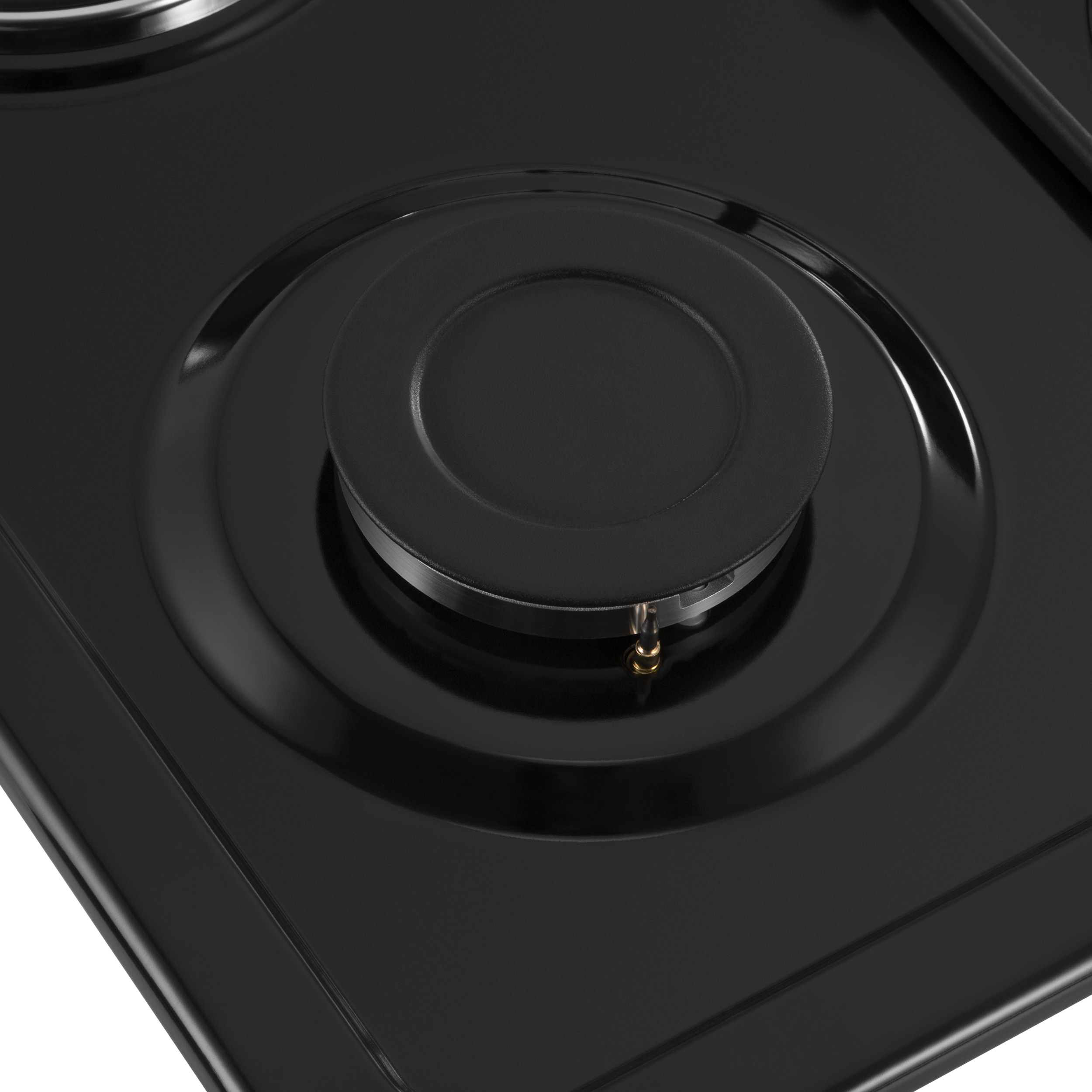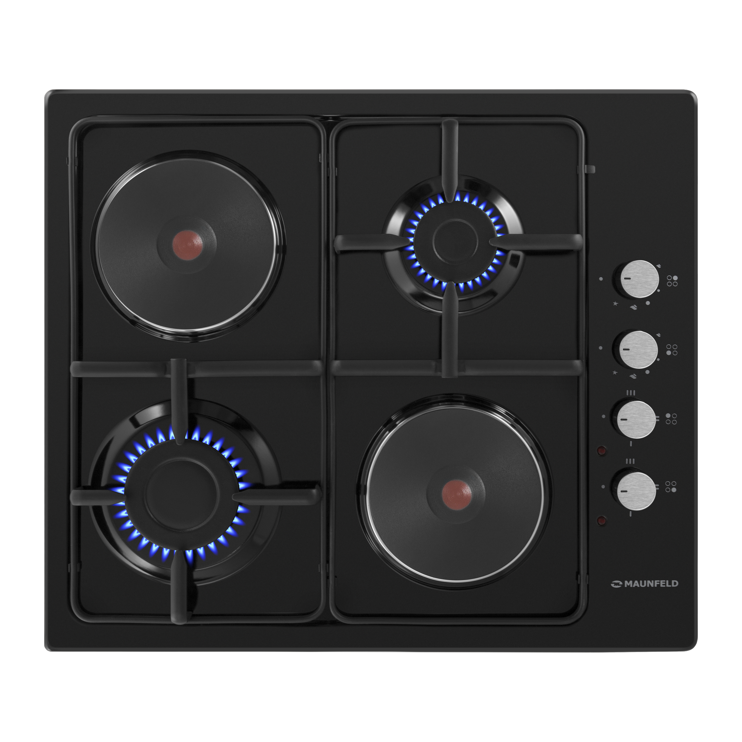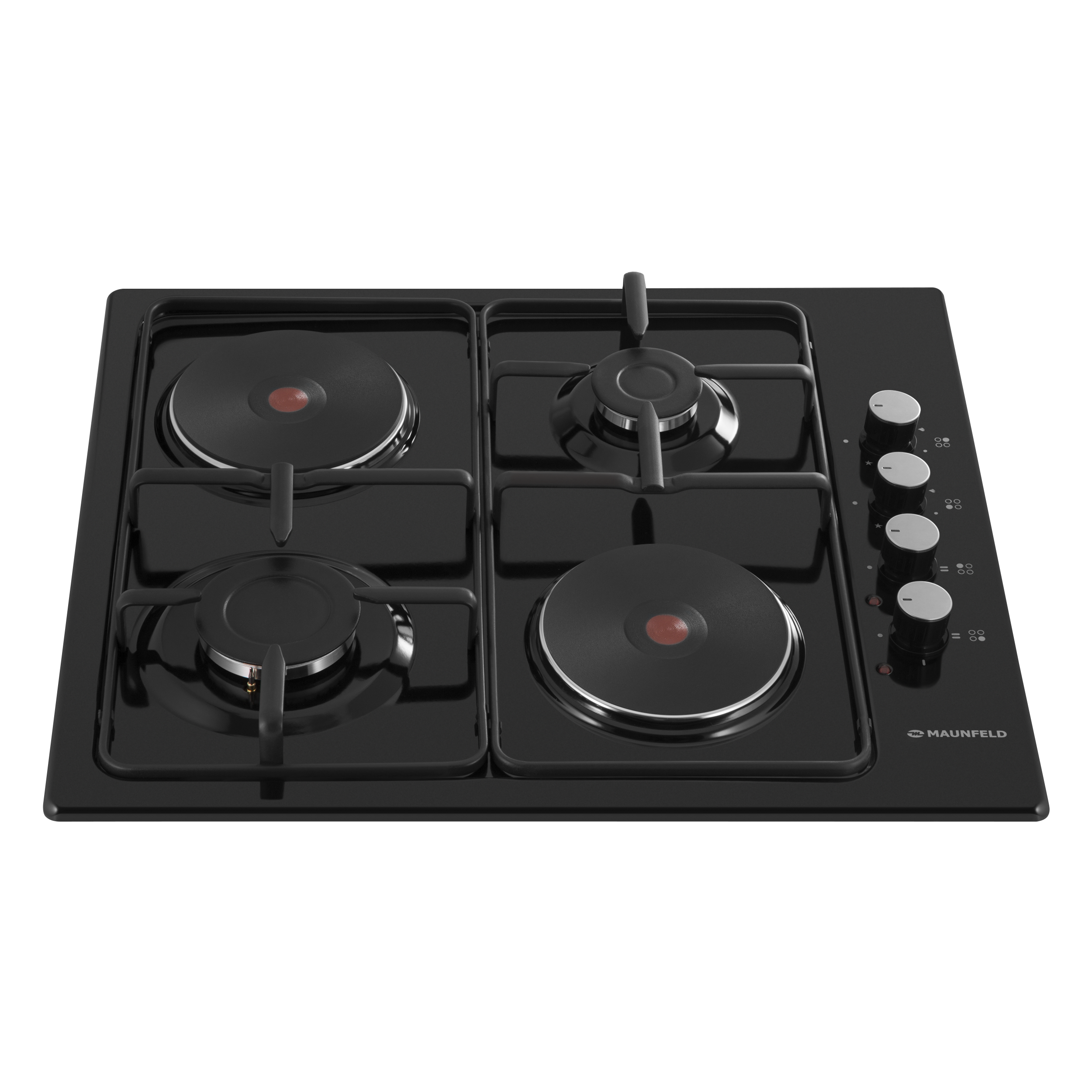 Две эмалированные решетки черного цвета надежно защищают газовые горелки и не мешают при использовании электрических конфорок.