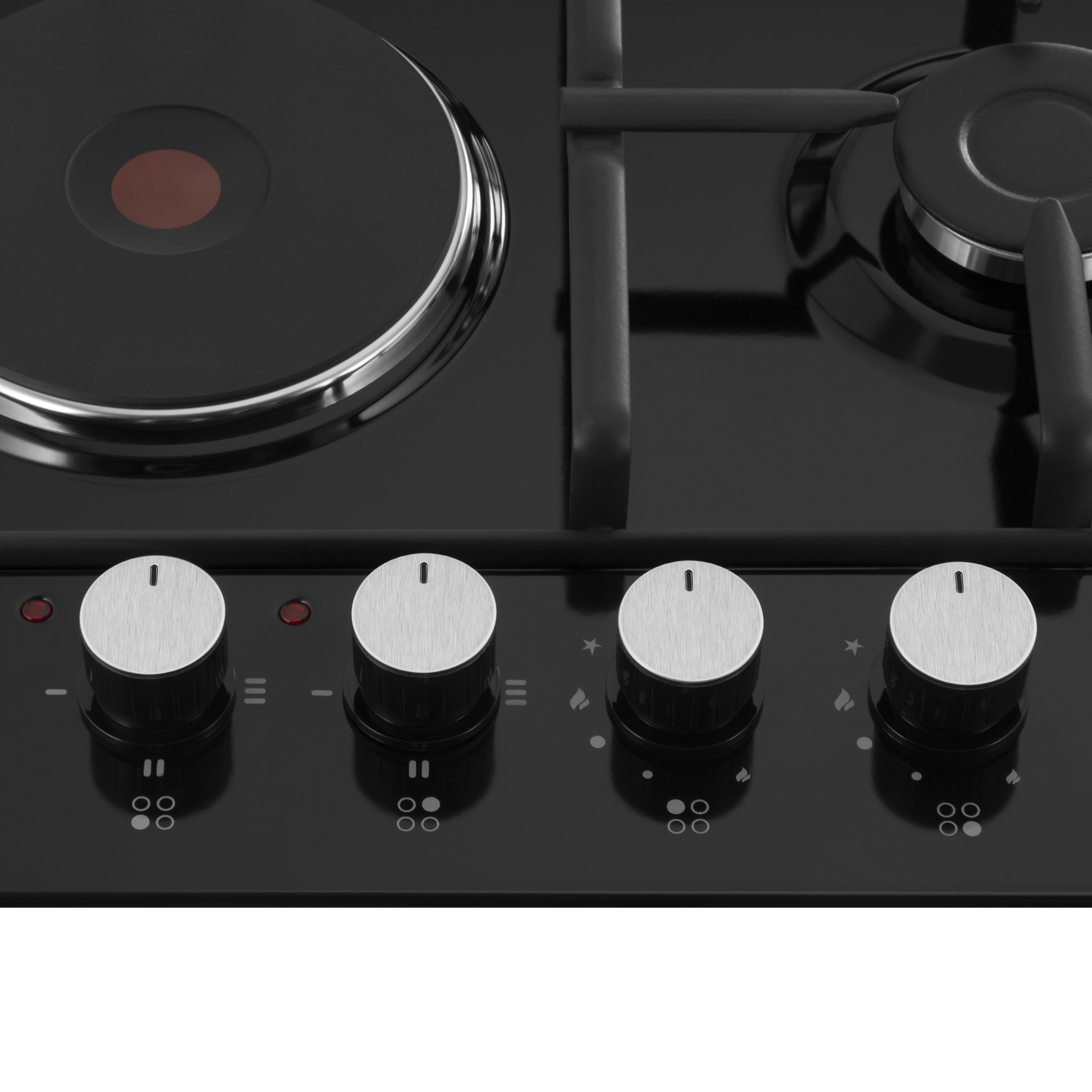 Включение электроконфорок, подача газа и электроподжиг производится с помощью поворотных полнотелых цельнометаллических ручек, расположенных сбоку панели. Около каждой ручки есть пиктограммы: используемая конфорка, конфорка выключена, электроподжиг, максимальная мощность и минимальная мощность.