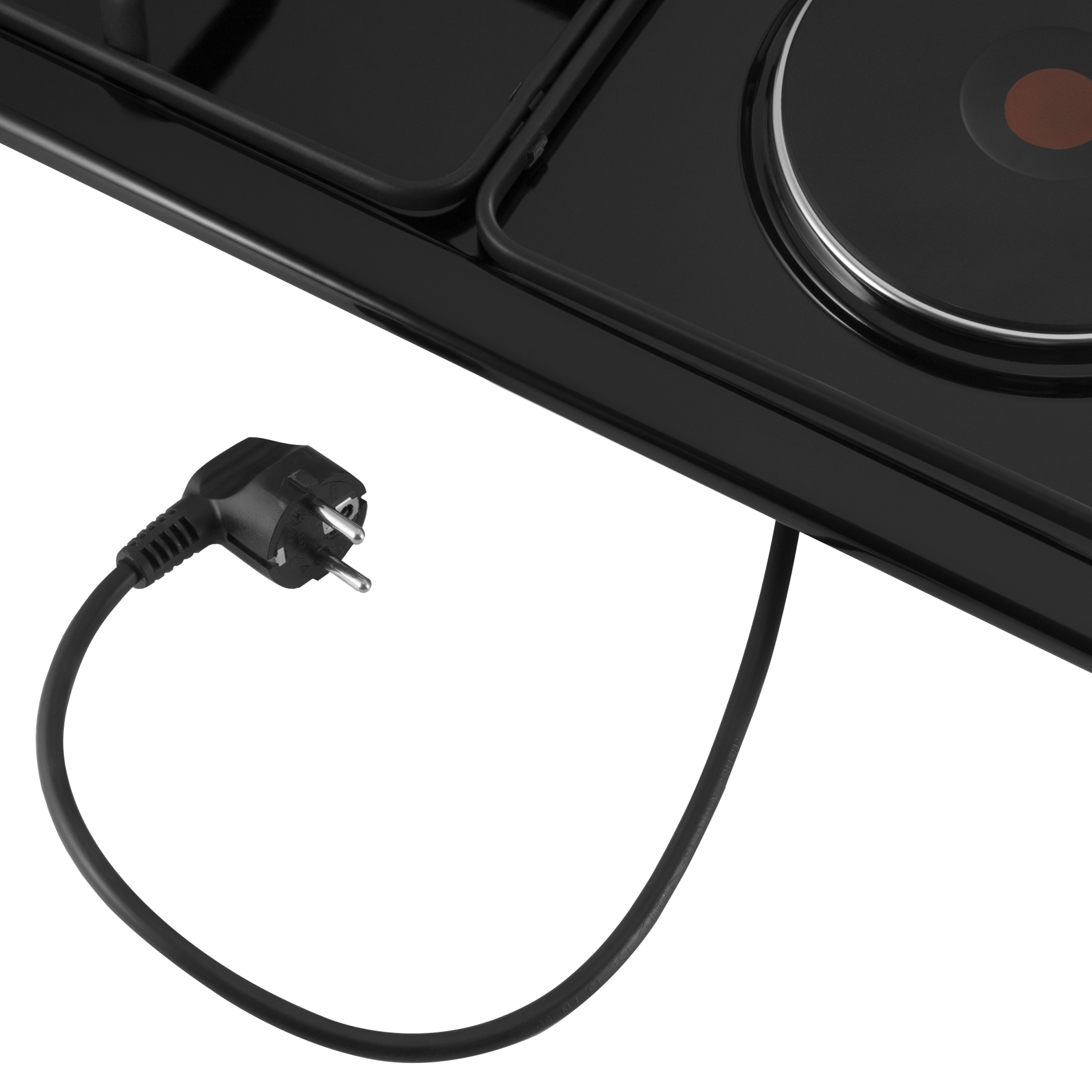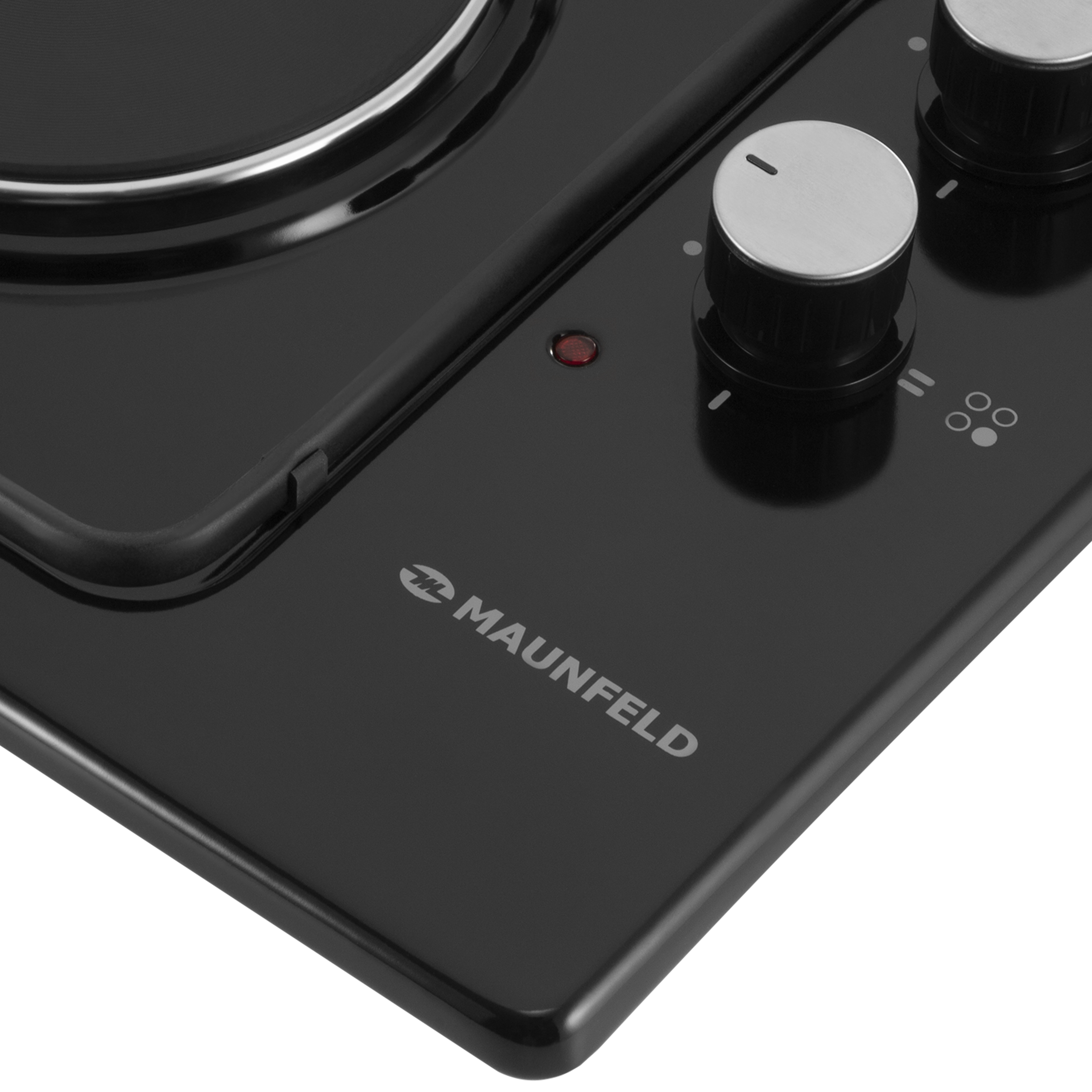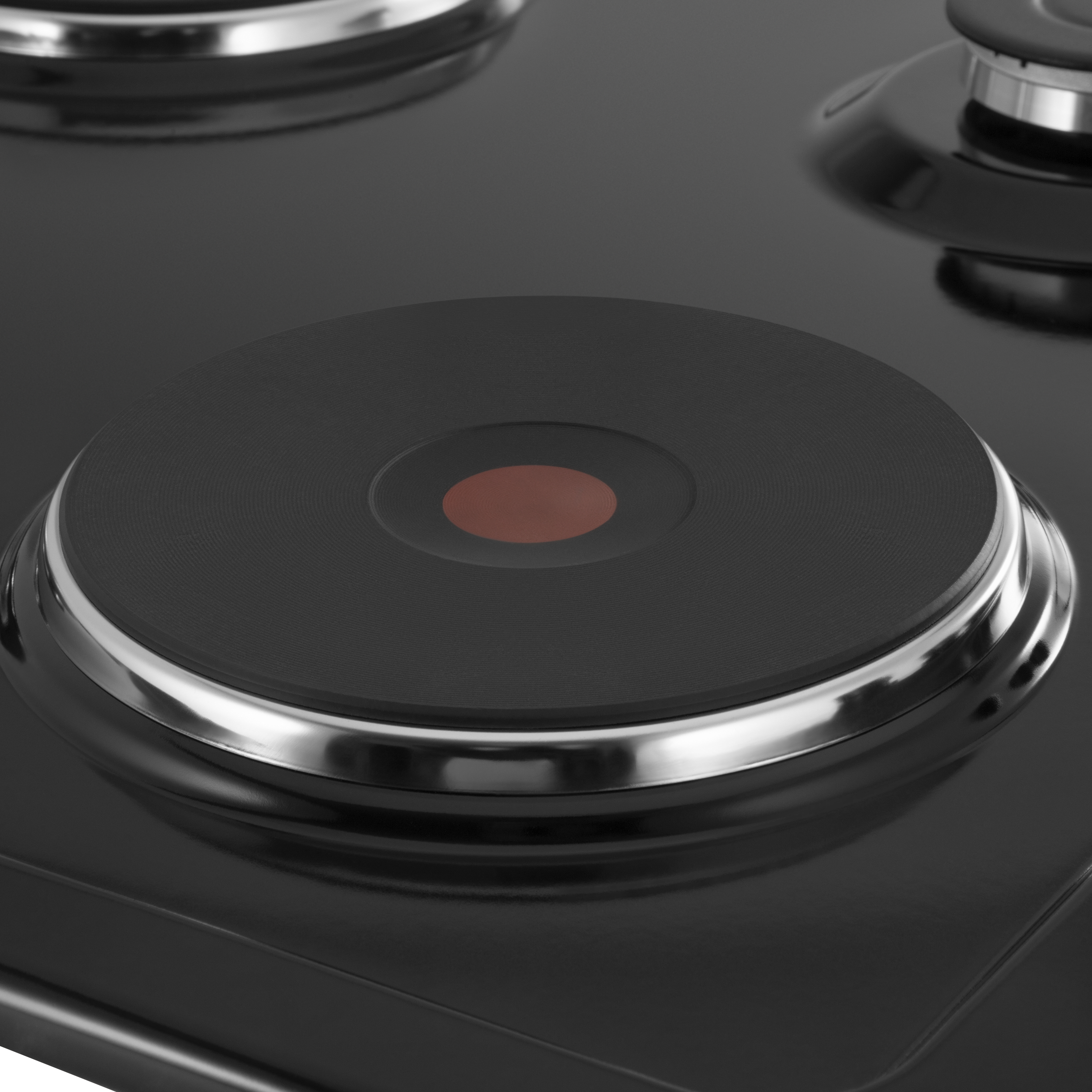 Две электрические HP RAPID конфорки диаметром 180 мм и мощностью 1500 Вт каждая. Выполнены из чугуна со стальной окантовкой. Красный круг по центру каждой конфорки – индикатор нагрева.