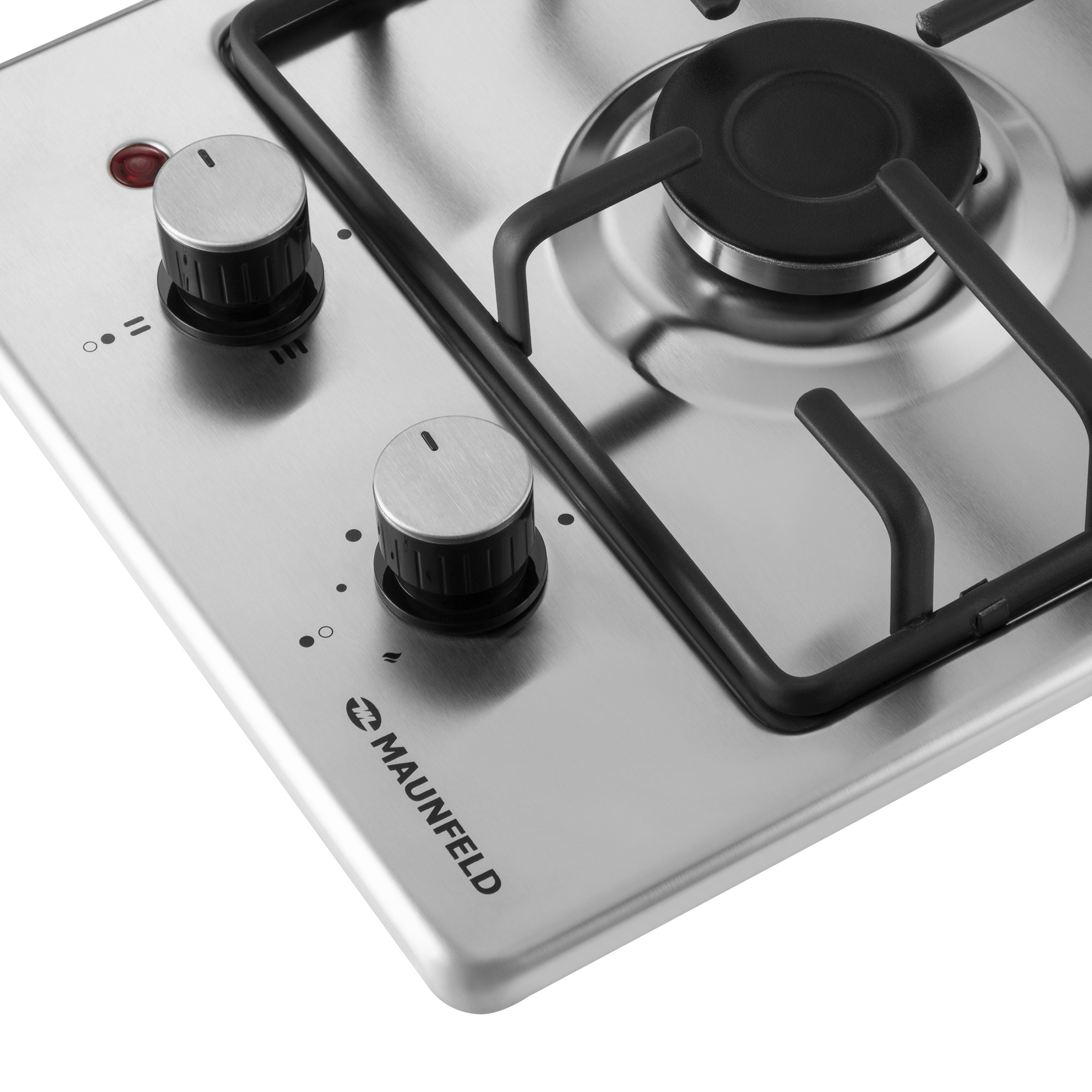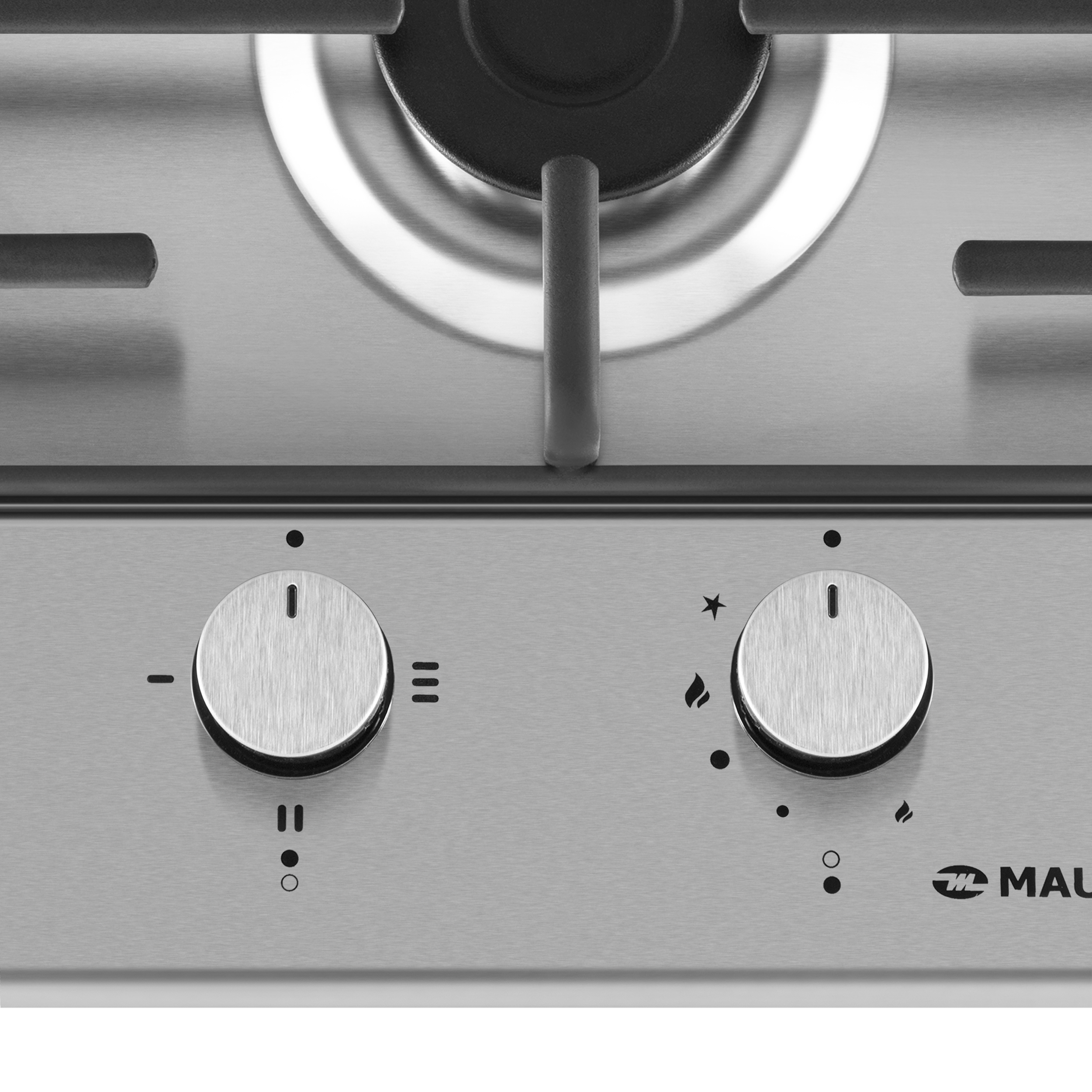 Включение электроконфорки, подача газа и электроподжиг производится с помощью поворотных полнотелых цельнометаллических ручек, располагающихся в нижней части газовой половины варочной панели. Около каждой ручки есть пиктограммы: используемая конфорка, конфорка выключена, электроподжиг, максимальная мощность и минимальная мощность.