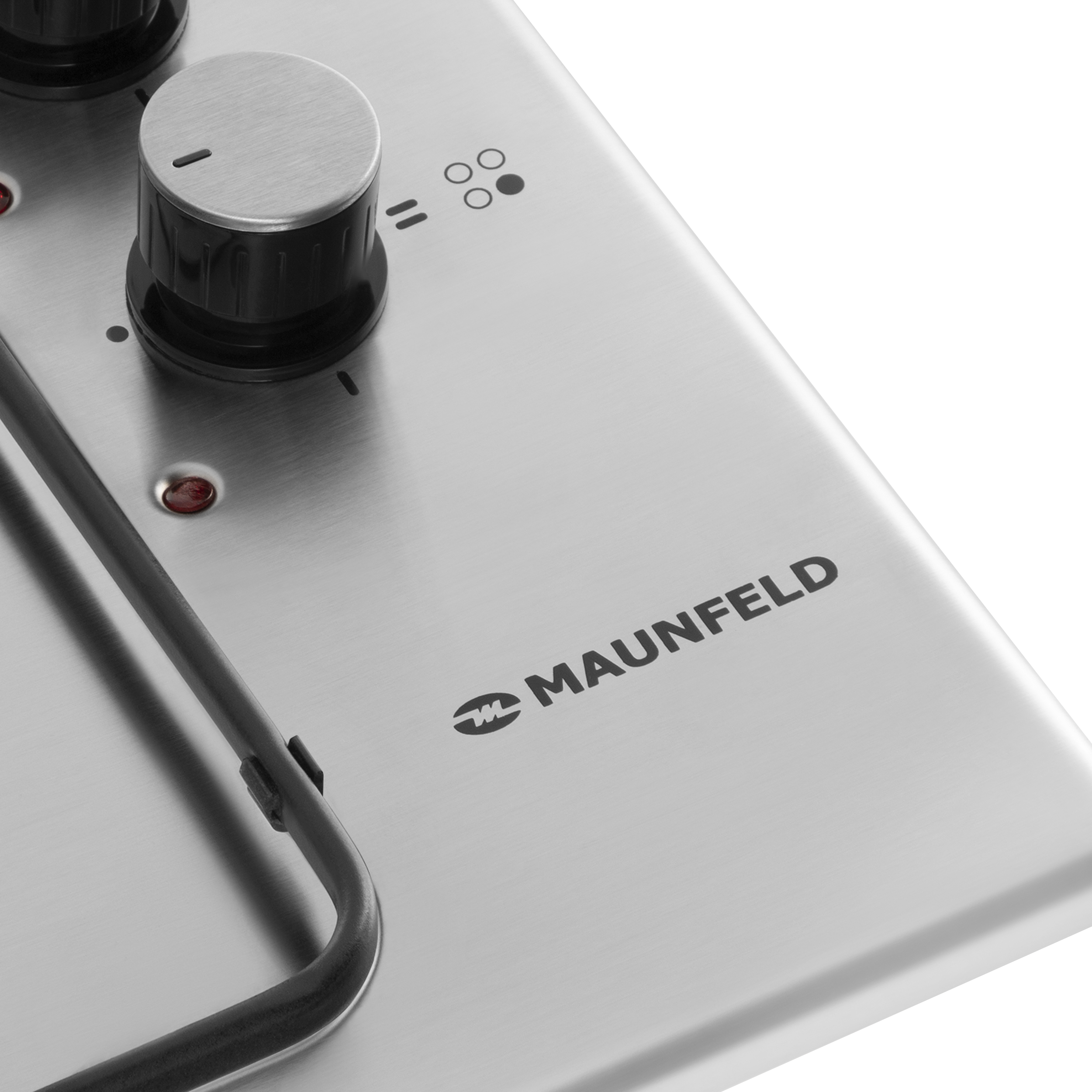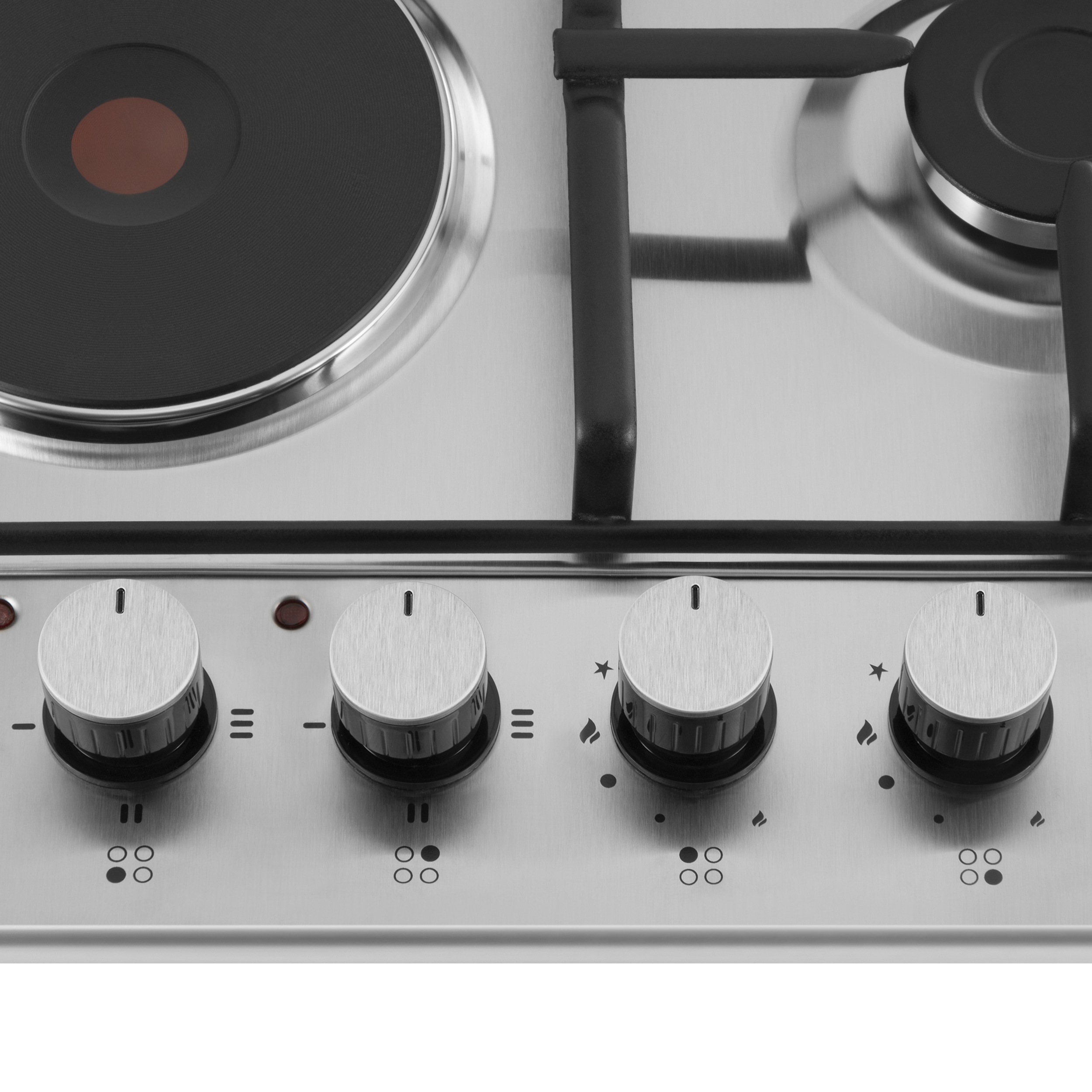 Включение электроконфорок, подача газа и электроподжиг производится с помощью поворотных цельнометаллических ручек, расположенных сбоку панели. Около каждой ручки есть пиктограммы: используемая конфорка, конфорка выключена, электроподжиг, максимальная мощность и минимальная мощность.