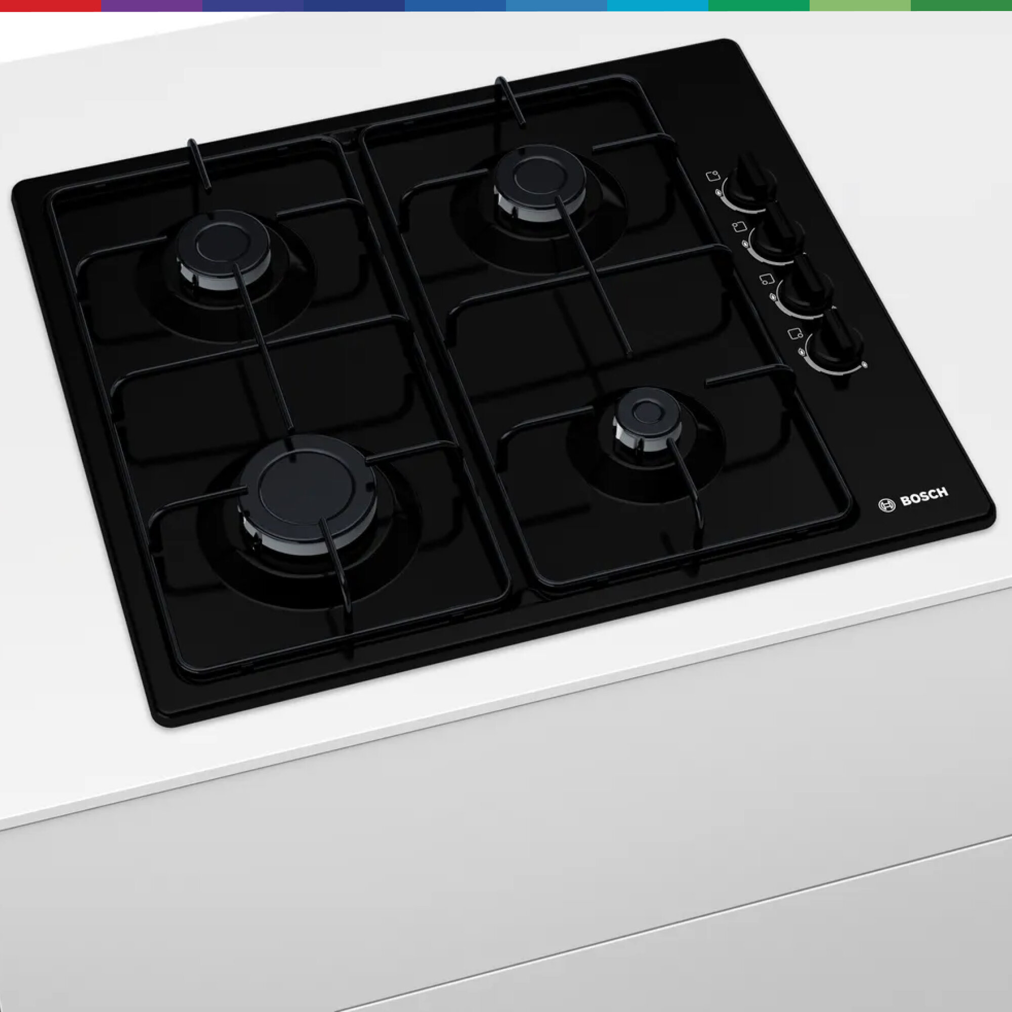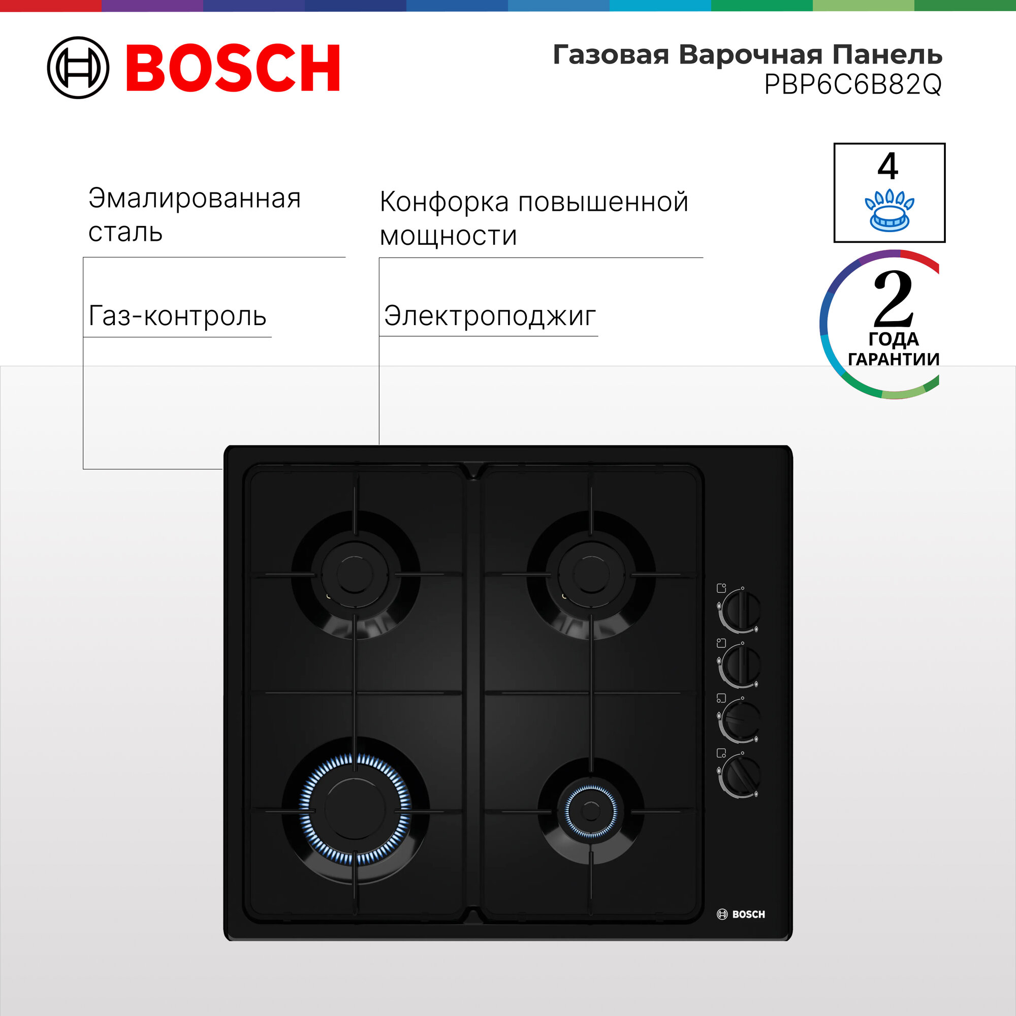 Варочная панель газовая Bosch PBP6C6B82Q, конфорок - 4 шт, электроподжиг, газ-контроль, черный