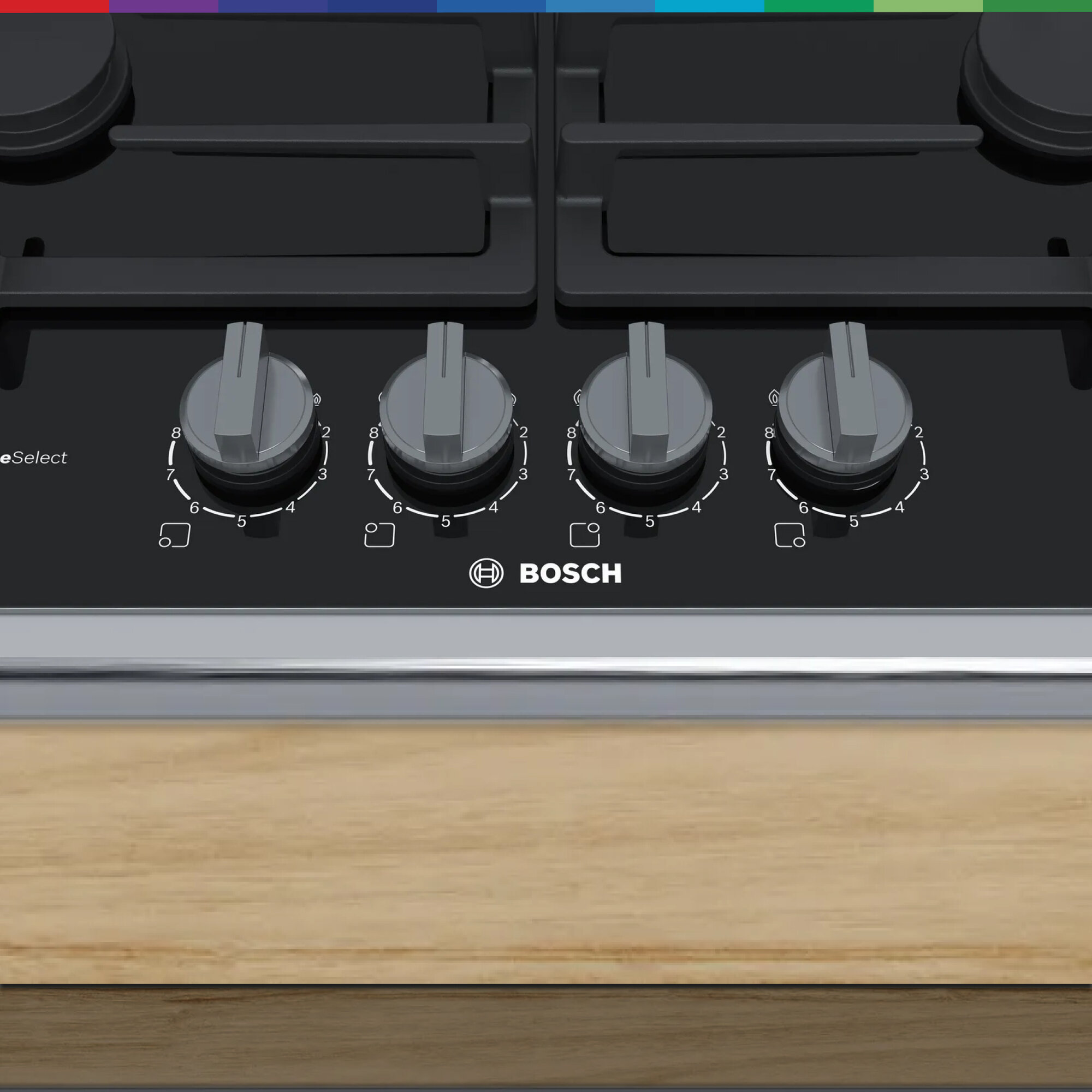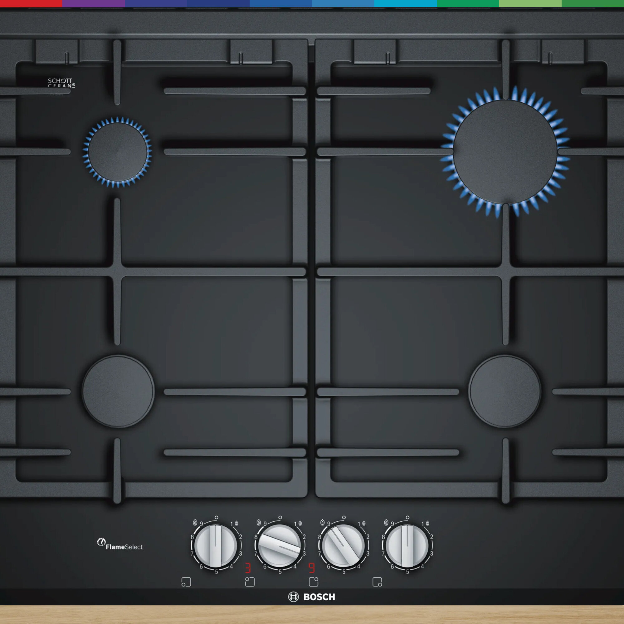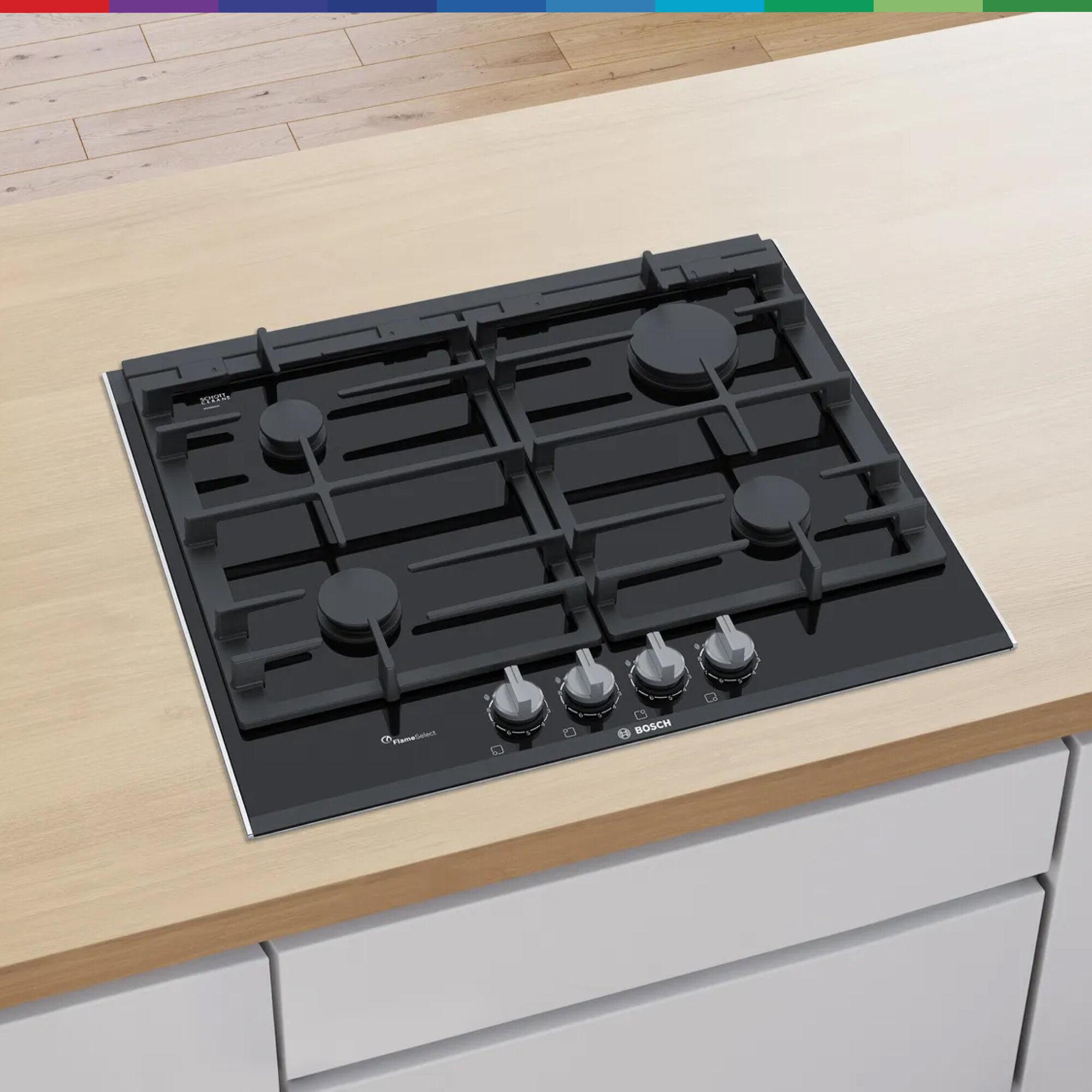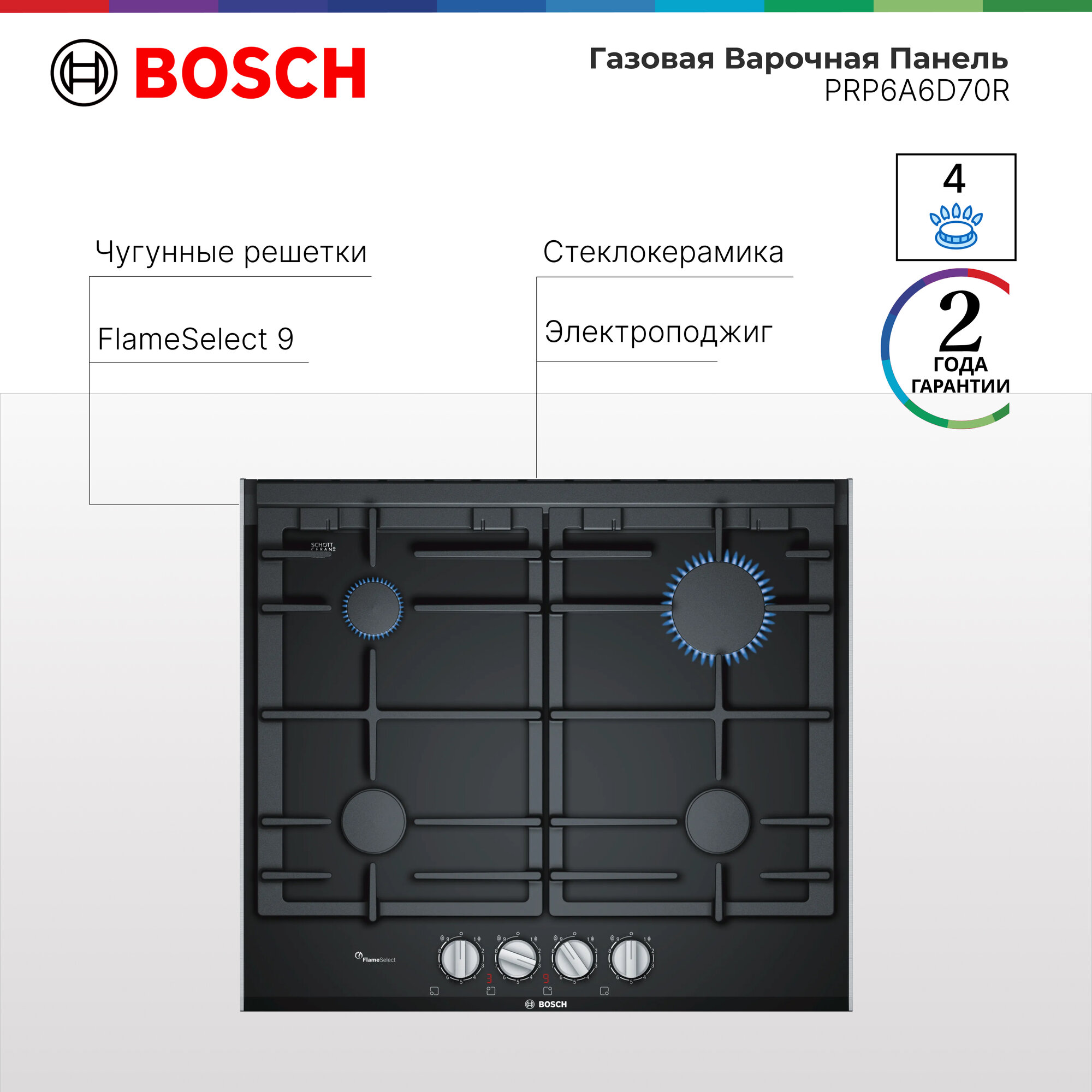 Варочная панель газовая Bosch PRP6A6D70R, конфорок - 4 шт, стеклокерамика, электроподжиг, газ-контроль, черный