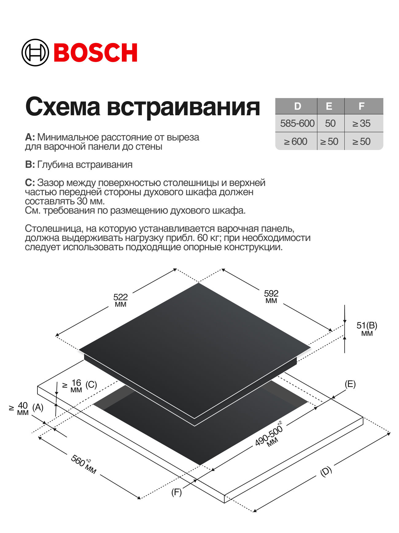 • Требуемый размер ниши для установки (ГxШxВ, мм): 51 x 560 x (490 - 500)