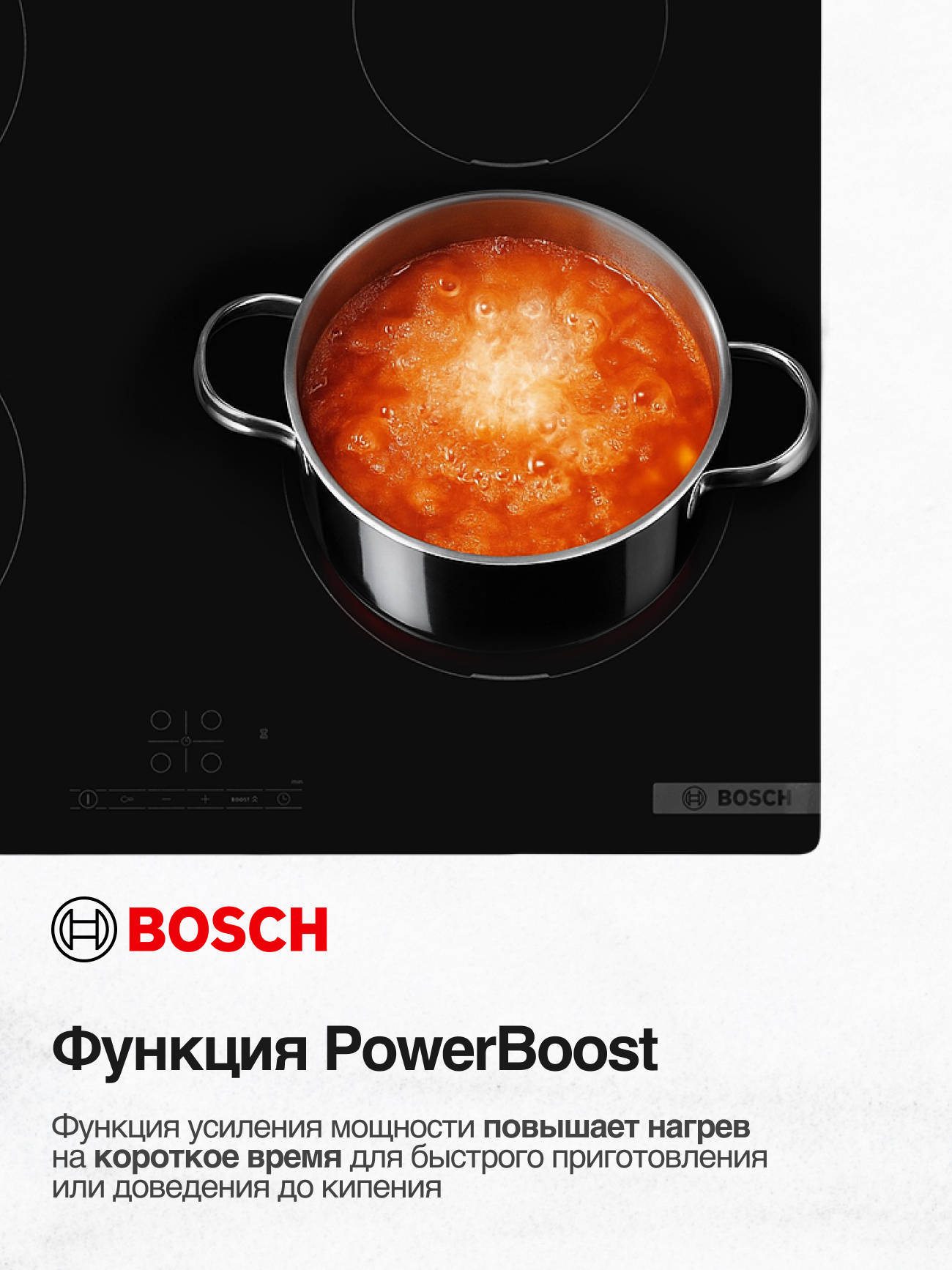 • Функция Power Boost для всех зон: быстрее кипятите воду благодаря повышенному на 50% уровню мощности по сравнению со стандартным уровнем.