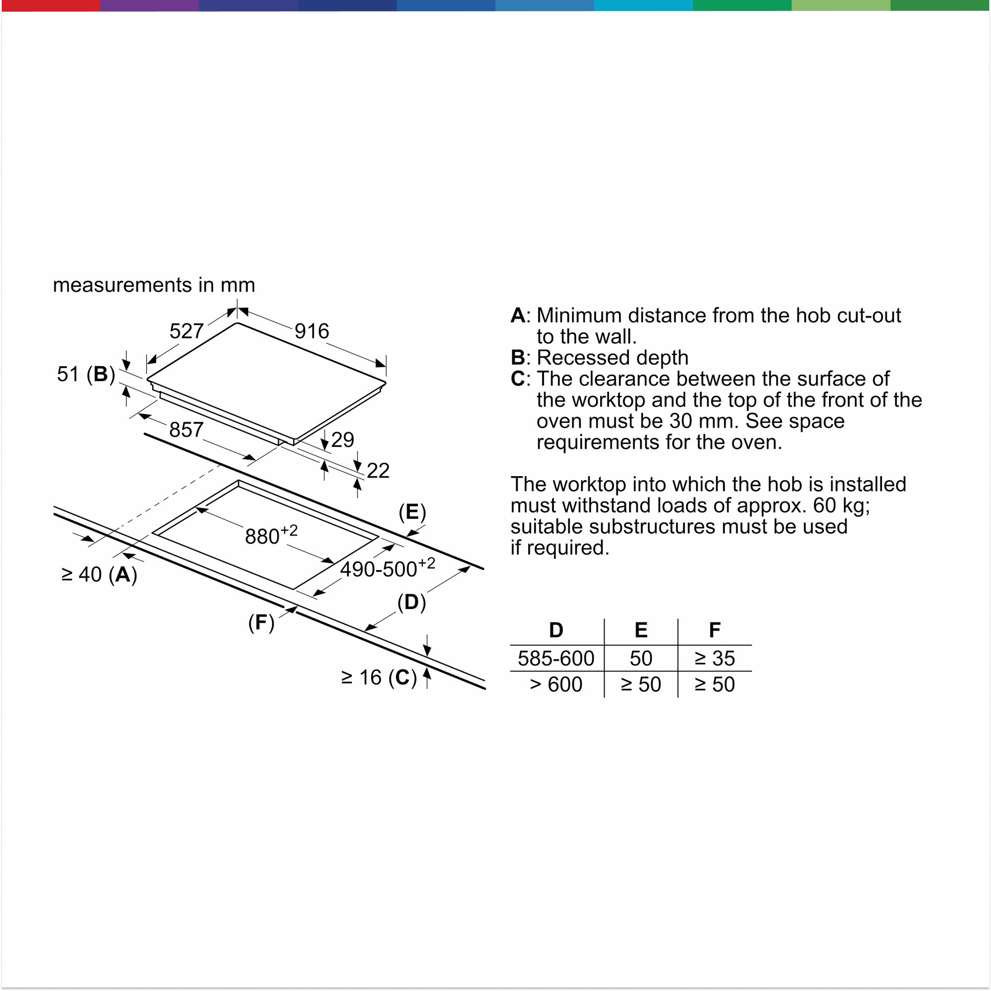 • Требуемый размер ниши для установки (ГxШxВ, мм): 51 x 880 x (490 - 500)