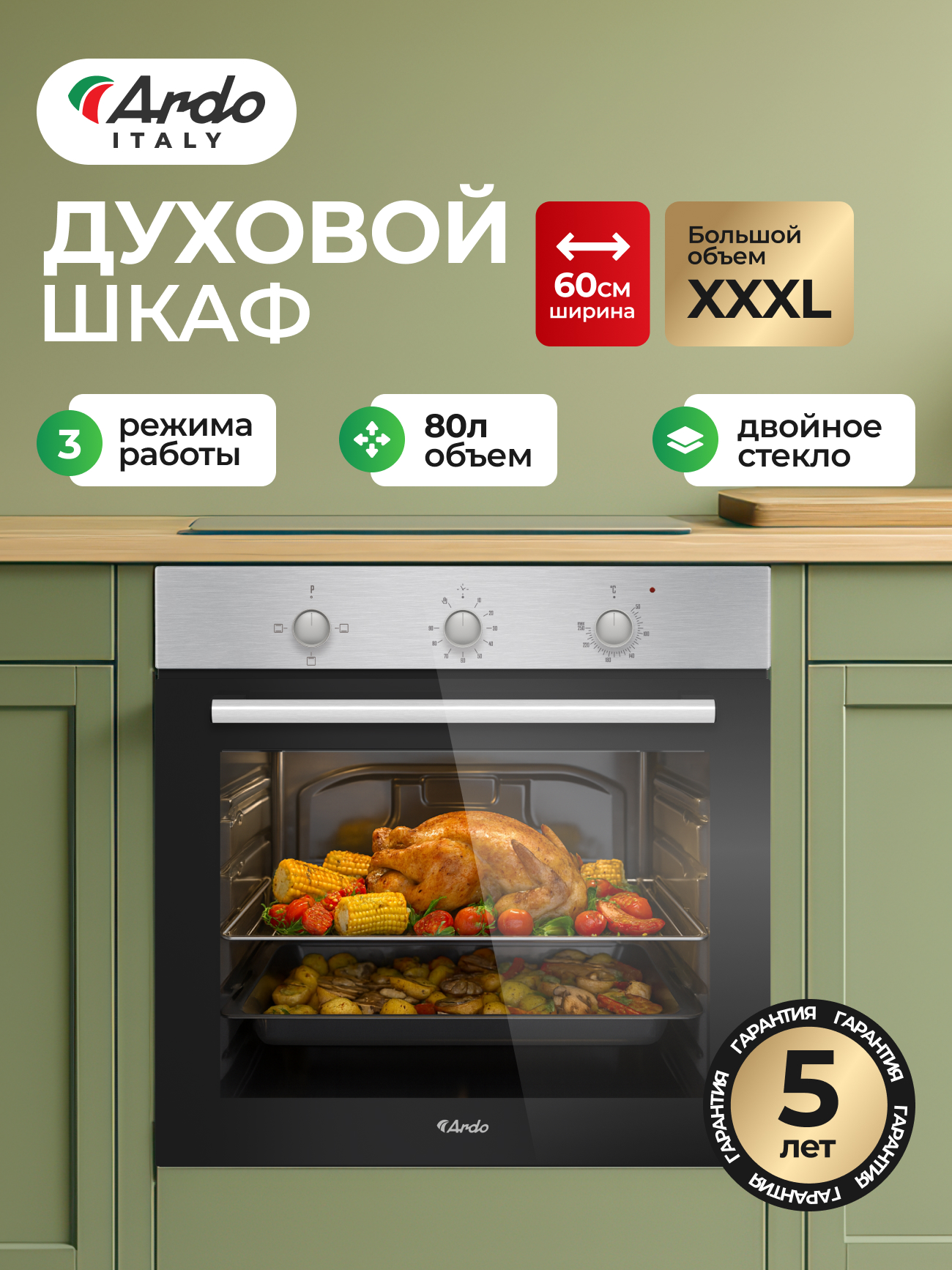 Духовой шкаф ARDO BO13X22, выполненный в едином с панелью стиле, станет надежным помощником. Его стандартные размеры (ширина 60 см) позволяют легко встроить технику. А благодаря расширенной гарантии 5 лет на весь комплект, вы инвестируете в долговечное и качественное решение для дома.