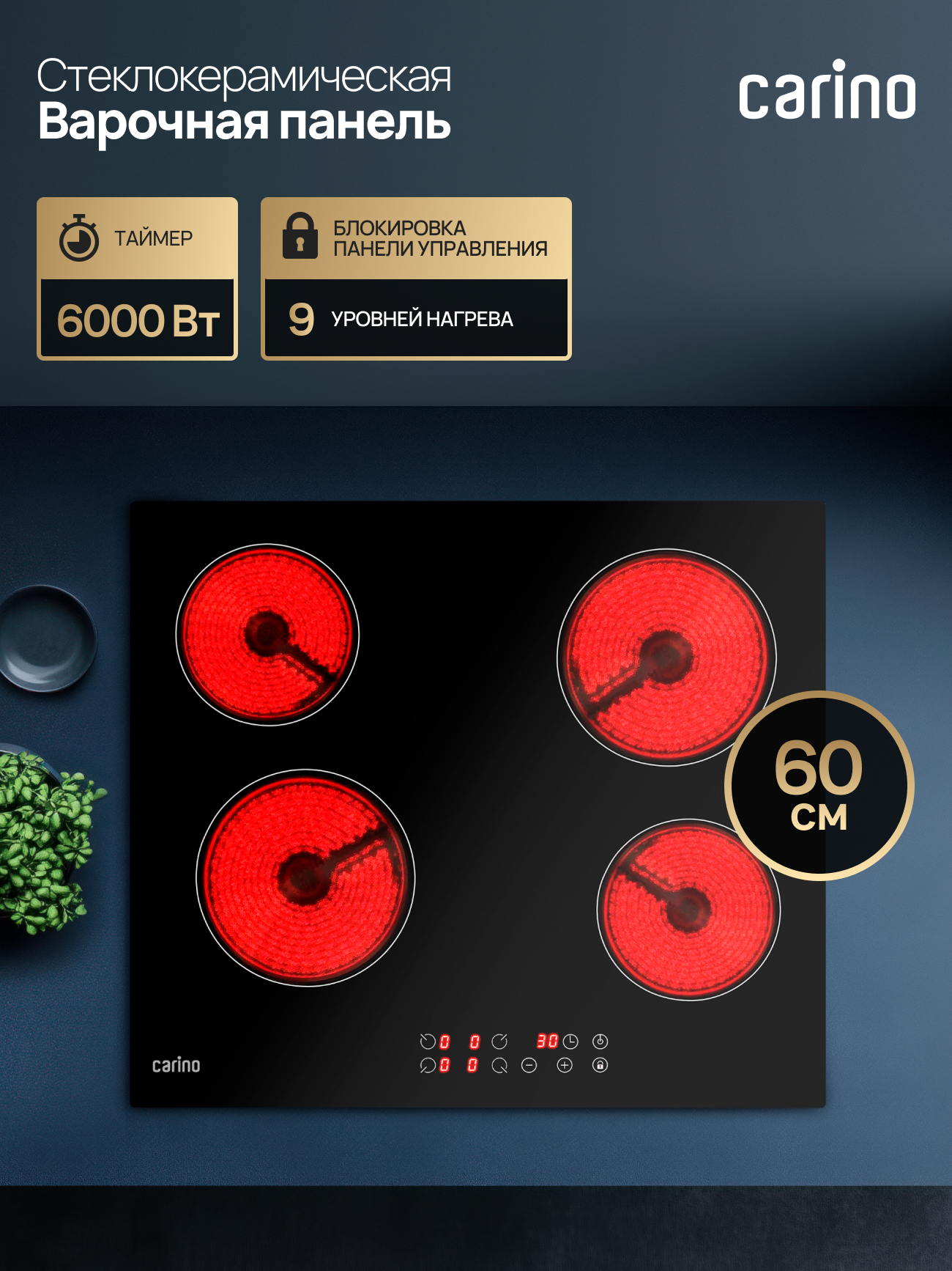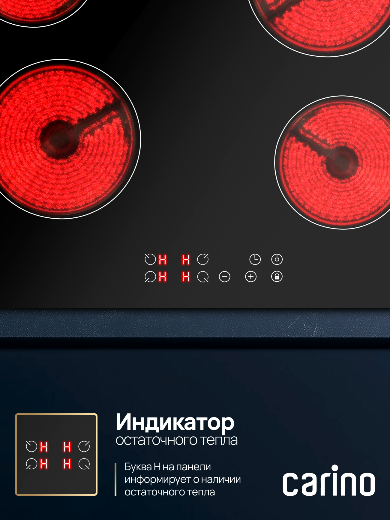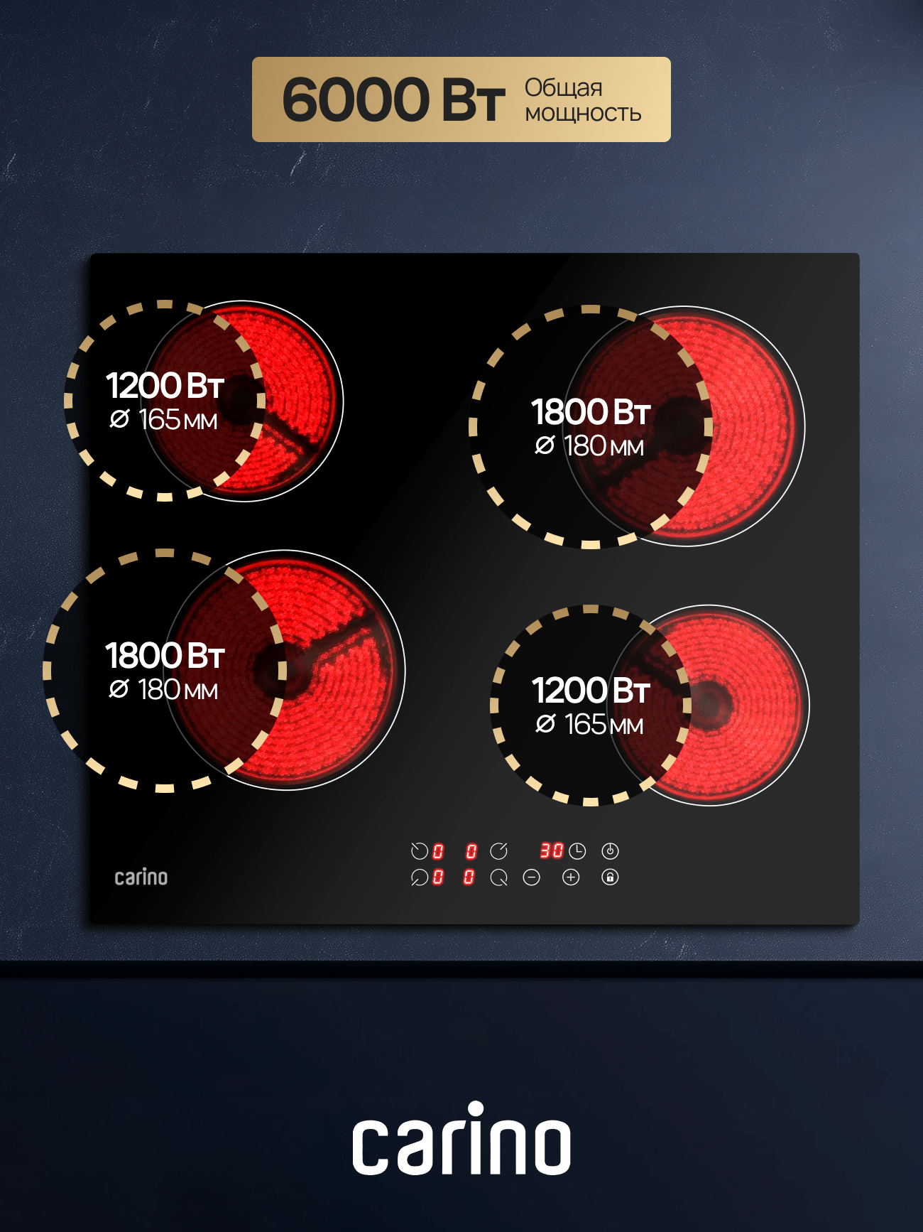 Электрическая варочная панель CARINO CH60D14B011 — это воплощение стиля и удобства. Четыре конфорки Hi-Light с быстрым нагревом и гибкой регулировкой мощности обеспечат идеальный температурный контроль для любого рецепта. Гладкая стеклокерамическая поверхность не только выглядит безупречно, но и невероятно практична: за ней легко ухаживать, а благодаря индикаторам остаточного тепла вы всегда в безопасности. Больше никаких открытого огня или газа — только чистая эффективность.