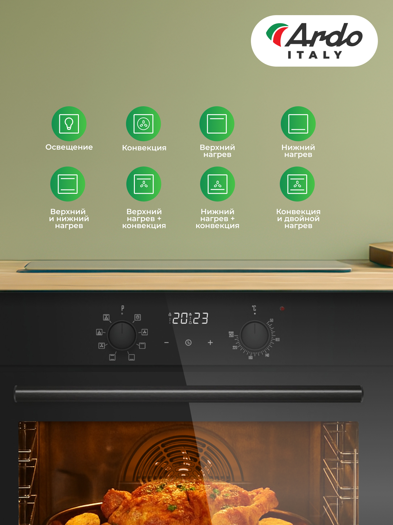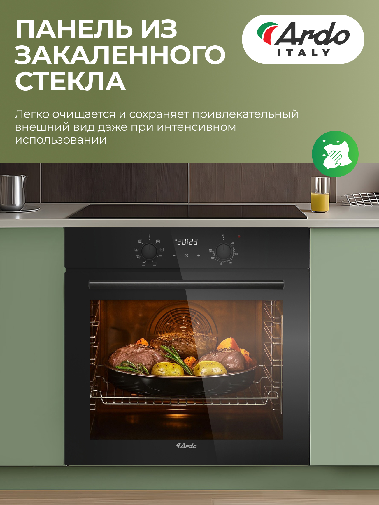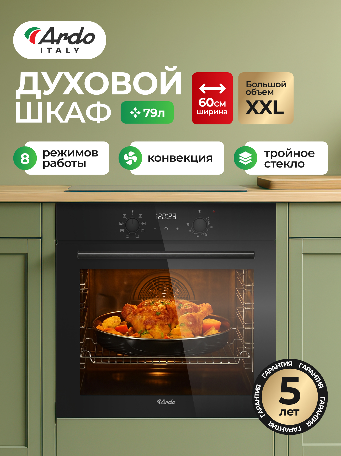 Духовой шкаф ARDO BO18EB2 с электрическим грилем и конвекцией станет вашим главным помощником. Циркуляция горячего воздуха обеспечивает идеально равномерное приготовление блюд на всех уровнях, позволяя запекать, сушить или размораживать с профессиональным результатом. Эмалированная камера Easy Clean и съемные дверные стекла делают уход минимальным. Вместе устройства создают гармоничную и мощную кухонную станцию, подкрепленную расширенной гарантией 5 лет на весь комплект.