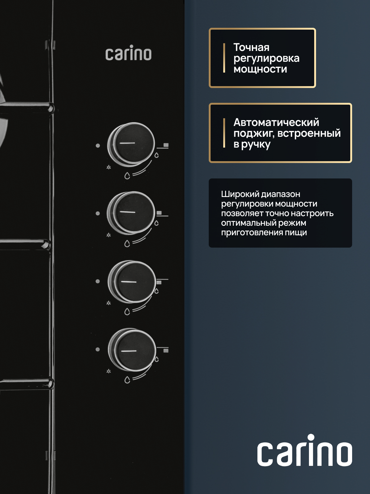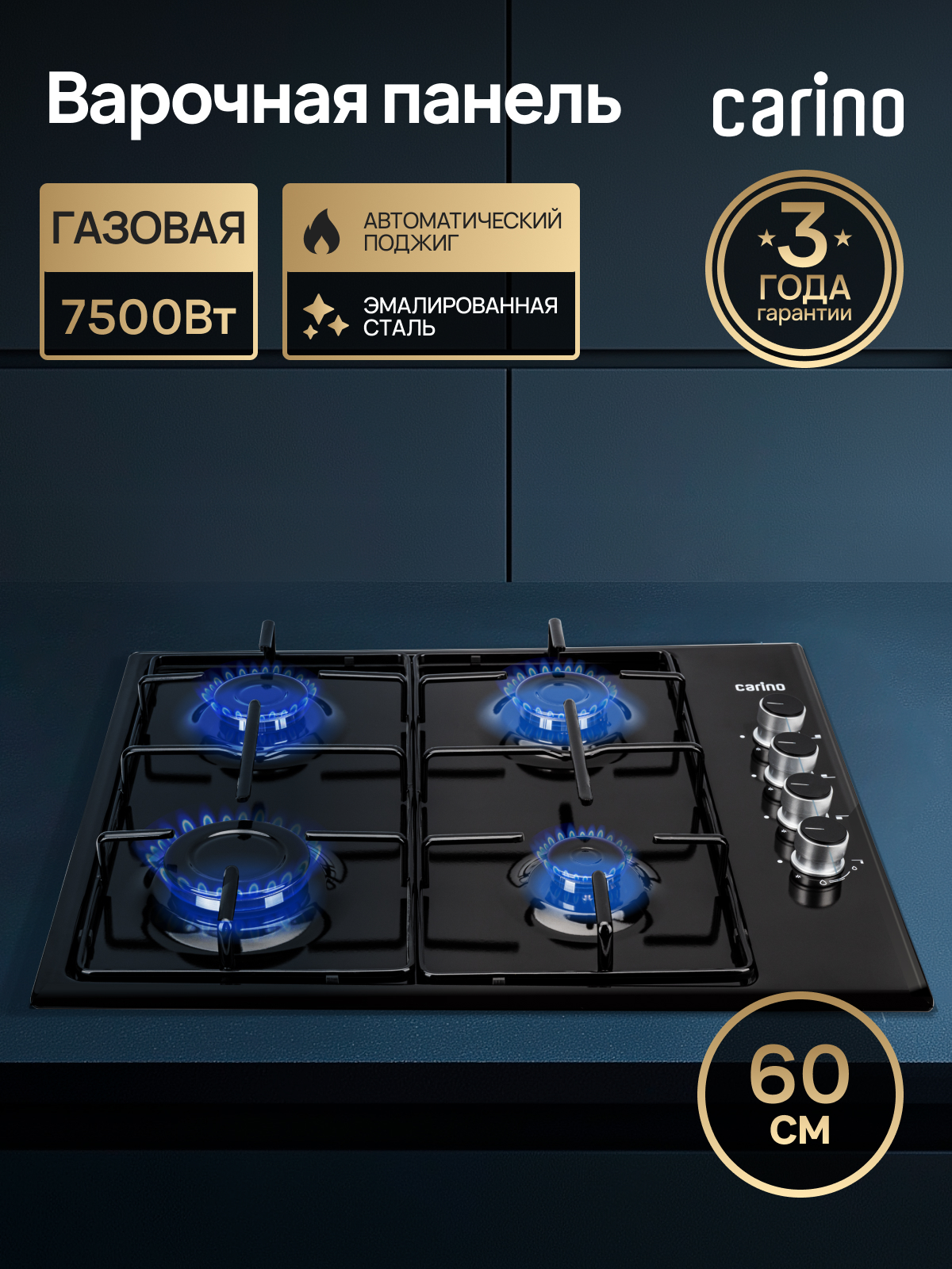 Варочная панель CARINO CH60Q40B401 дарит вам мгновенный отклик и точное пламя. Четыре конфорки разного диаметра и мощности (от 1 до 3 кВт) справятся как с быстрым кипячением, так и с деликатным томлением.