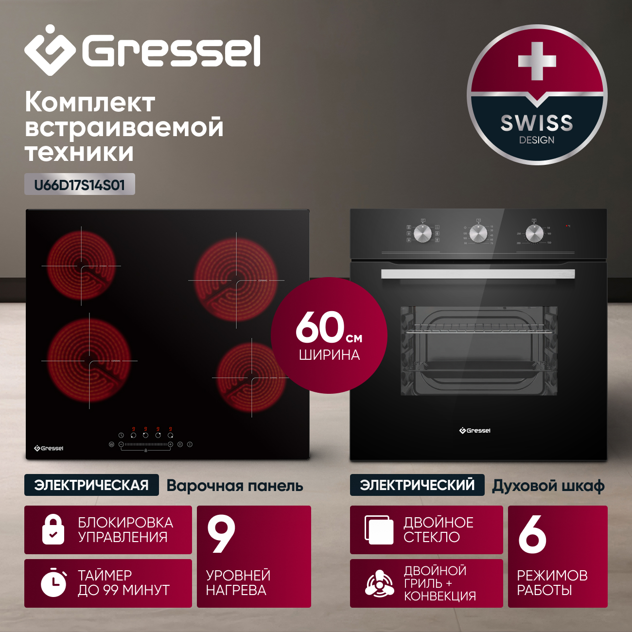 Комплект бытовой техники GRESSEL U66D17S14S01 (духовой шкаф 60см и варочная панель стеклокерамическая 60см)