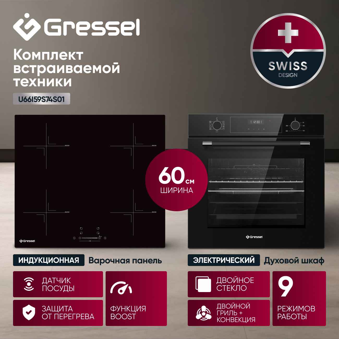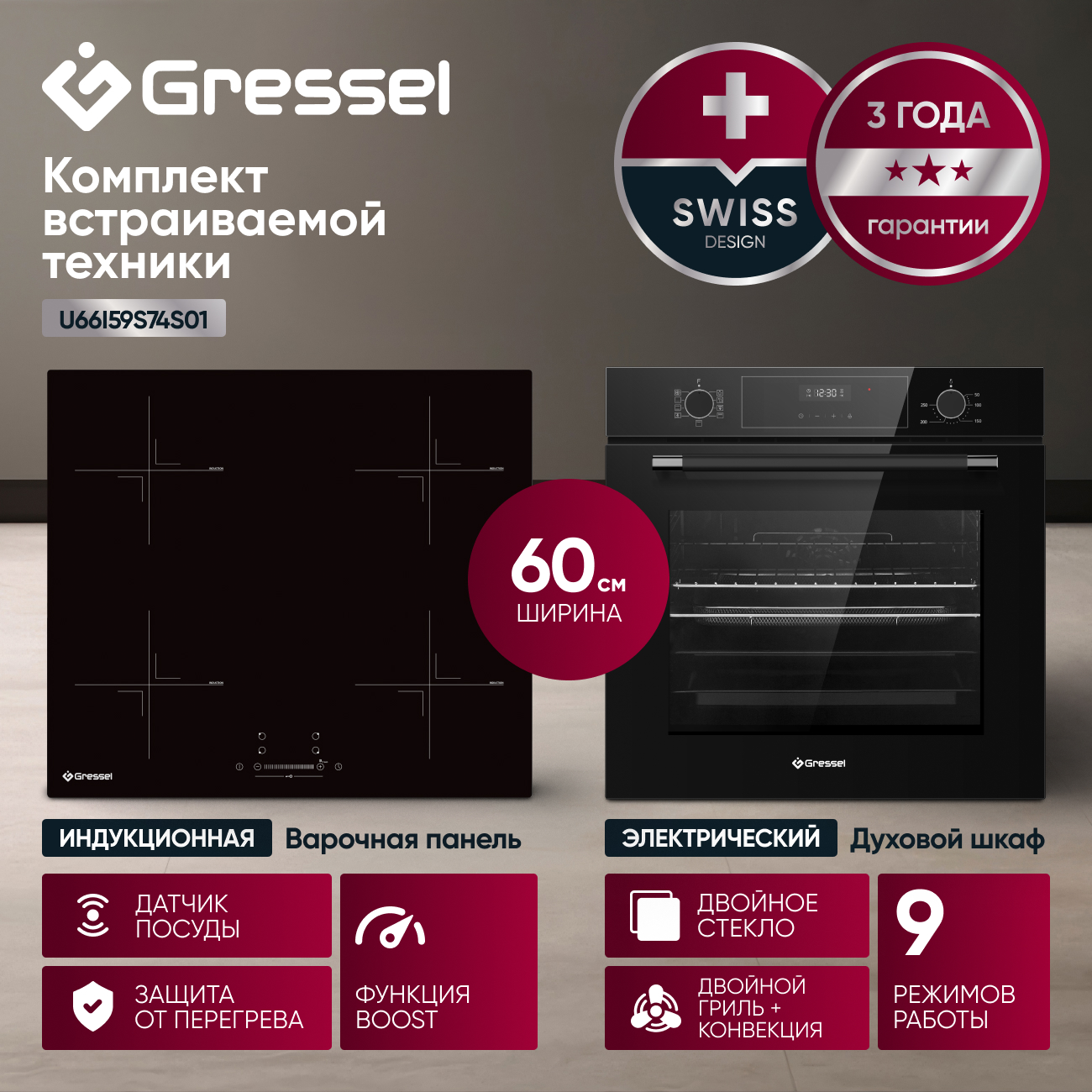 Комплект бытовой техники GRESSEL U66I59S74S01 (духовой шкаф 60см и варочная панель индукционная 60см)